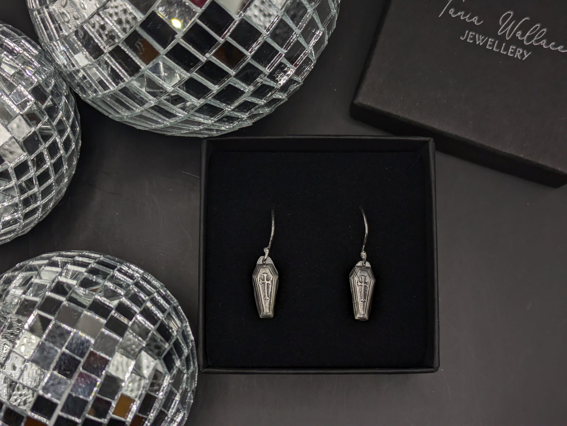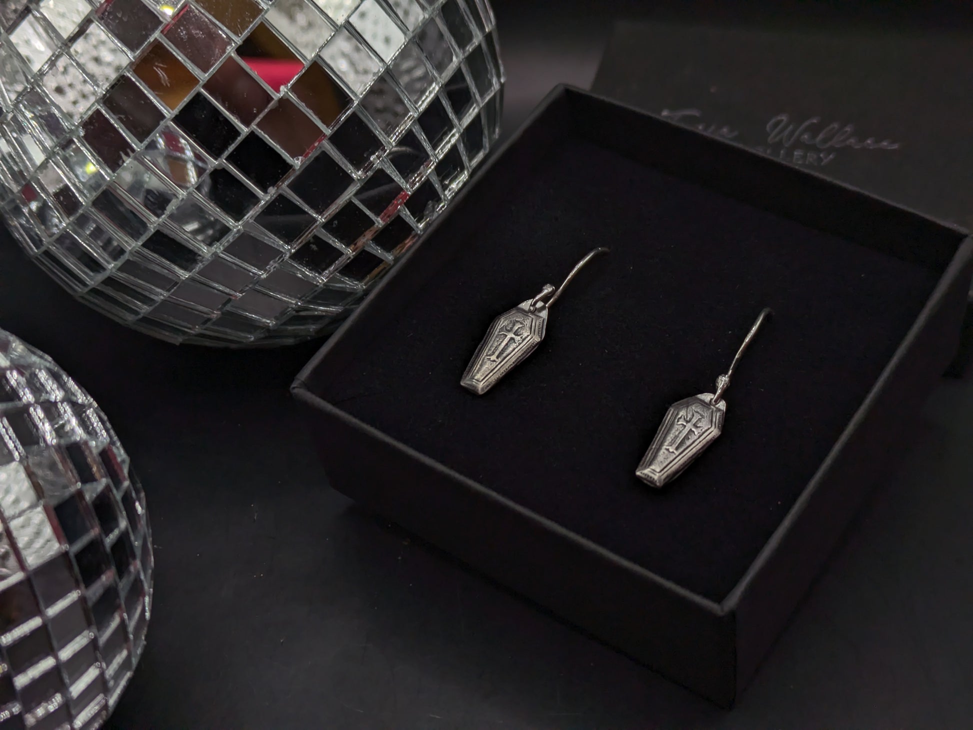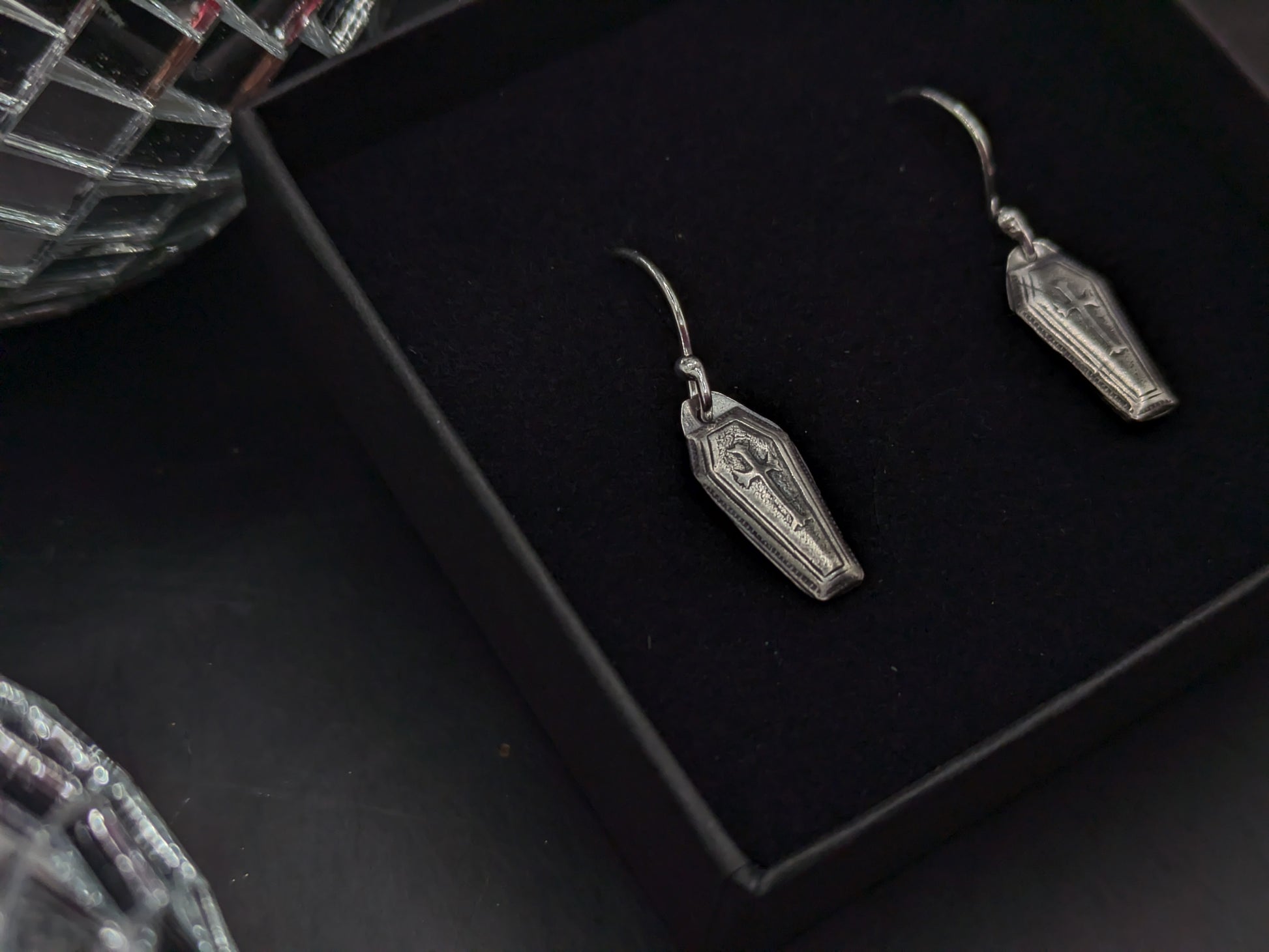 3d sterling silver coffin drop earrings on handmade sterling silver hooks.