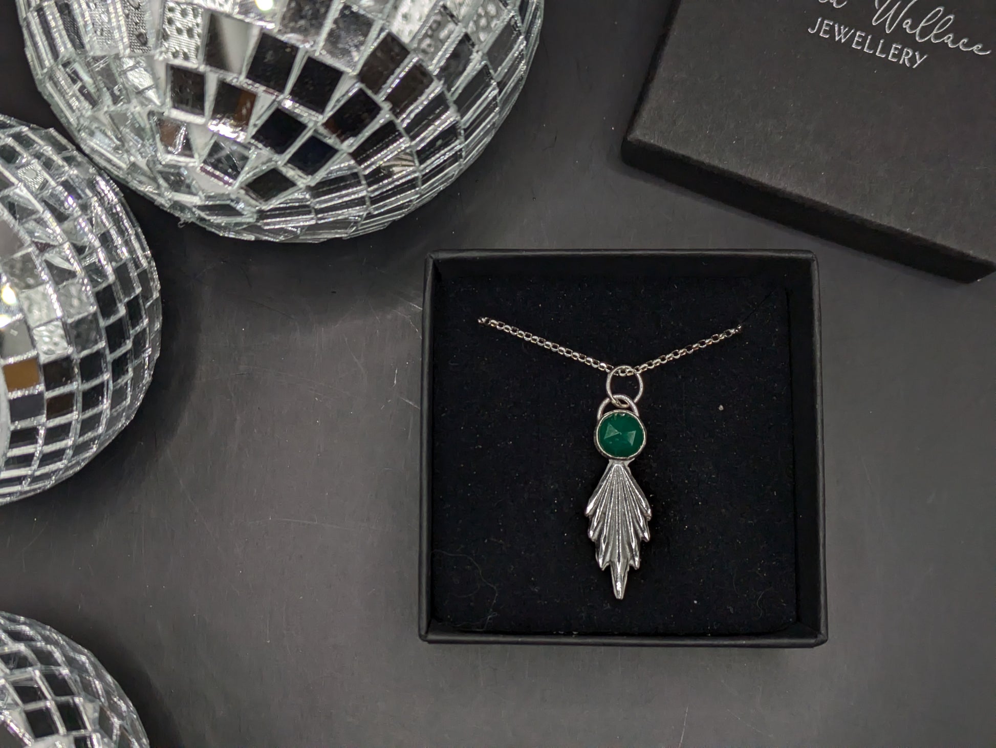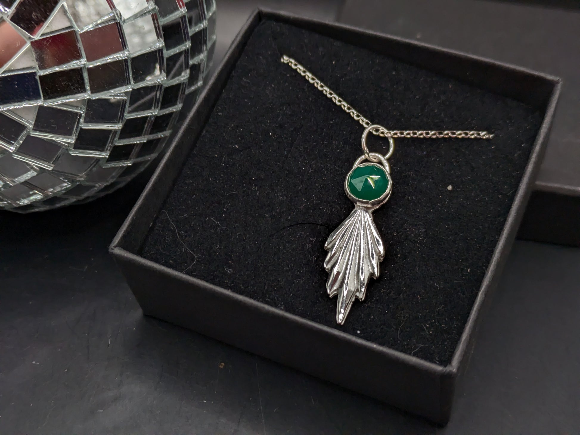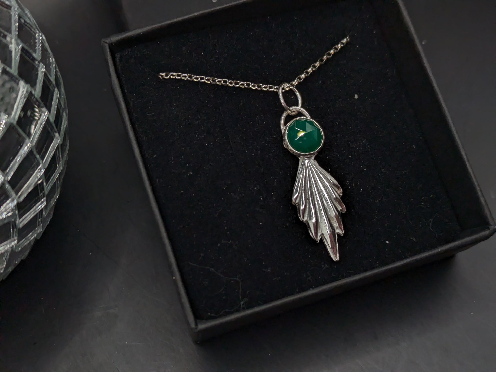 I have hand pressed this 3d sterling silver fan pendant and topped with with a large 8mm rose cut green agate stone which has been ethically sourced.