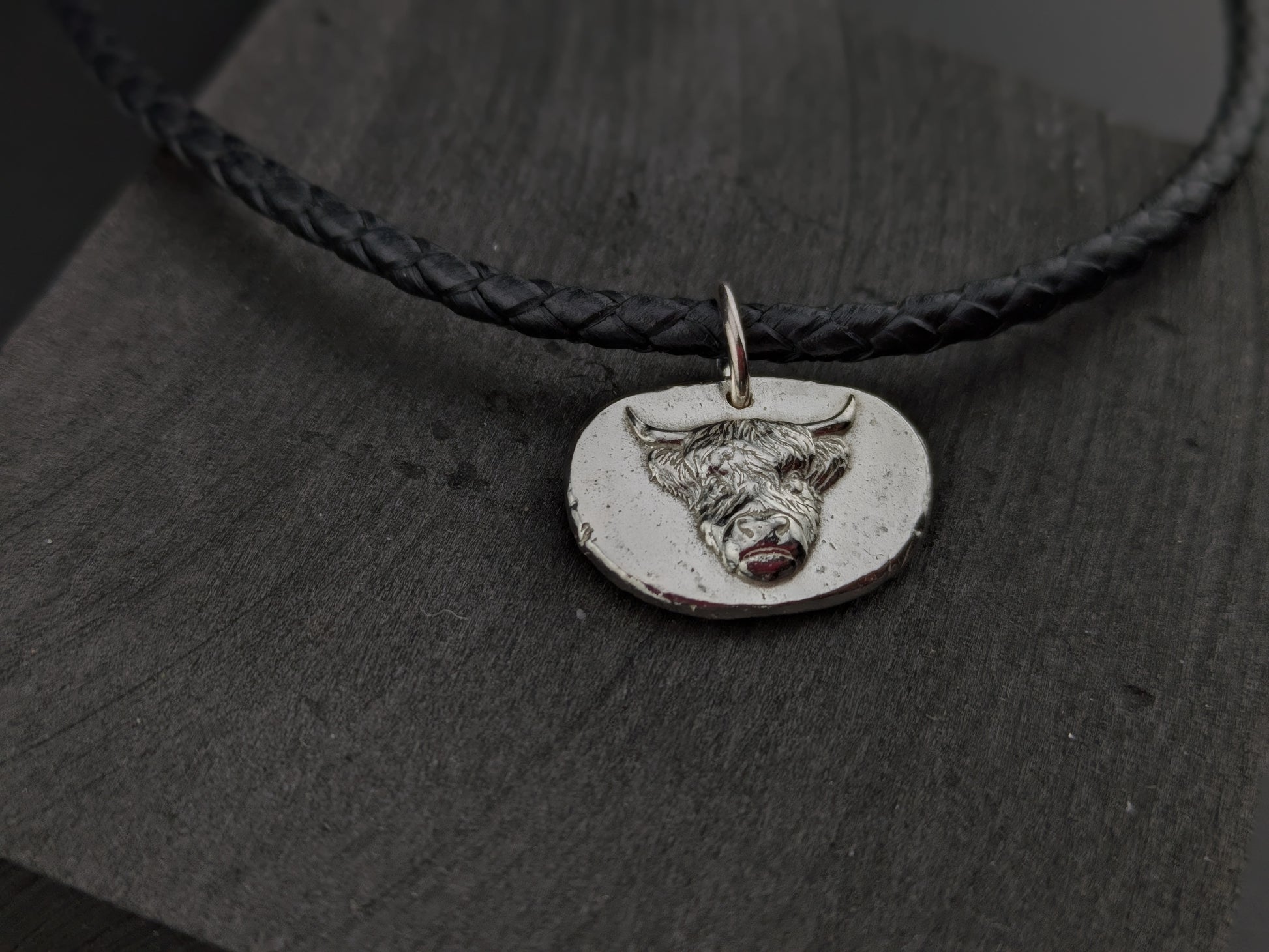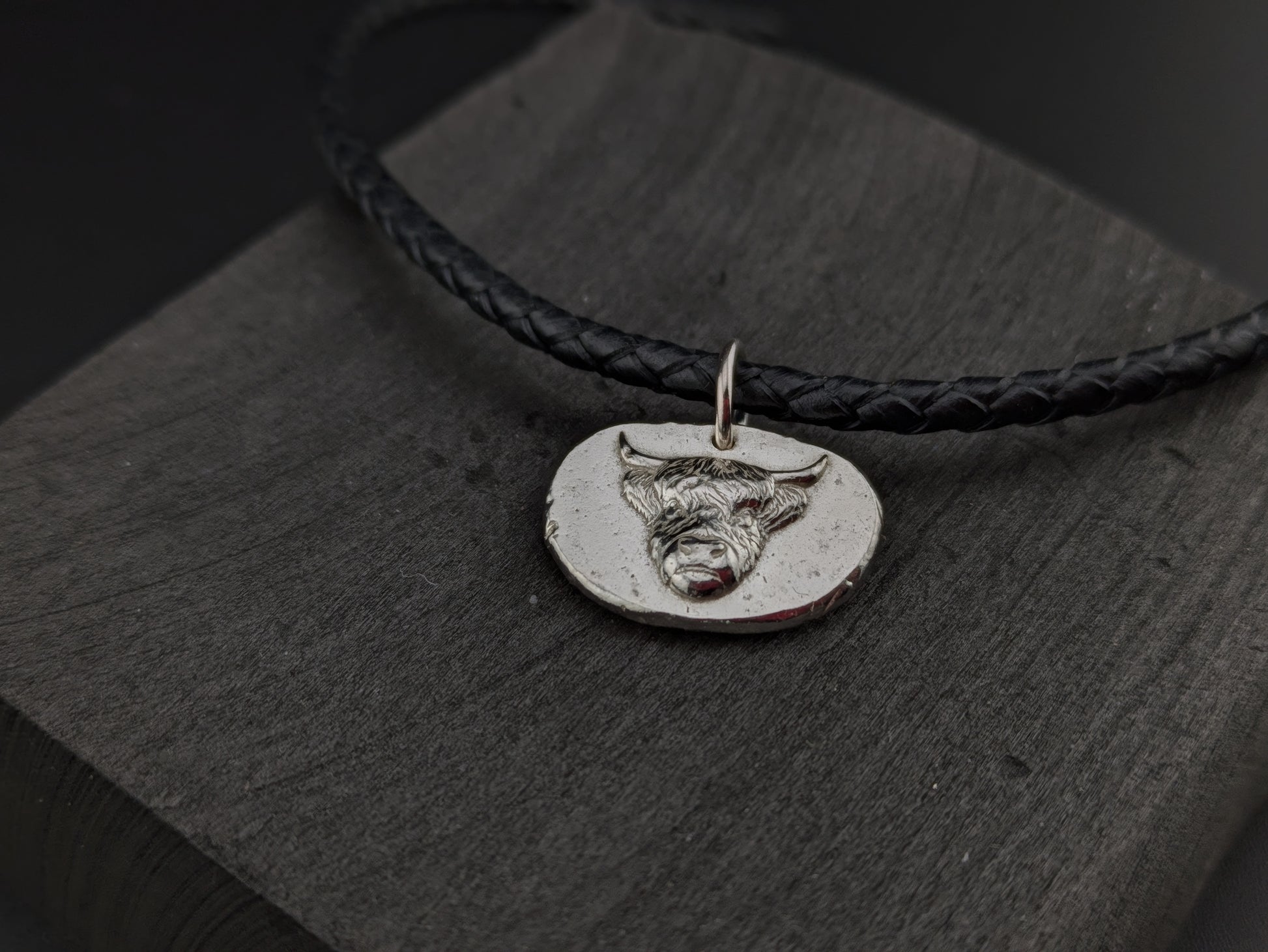 Solid silver highland cow design pressed pendant. This cow is pressed by hand them finished off to a high shine.
