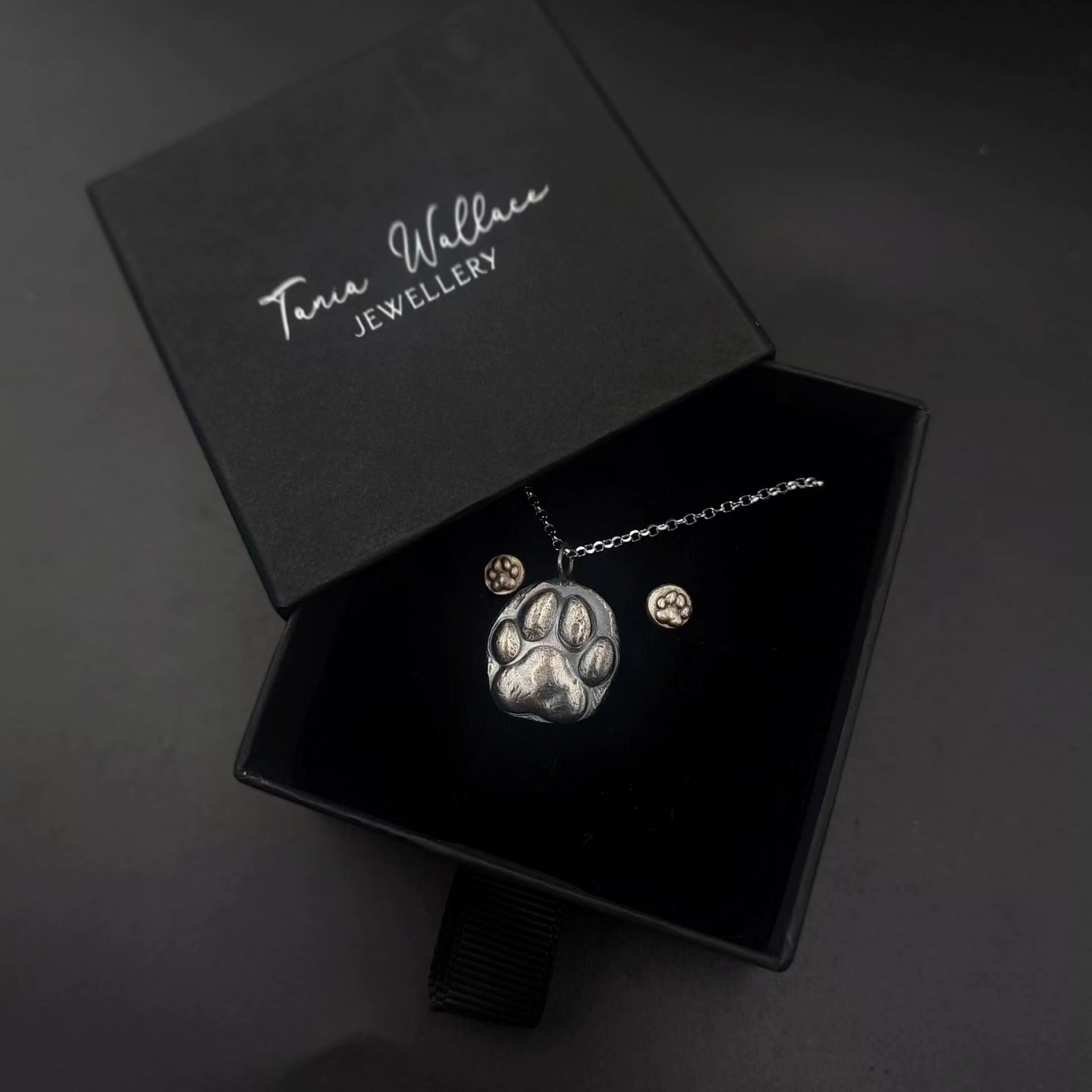 Solid silver pendant and studs with an impression of a paw print! I have pressed the silver by hand and oxidised it to highlight the detail of the pawprint.