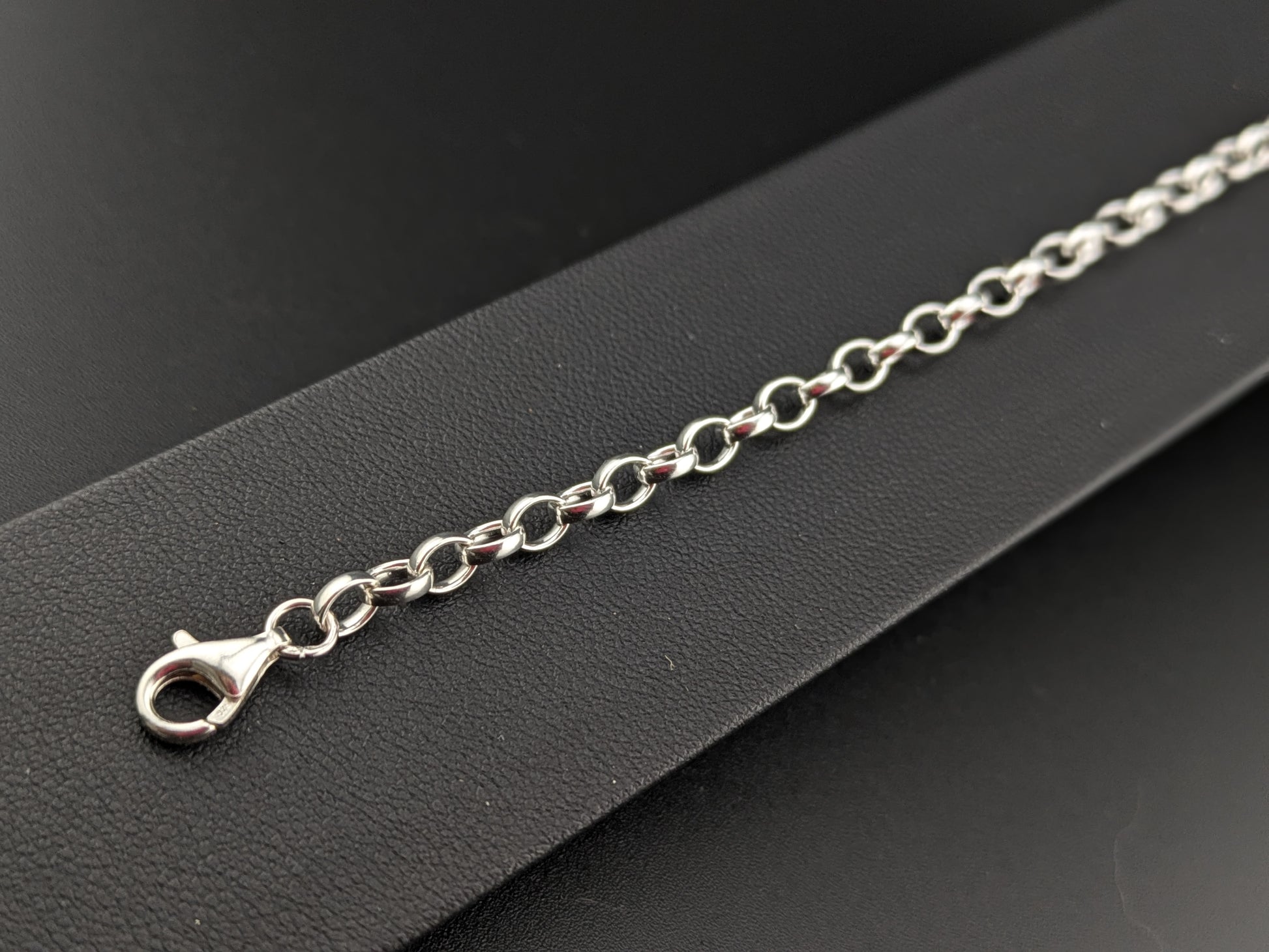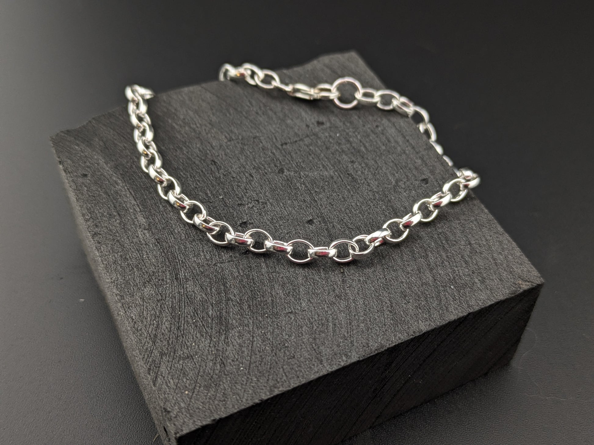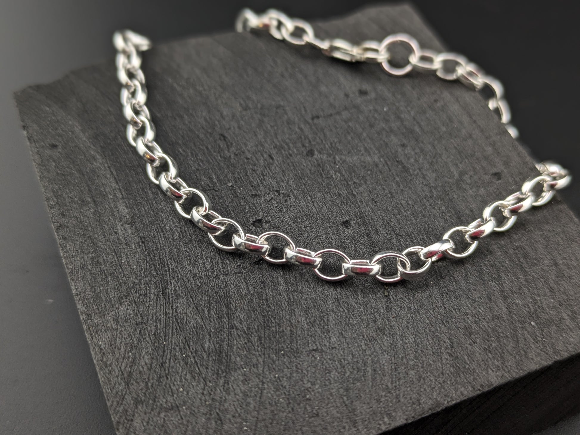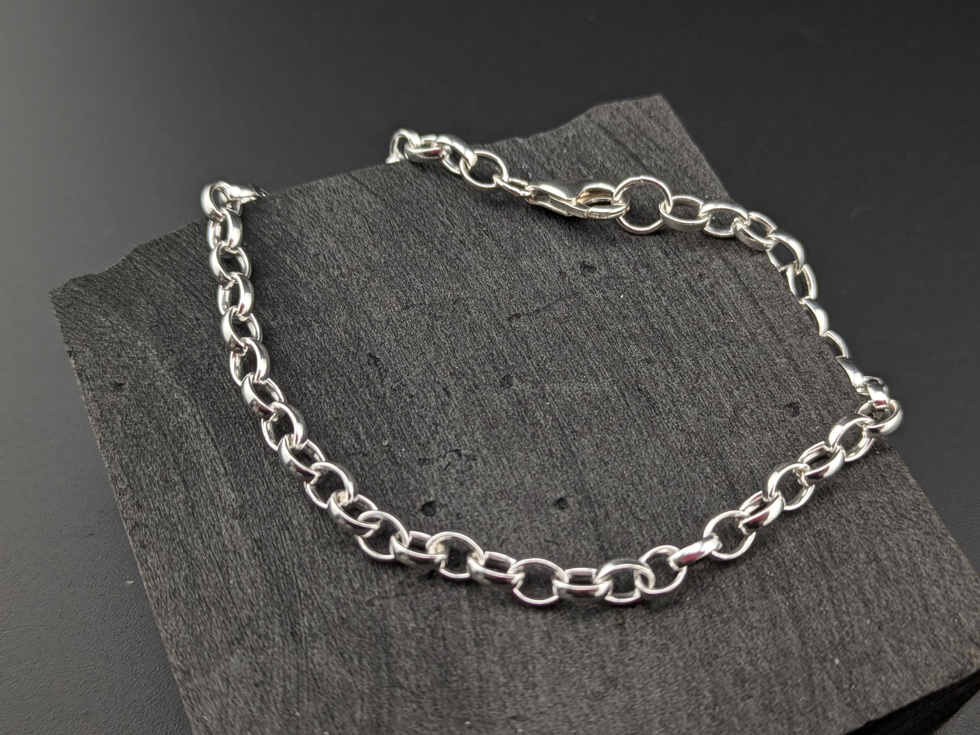 4.3 mm oval shaped sterling silver belcher chain bracelet with solid silver clasp.