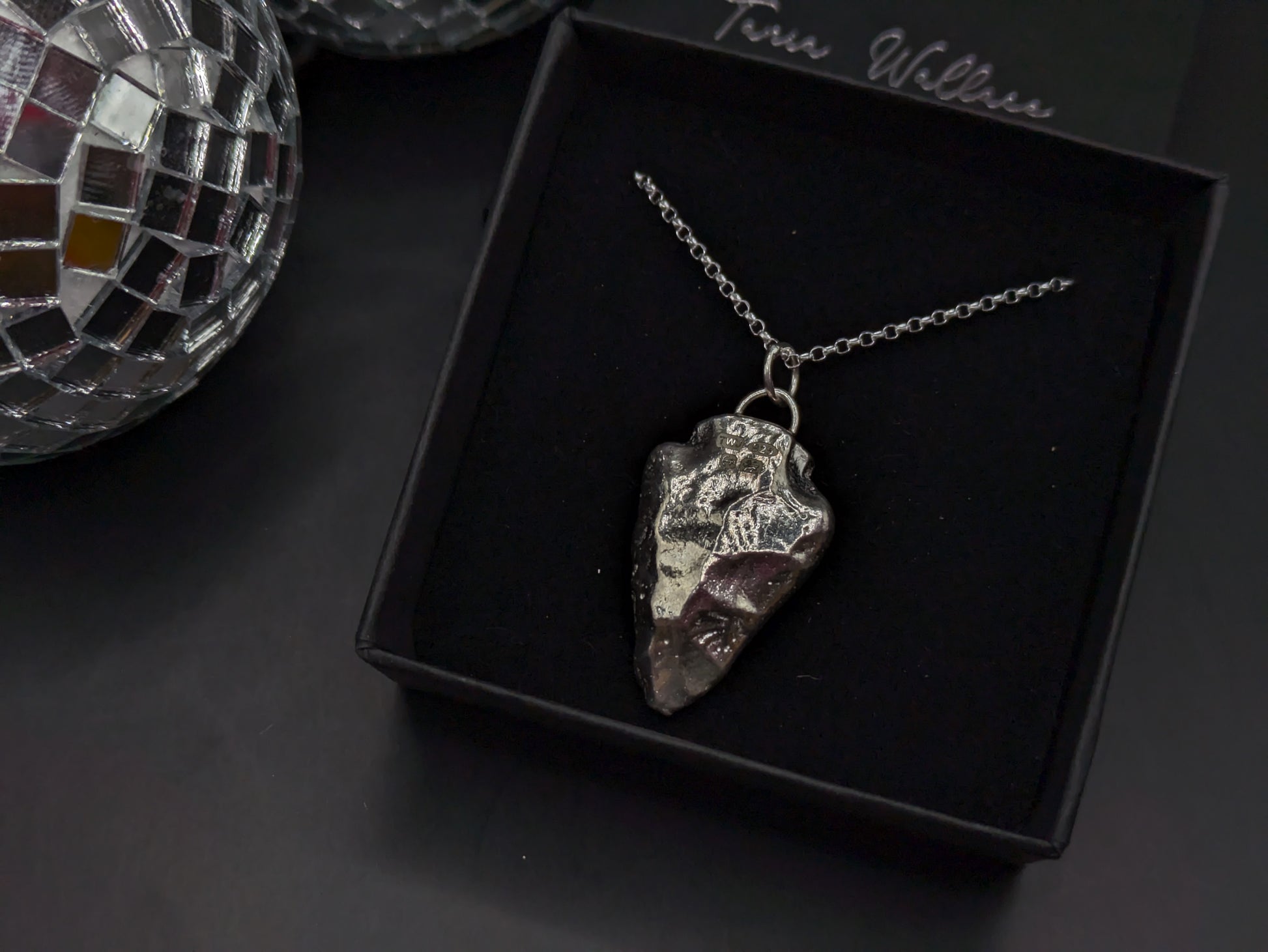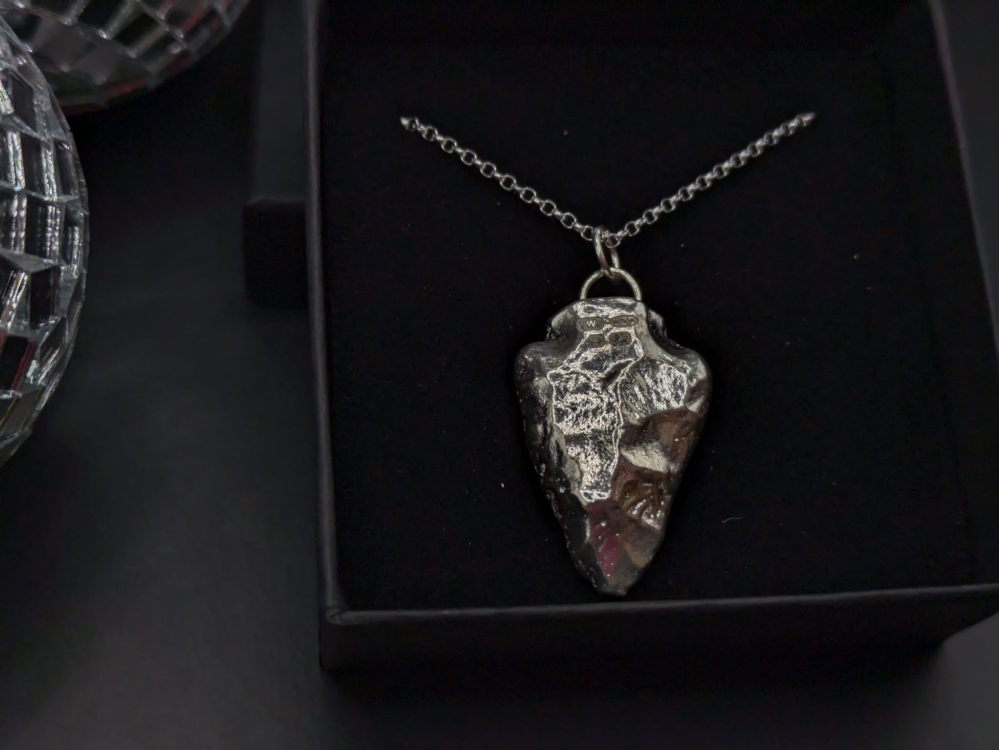 Sand cast arrow head which I've added a single hoop for the chain. It's solid silver made from recycled sterling silver and has been hallmarked with my signature TWJ laser hallmark.