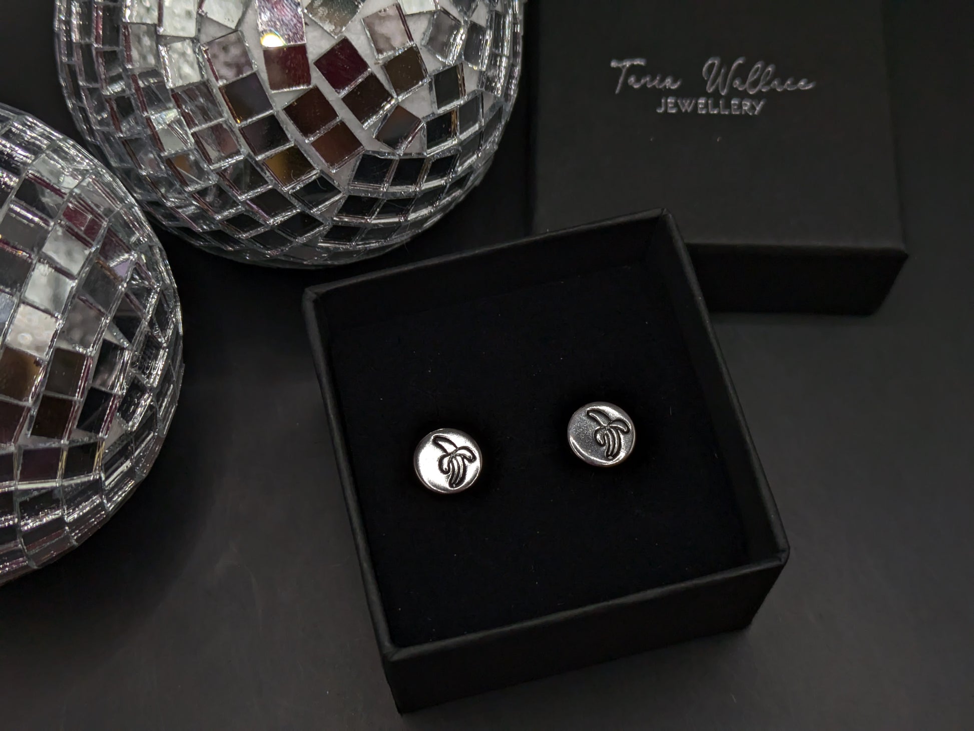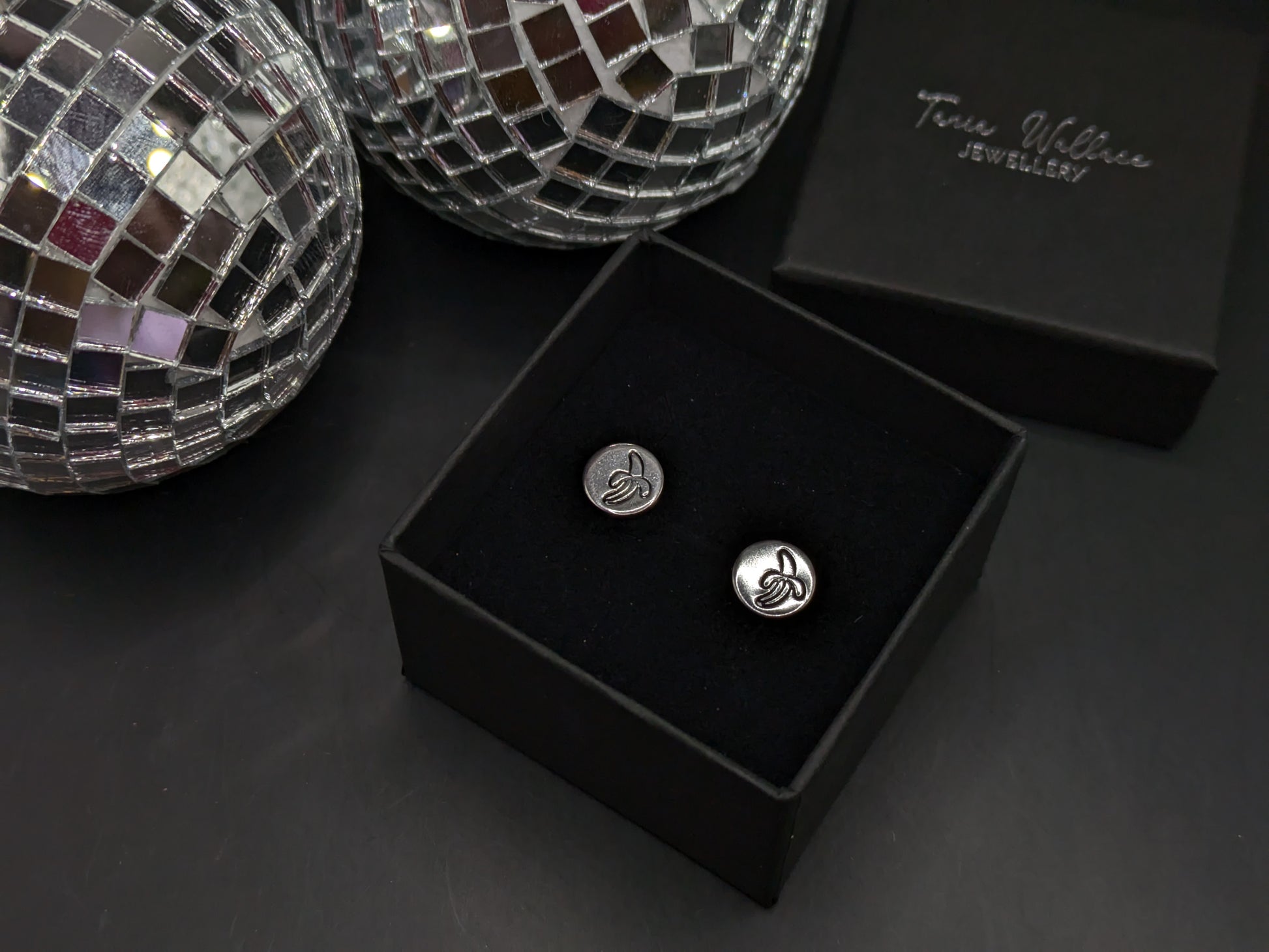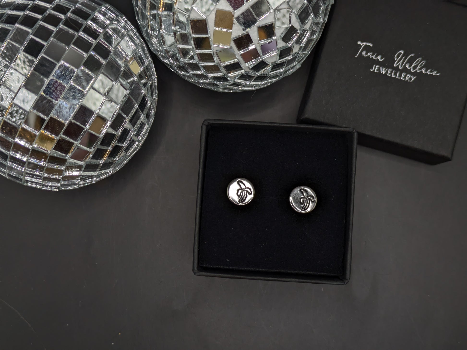 Banana patterned sterling silver disc studs made from recycled sterling silver and hand punched with a banana pattern and darkened with enamel.