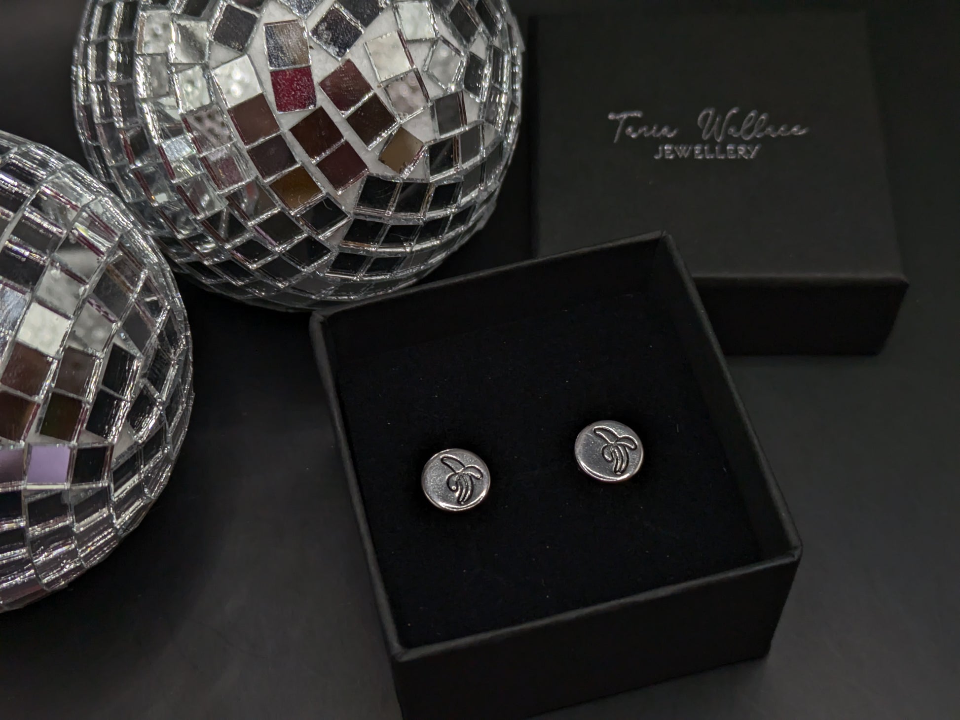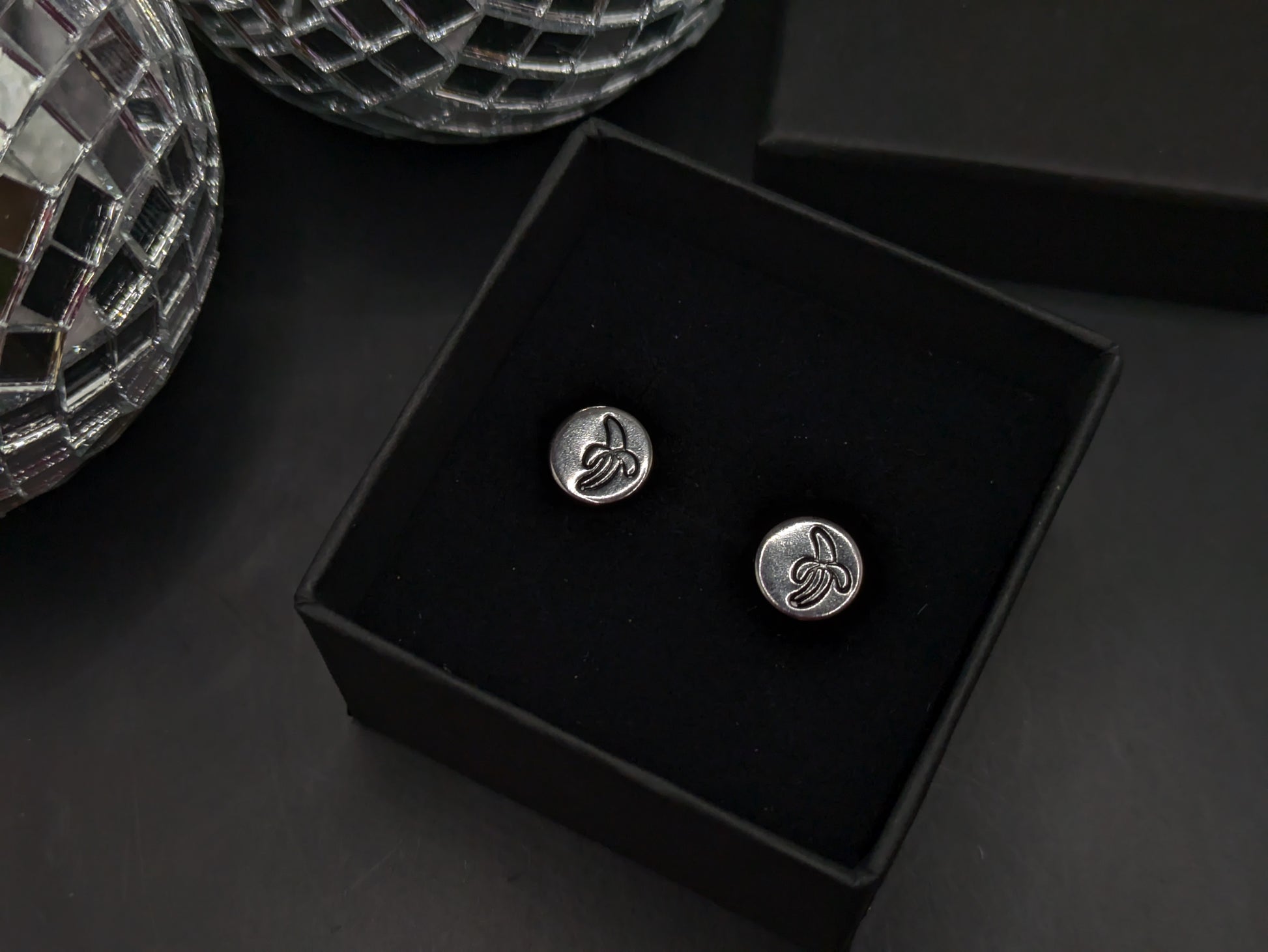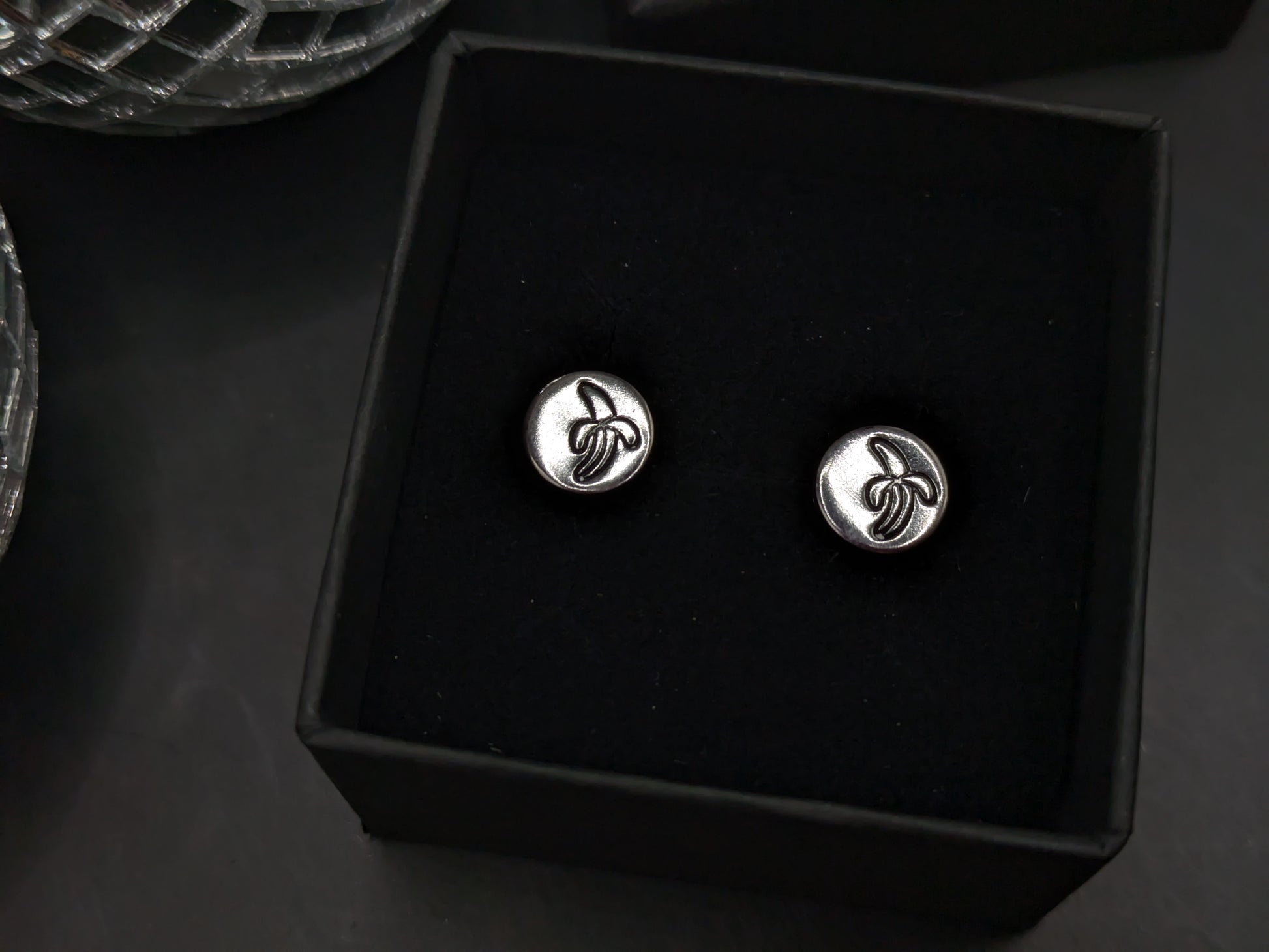 Banana patterned sterling silver disc studs made from recycled sterling silver and hand punched with a banana pattern and darkened with enamel.