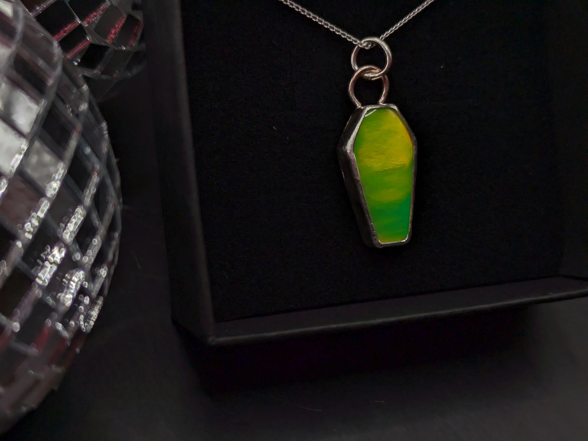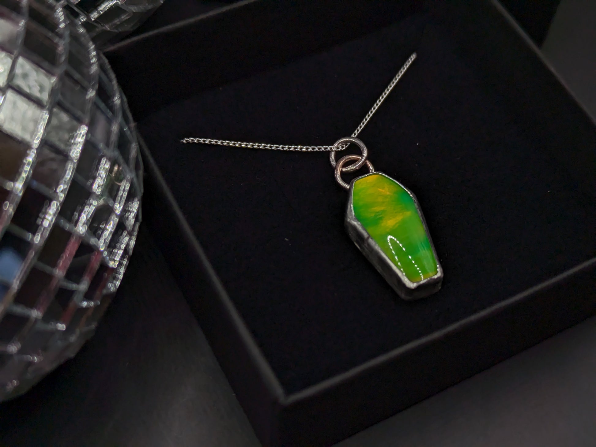Stunning coffin shaped pendant made from a shocking iridescent green aurora opal which I've set into sterling silver.