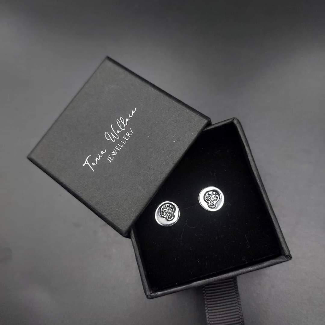 Little sterling silver disc studs approximately 1cm wide with darkened candy skull design.