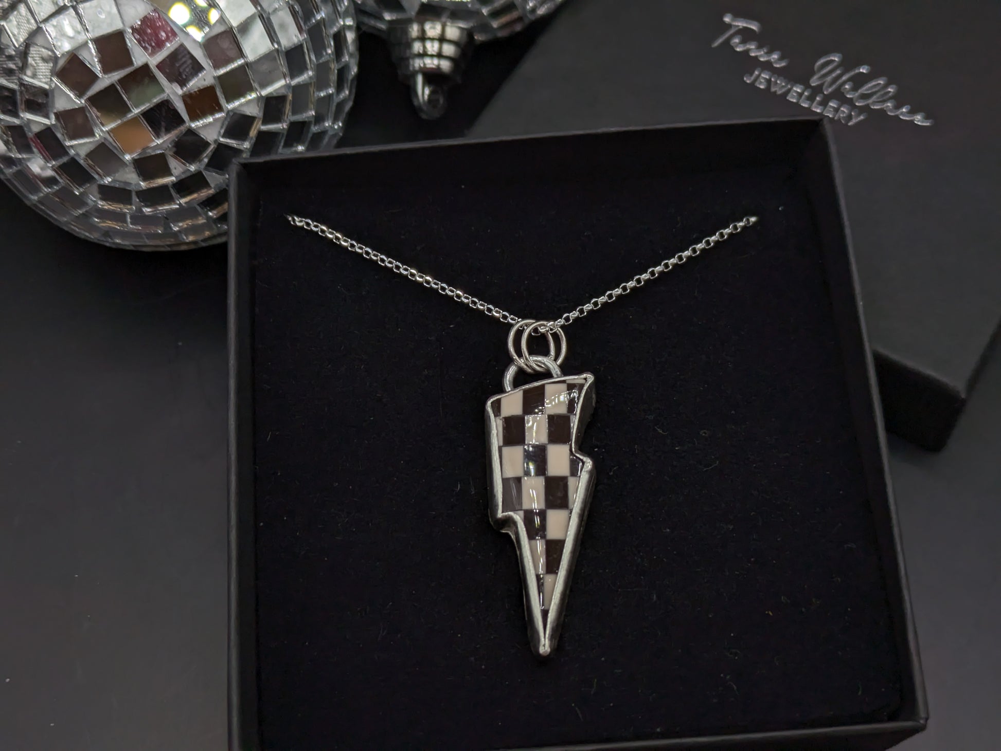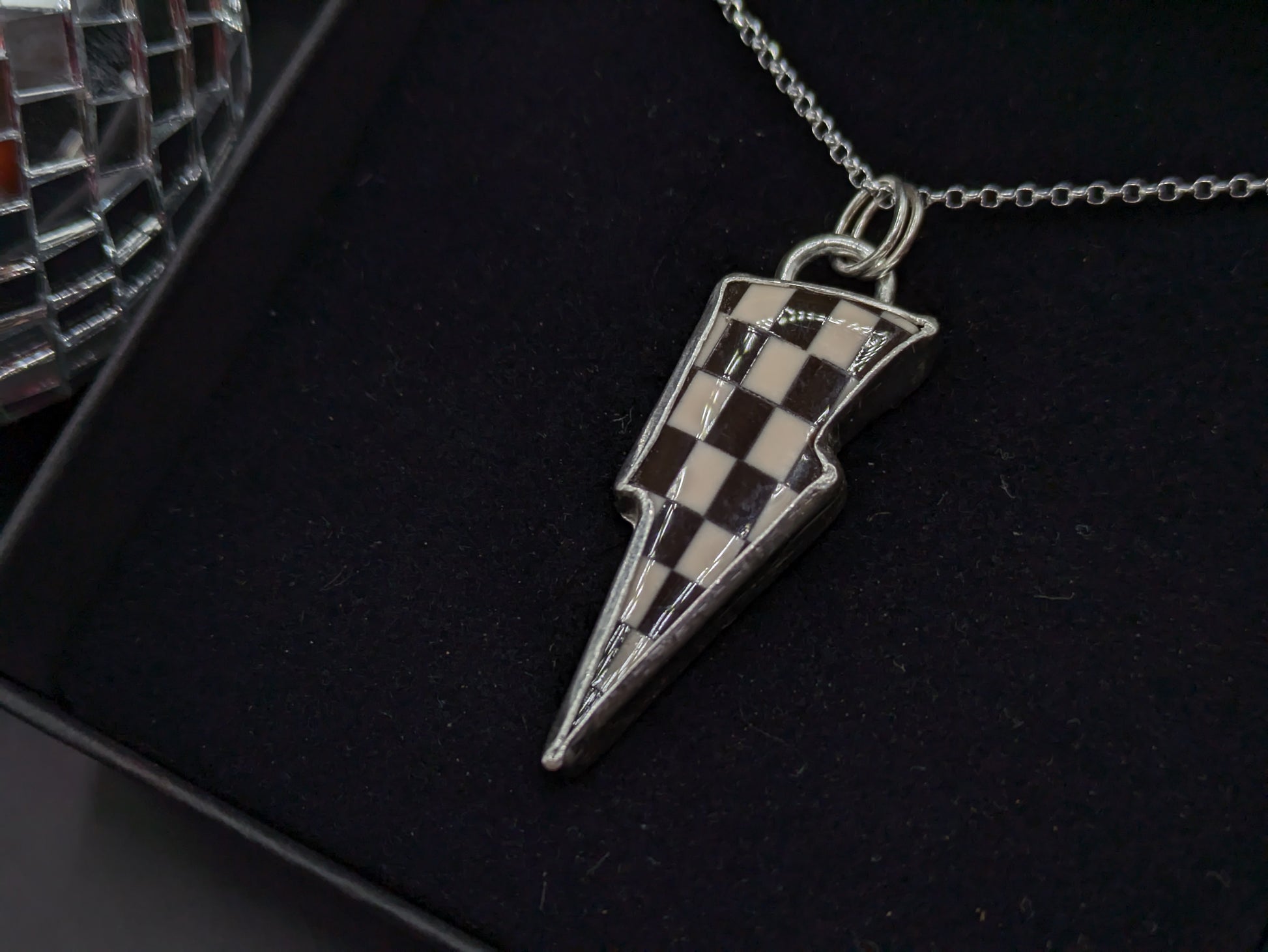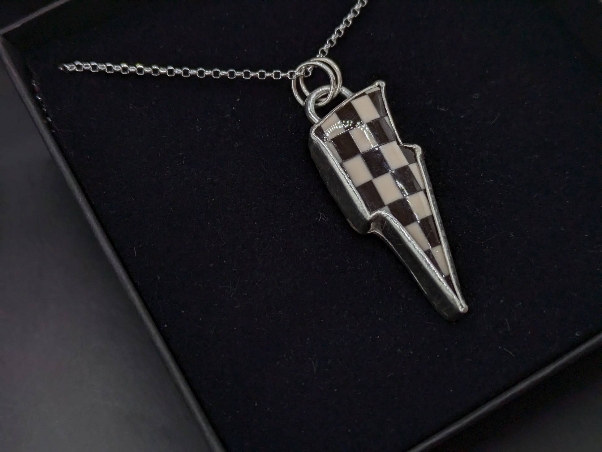 A striking (see what I did there...) lightning bolt shaped pendant made from a checkerboard shaped piece which has been painstakingly created by hand from acrylic.