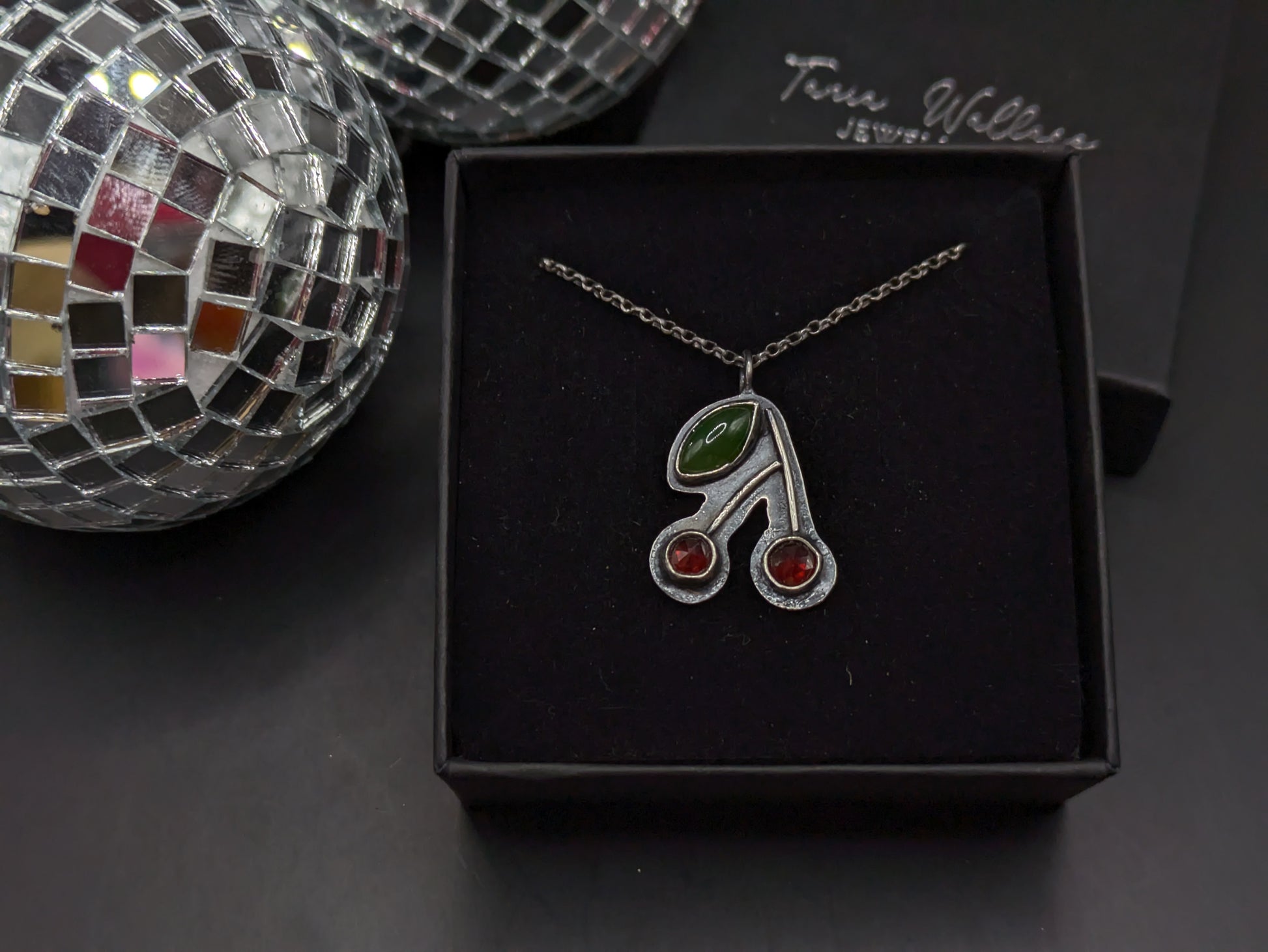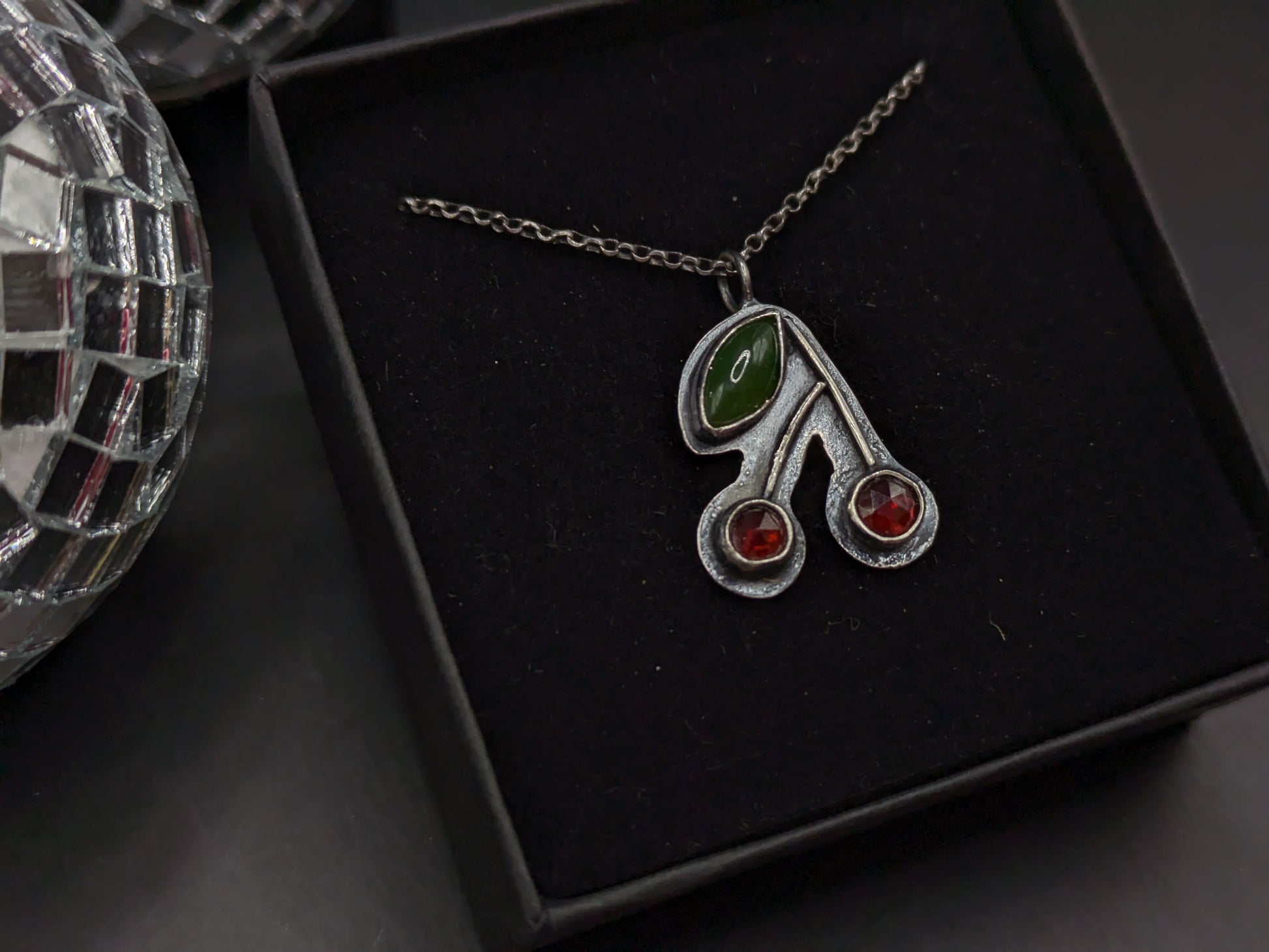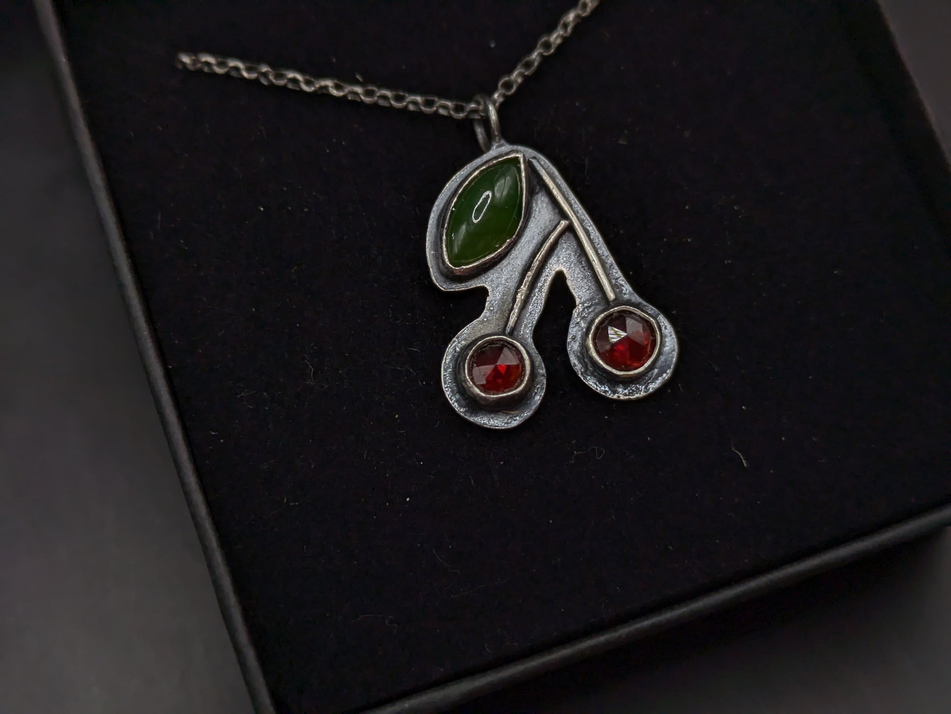 My new favourite piece! I spent lots of time and love putting this piece together. I sourced top quality and ethically sourced faceted garnet gemstones to be the berries and smooth nephrite jade as the leaf all set into sterling silver which I carved by hand and oxidised to make the cherries pop in the light.