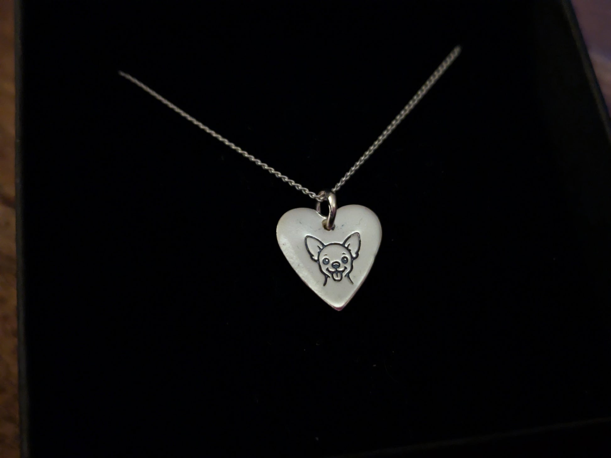 A gorgeous sterling silver heart shaped pendant with chihuahua design stamp.