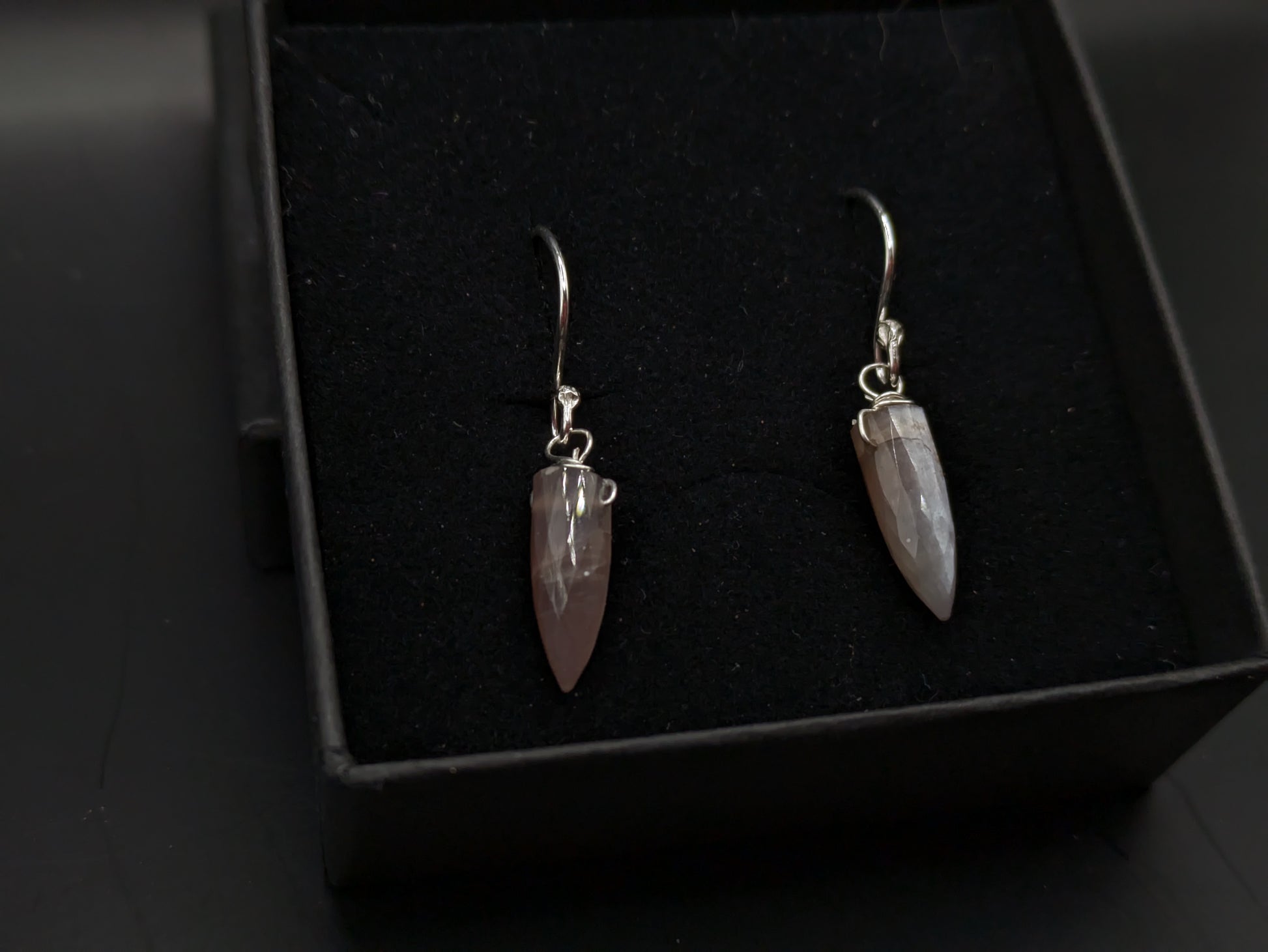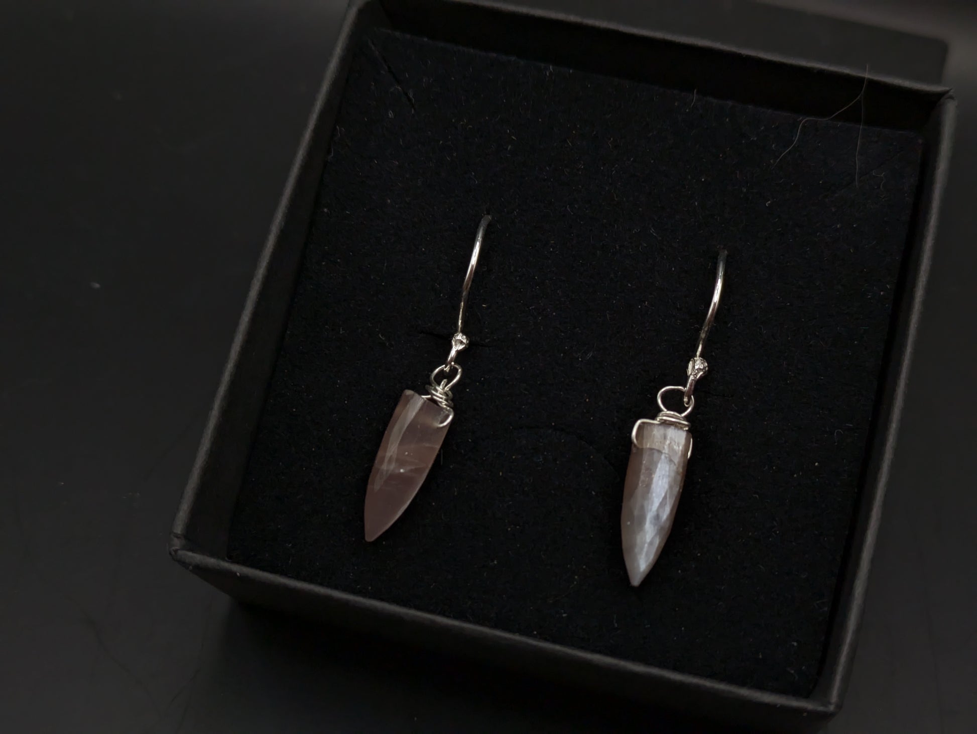That's right, chocolate moonstone! I had no idea this beauty even existed!! The faceted bullet shaped drops are wire wrapped with the thin sterling silver wire and then threaded onto handmade sterling silver hooks.