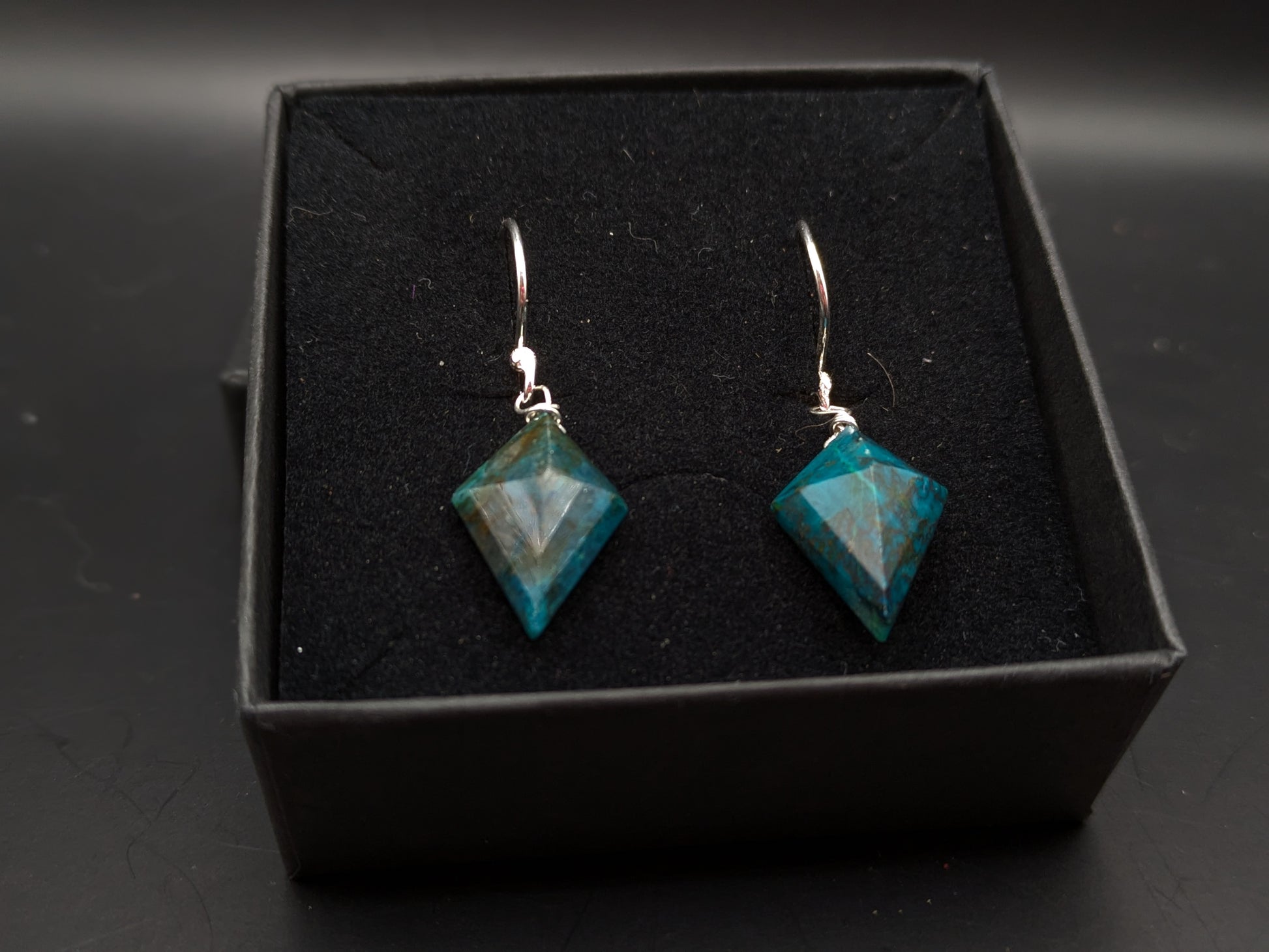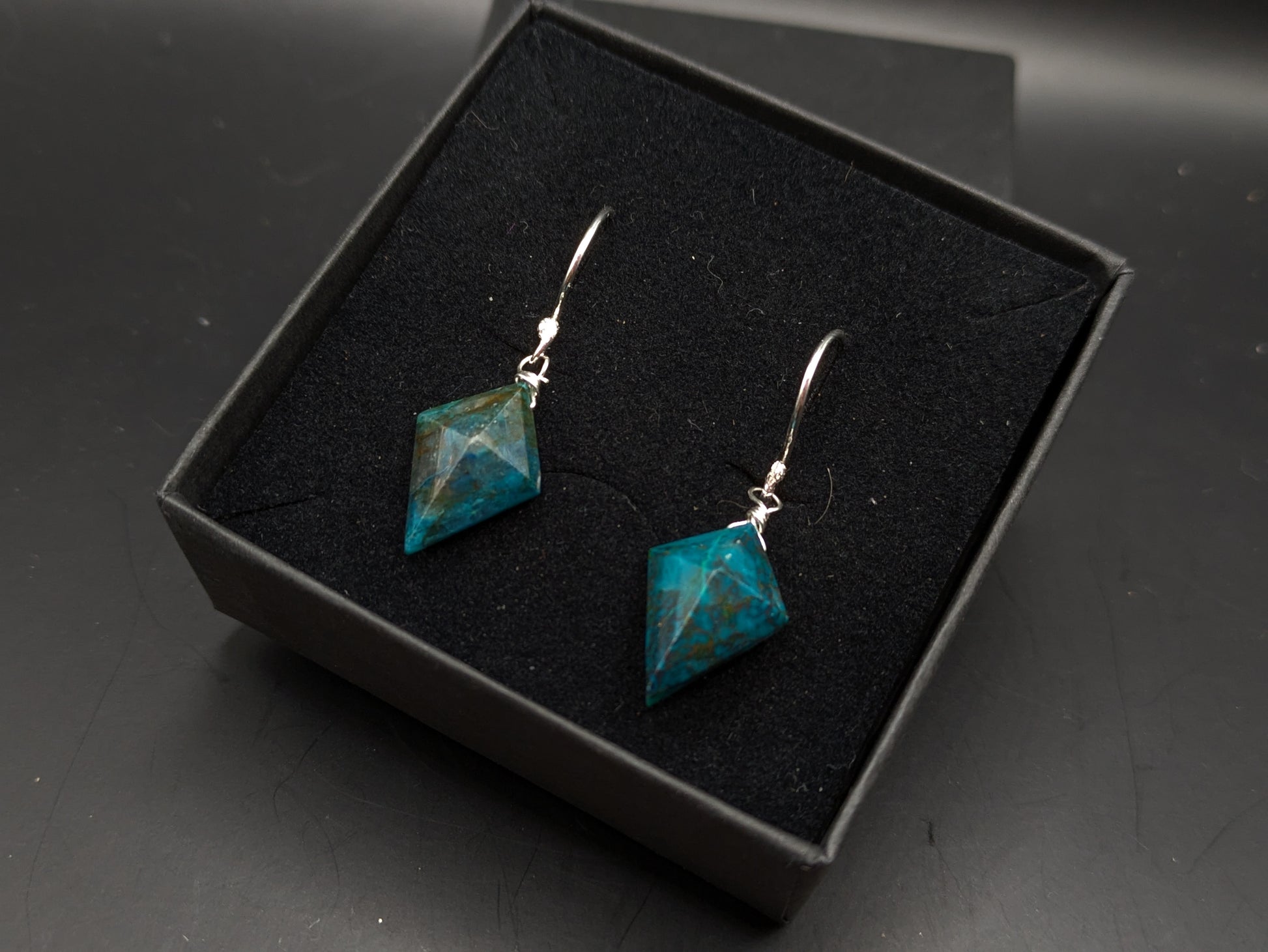 Gorgeous ethically sourced chrysocolla kite shaped earrings wrapped in sterling silver wire and looped onto handmade sterling silver hooks.
