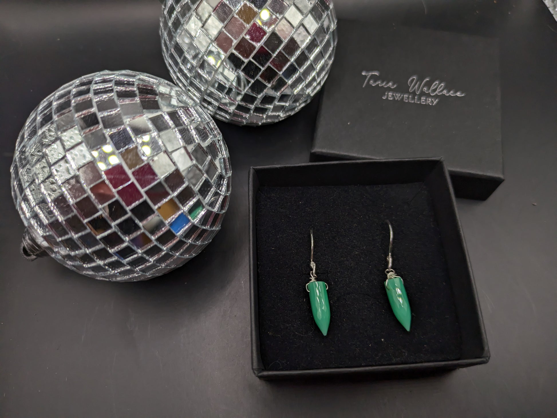 A pair of vibrant green faceted ethically sourced chrysoprase bullet shaped drops which I have wrapped in a thin sterling silver wire.