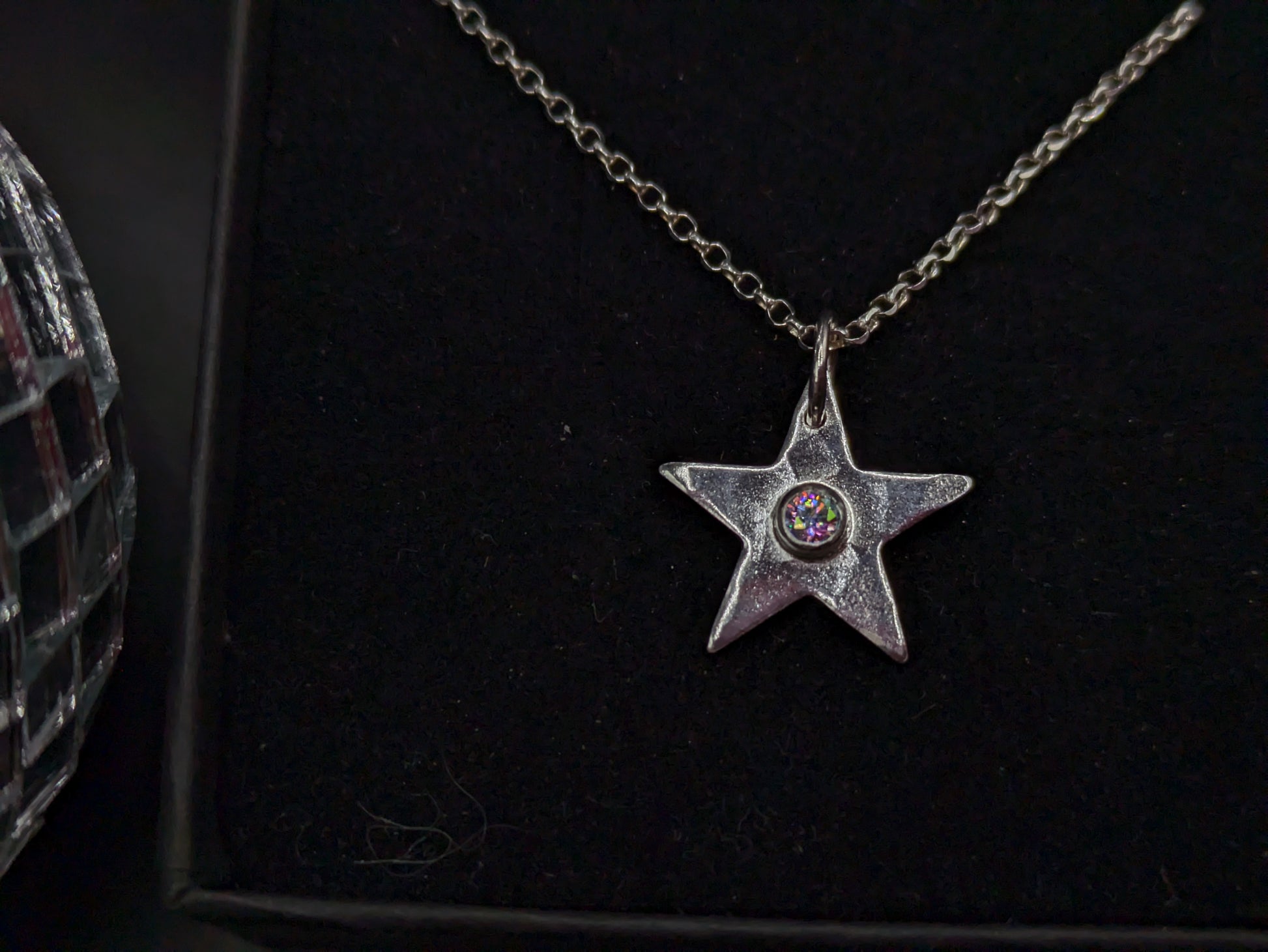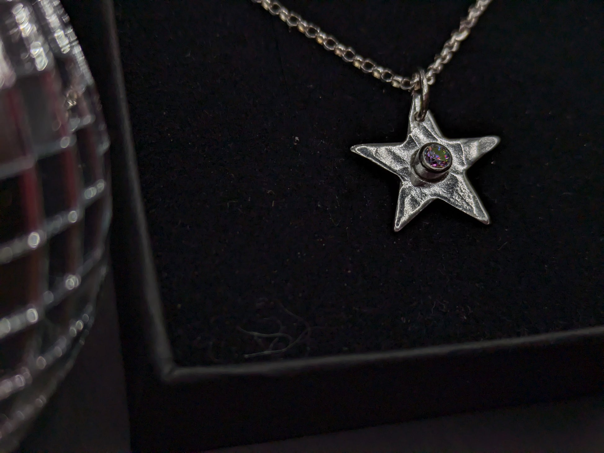 The star is made from recycled sterling silver, it is approximately 11 mm wide and comes on a sterling silver chain.