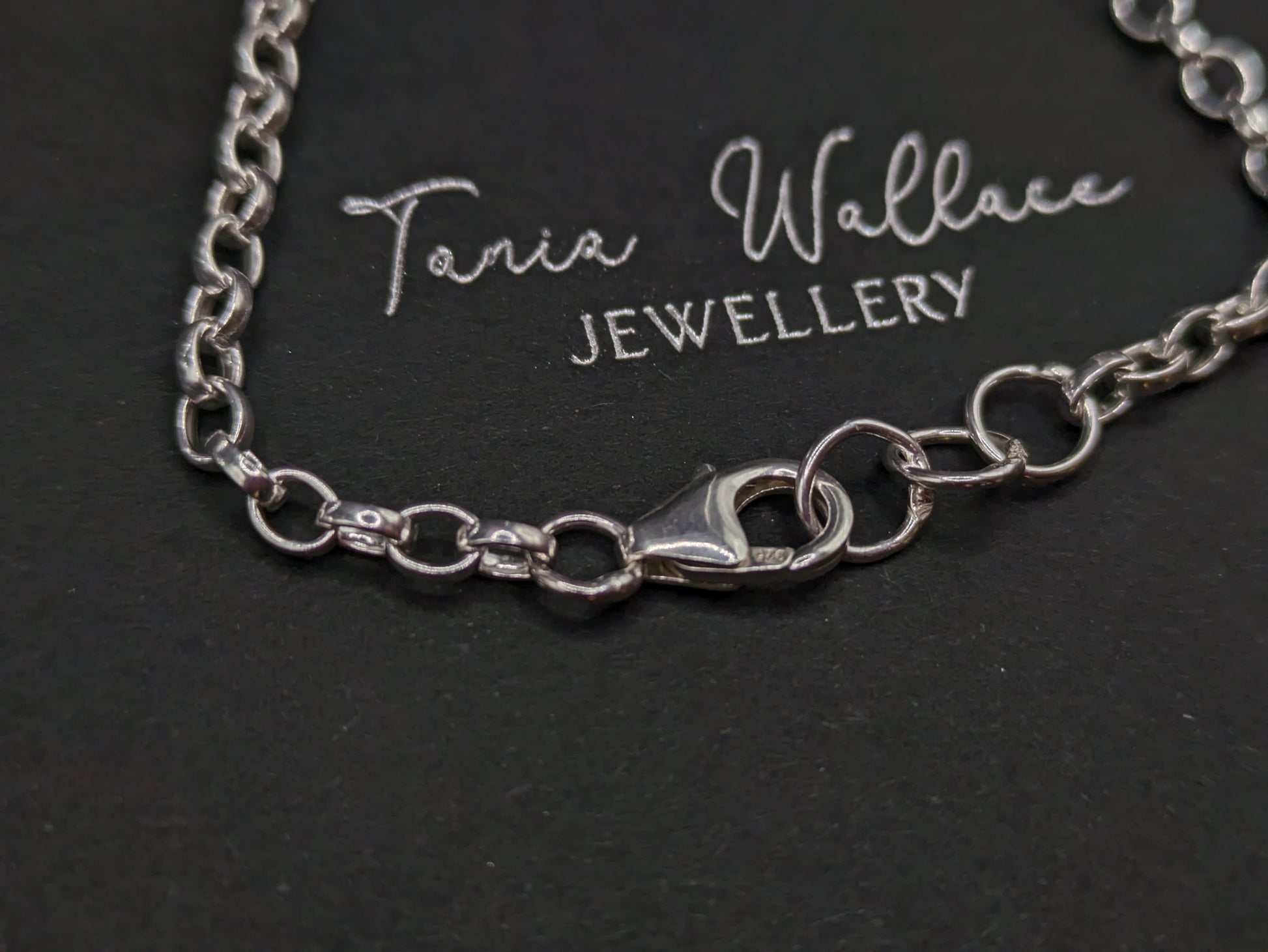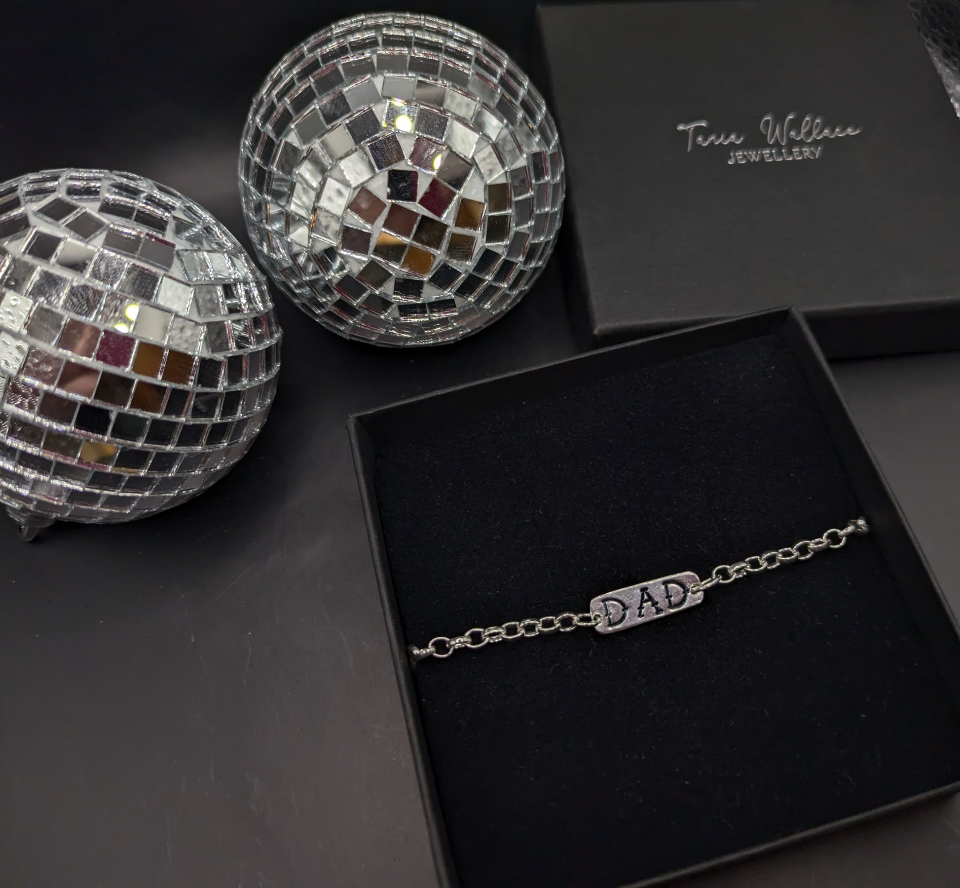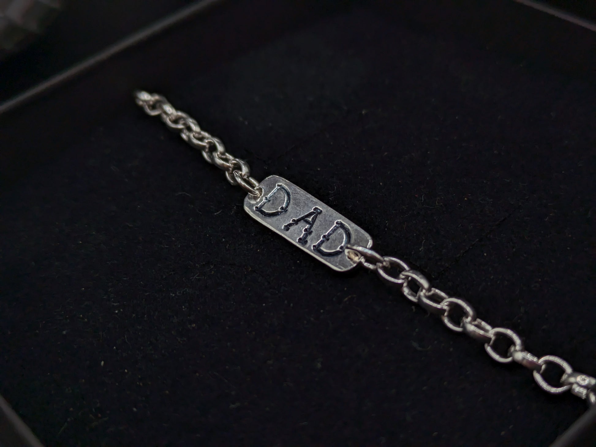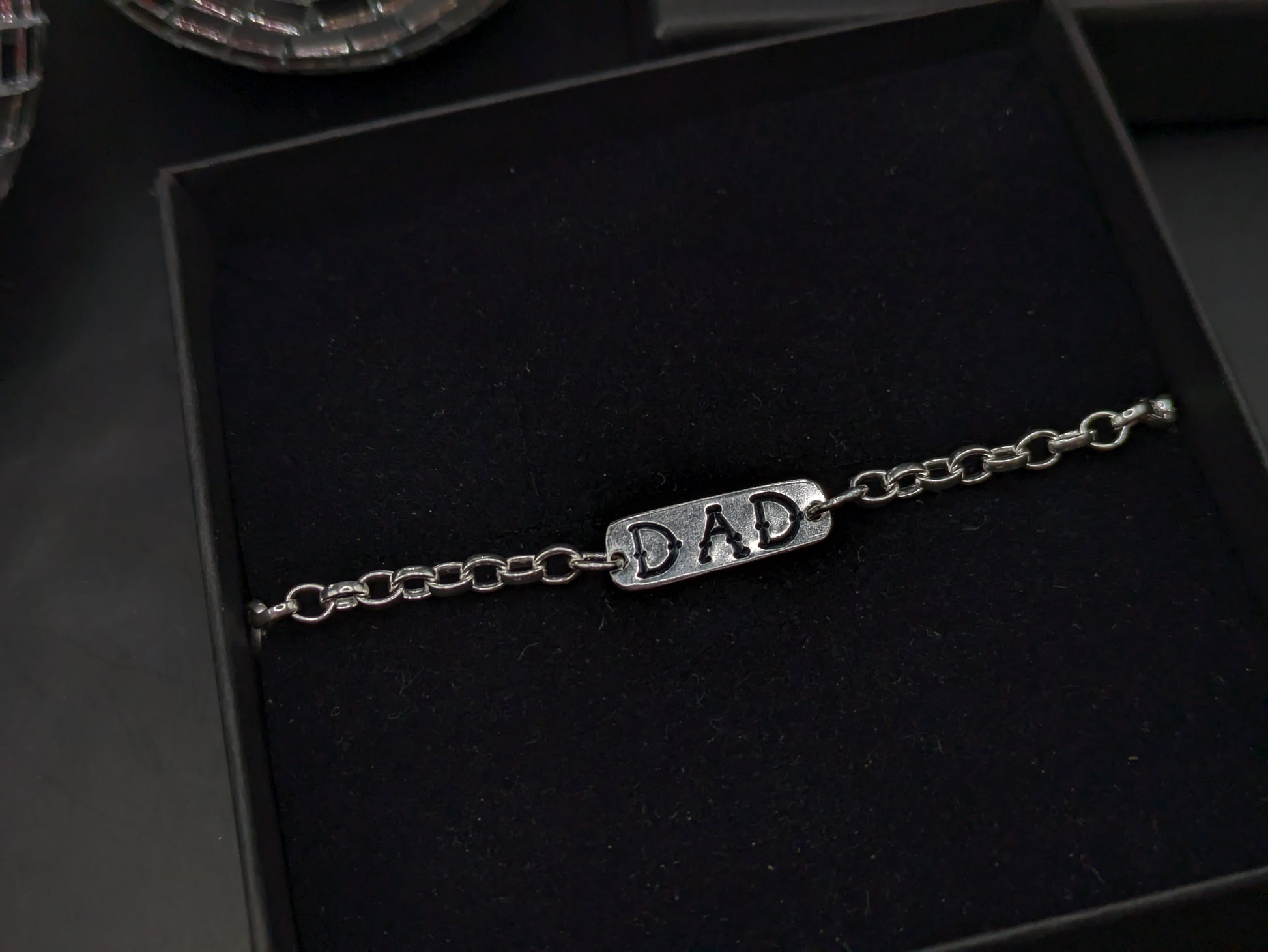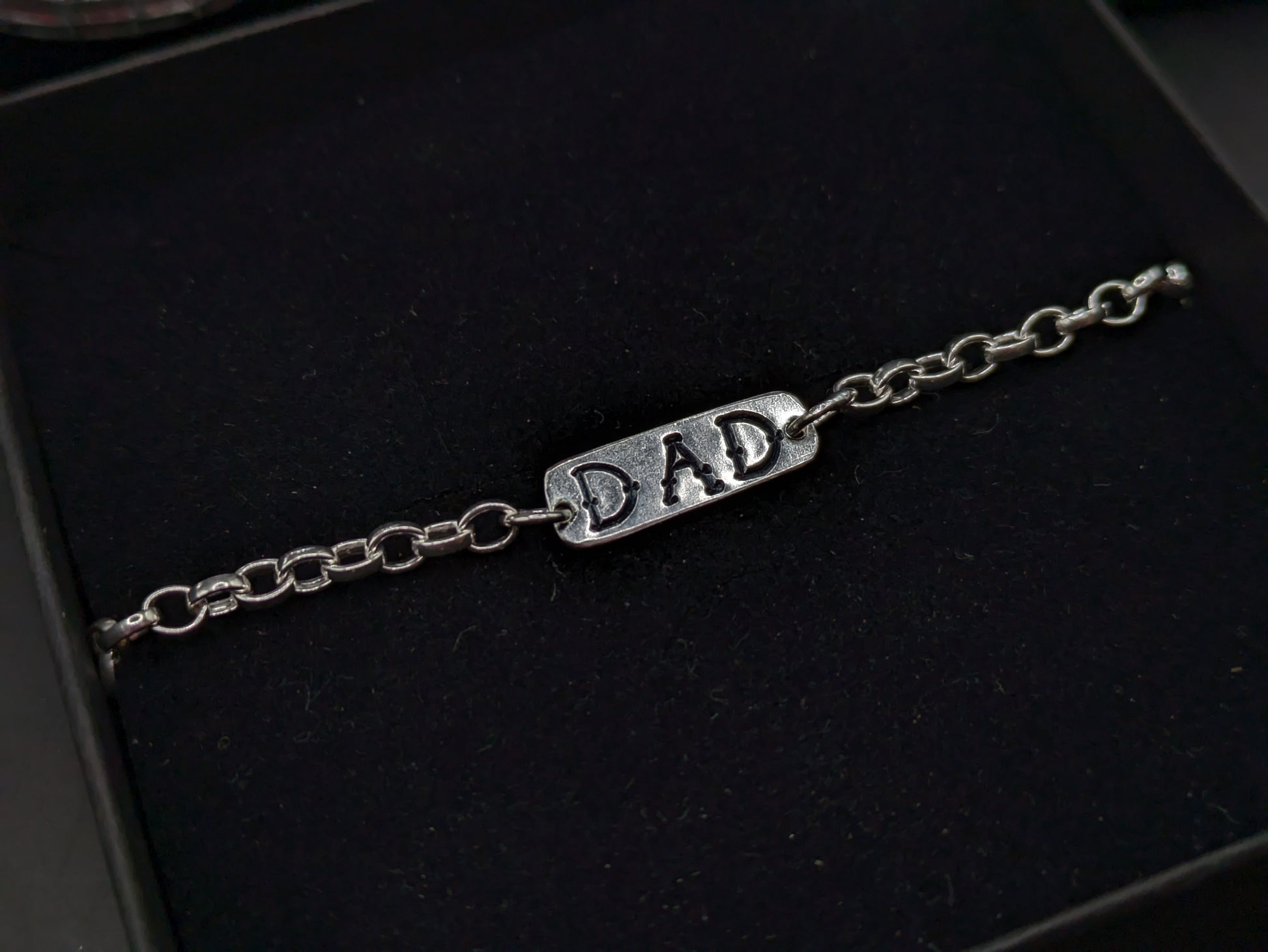 Sterling silver belcher chain bracelet with hand carved bar detail with 'DAD' stamped in tattoo style lettering. I have soldered 3 hoops to make it extendable.