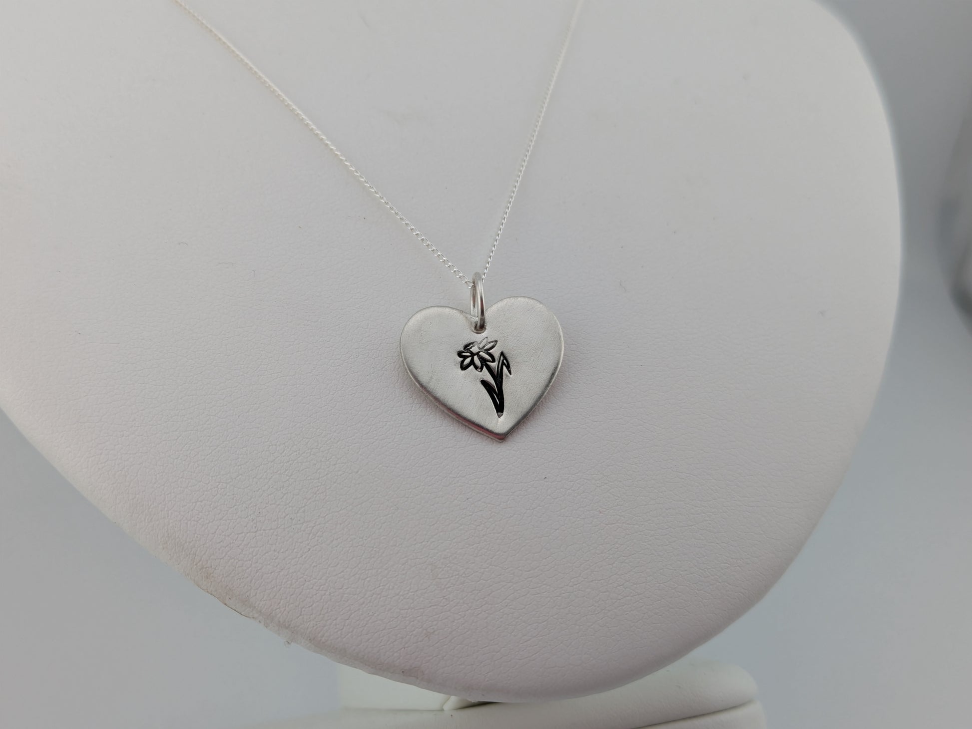 This is a pretty and delicate little heart shaped pendant with a hand punched daffodil design darkened with black enamel paint.