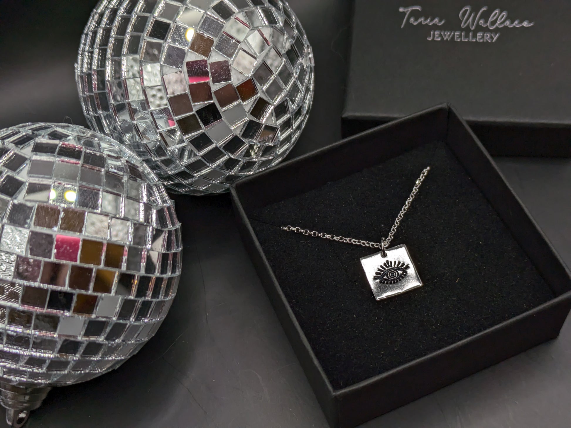 Sterling silver square shaped pendant with the hand pressed stamp of the evil eye. I also have drops available or they can be bought in a set.