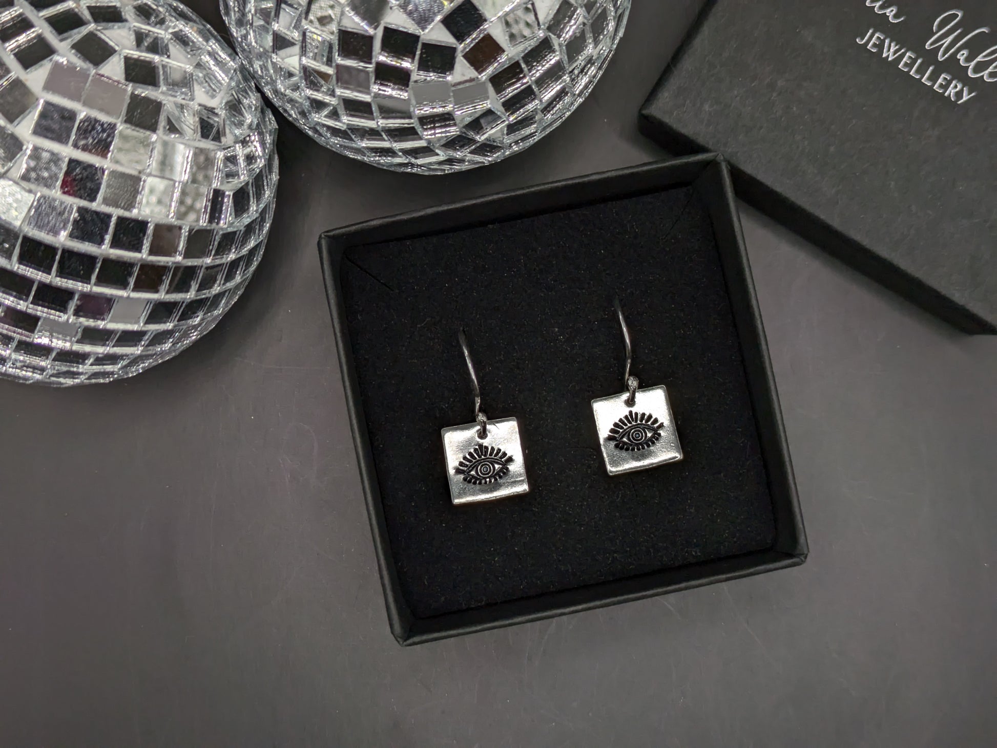 Sterling silver square shaped pendant and earrings with the hand pressed stamp of the evil eye. You can also buy the pieces individually.