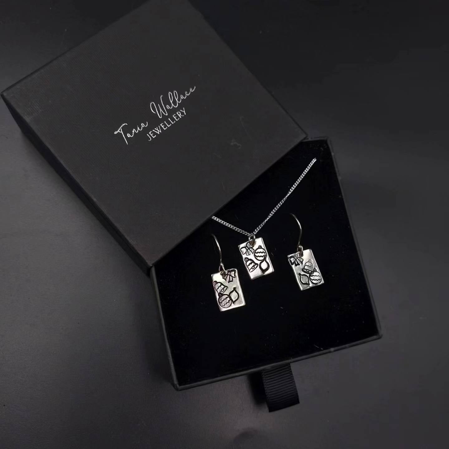 The rectangle is approximately 1.5cm long, the pendant comes on a sterling silver chain and the earrings come on handmade silver hooks. They are available individually or as the set.