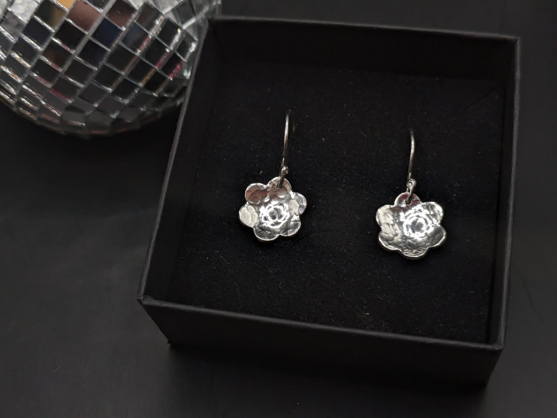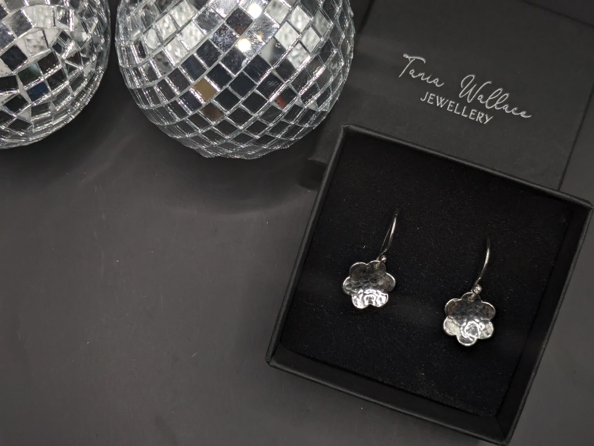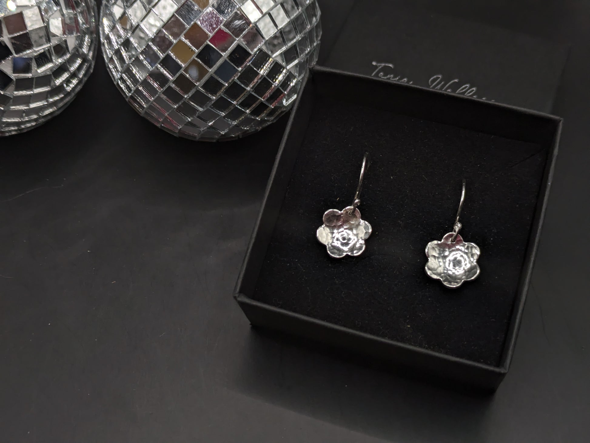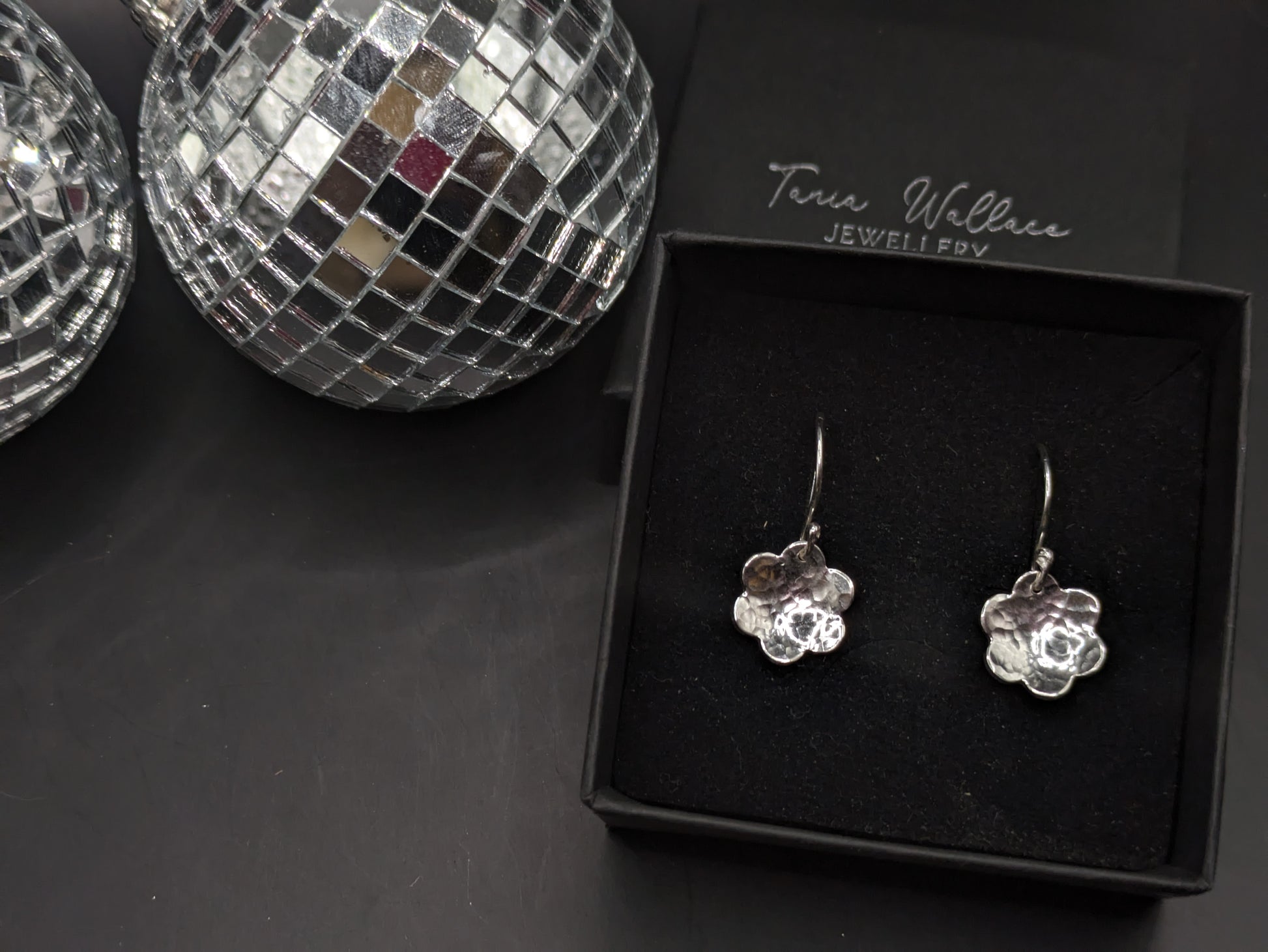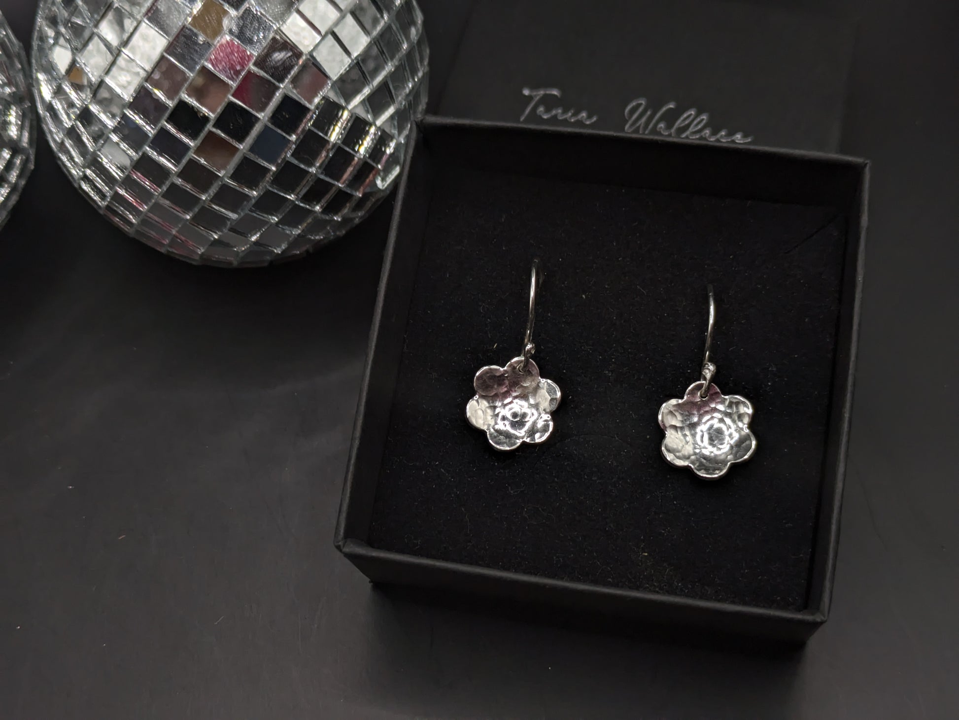 The flowers are approx 1 cm wide and come on handmade sterling silver hooks