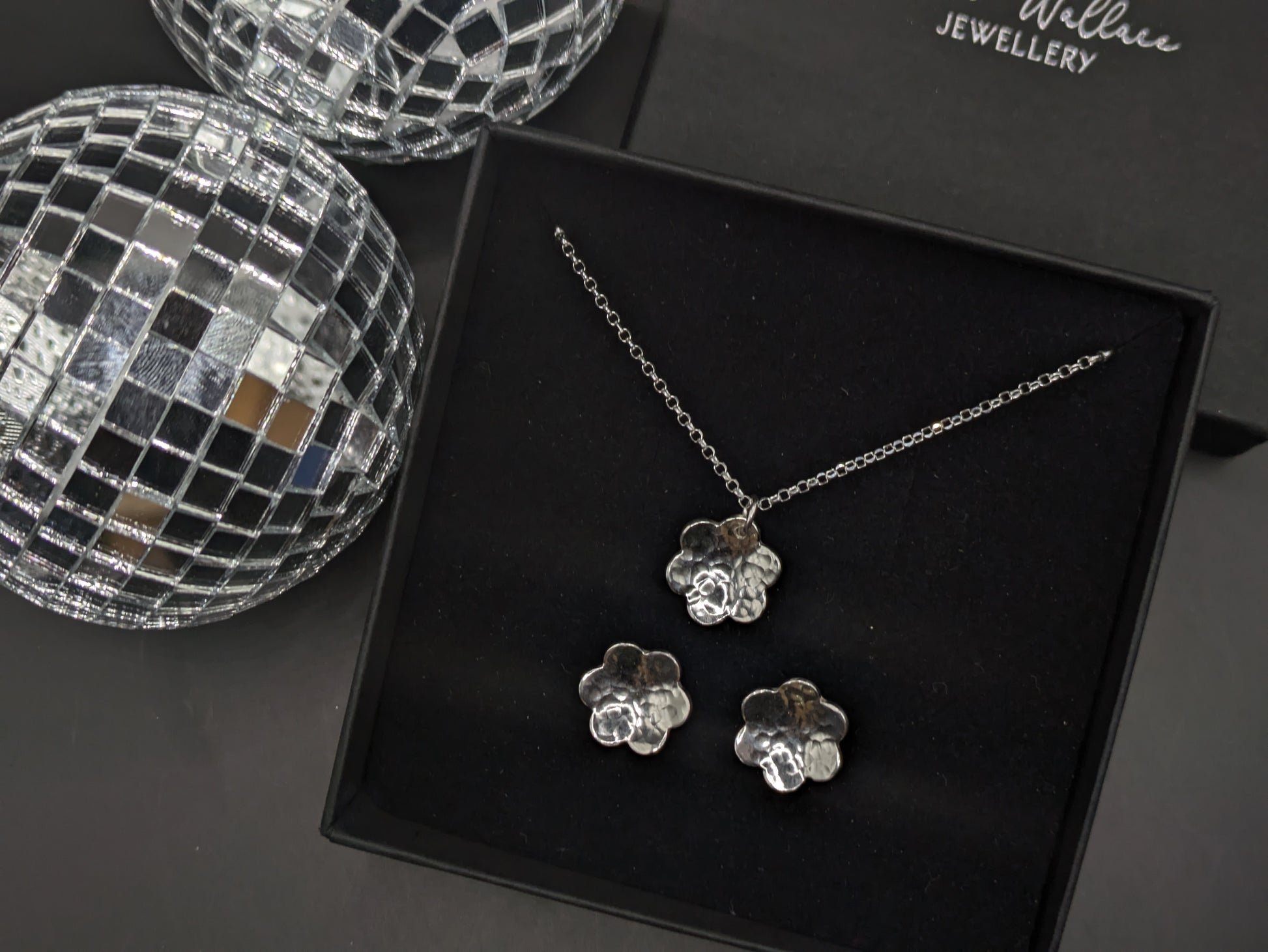 Pretty sterling silver set in the shape of flowers which I have textured by hand and polished up to a high shine.