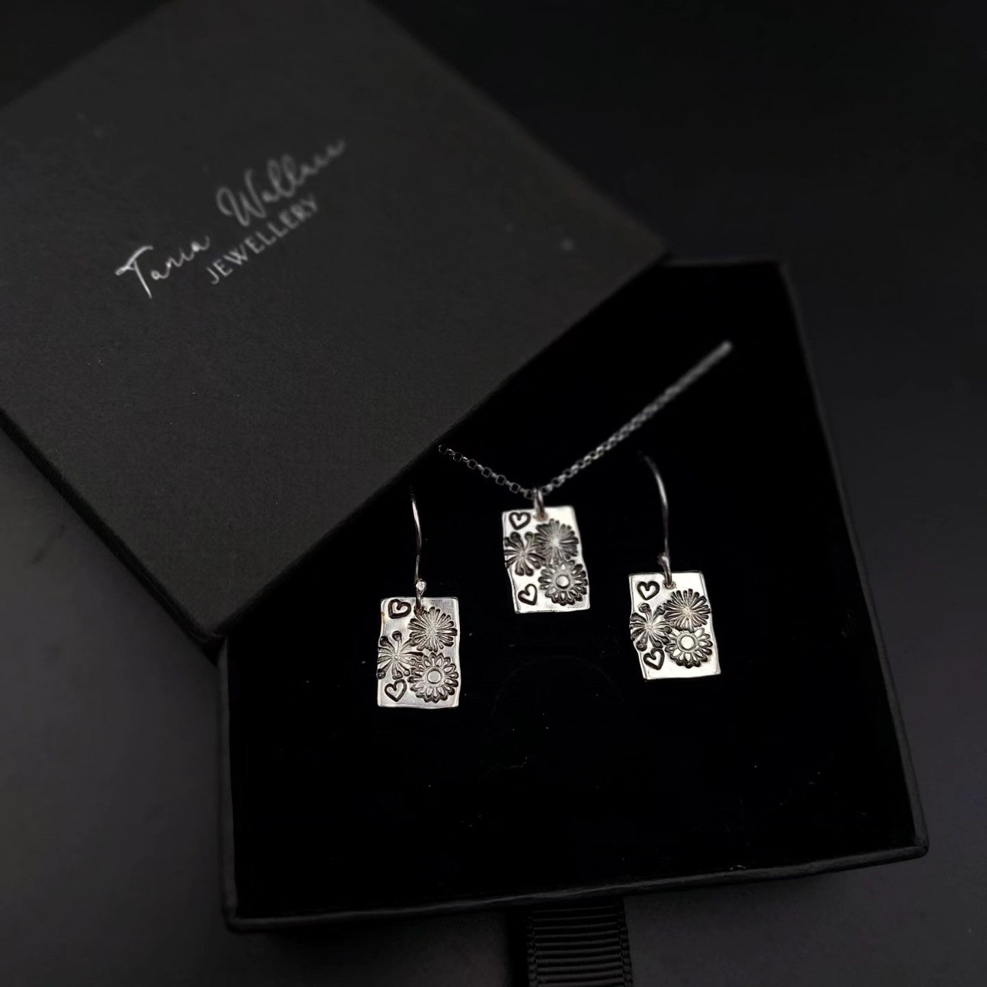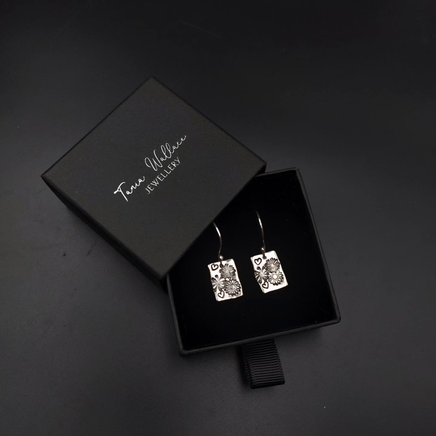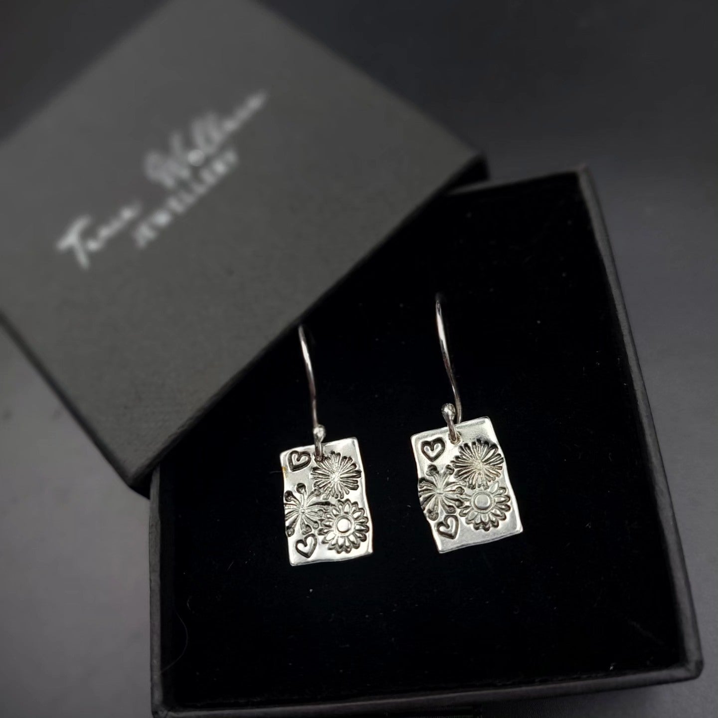 Pretty sterling silver earrings on handmade silver hooks with flowers and little heart stamps.