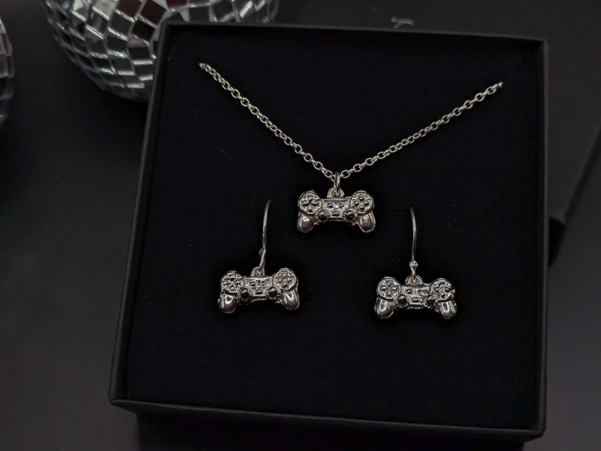 Sand cast controller pendant and earrings approx 1.5 cm wide and comes on a sterling silver chain.