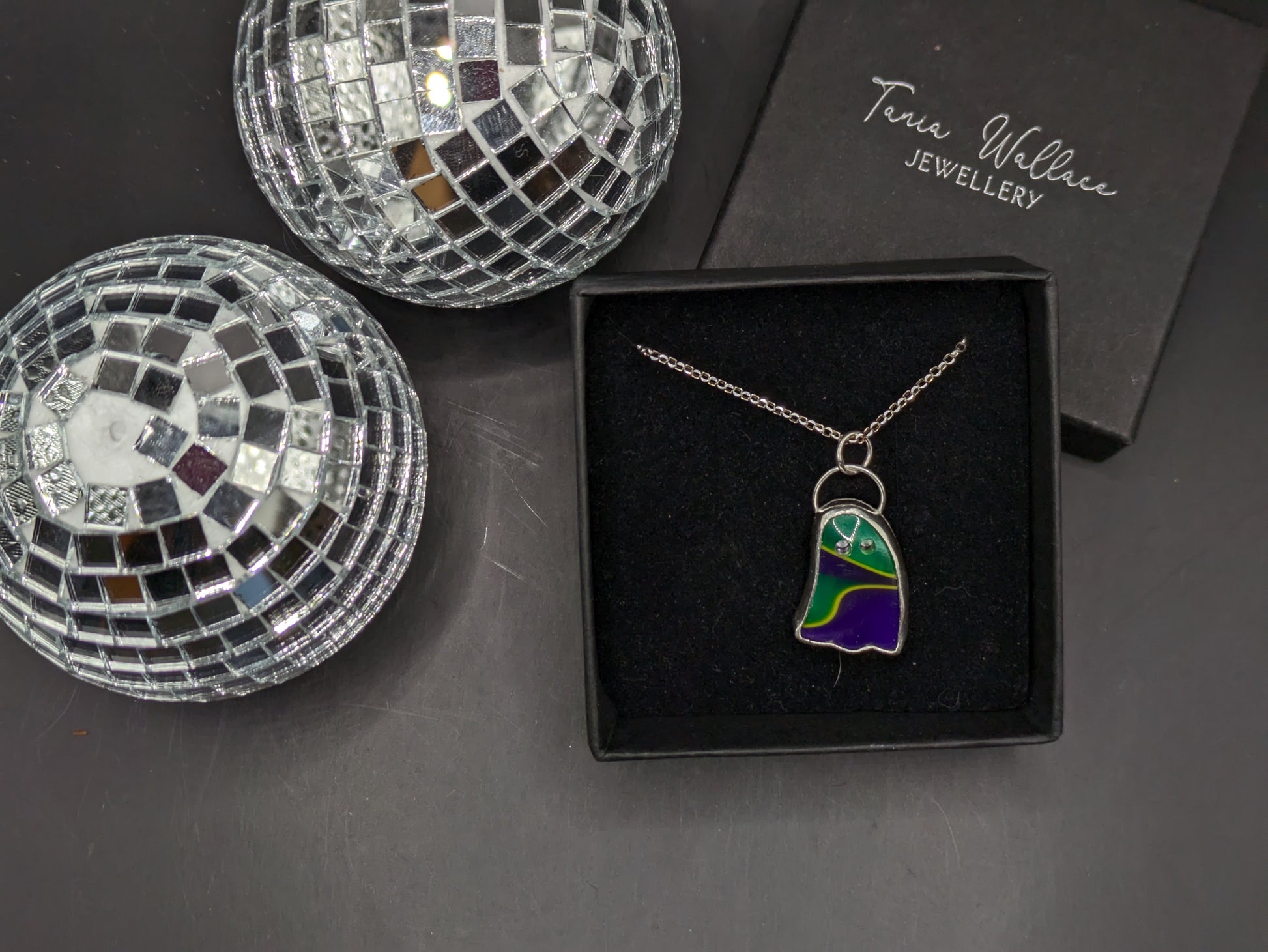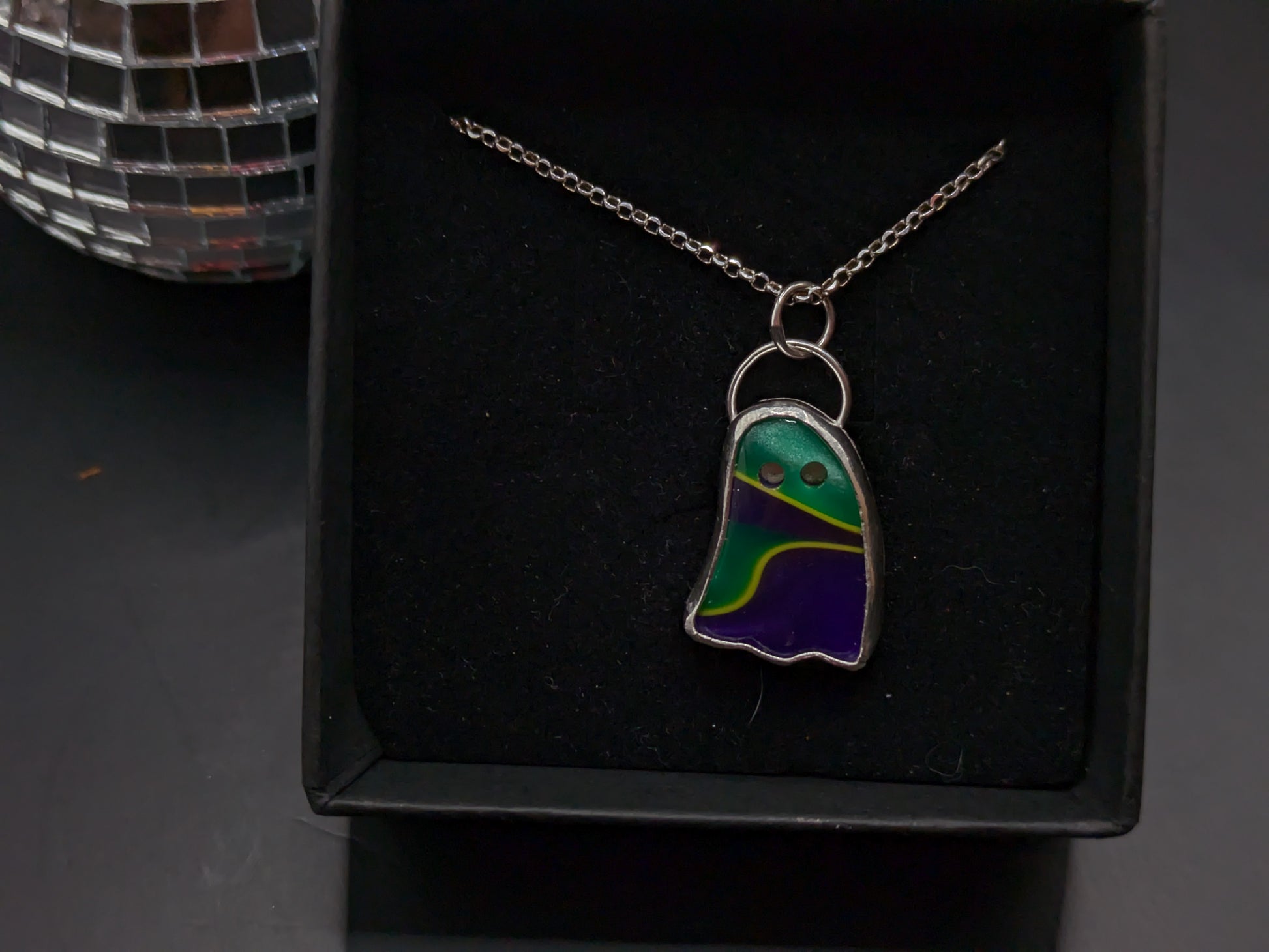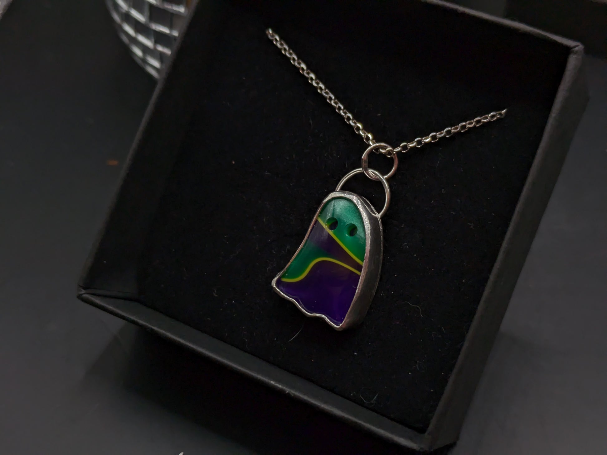 This ghost has been hand finished from mixed swirling acrylic which I've set onto sterling silver and put on a sterling silver chain.
