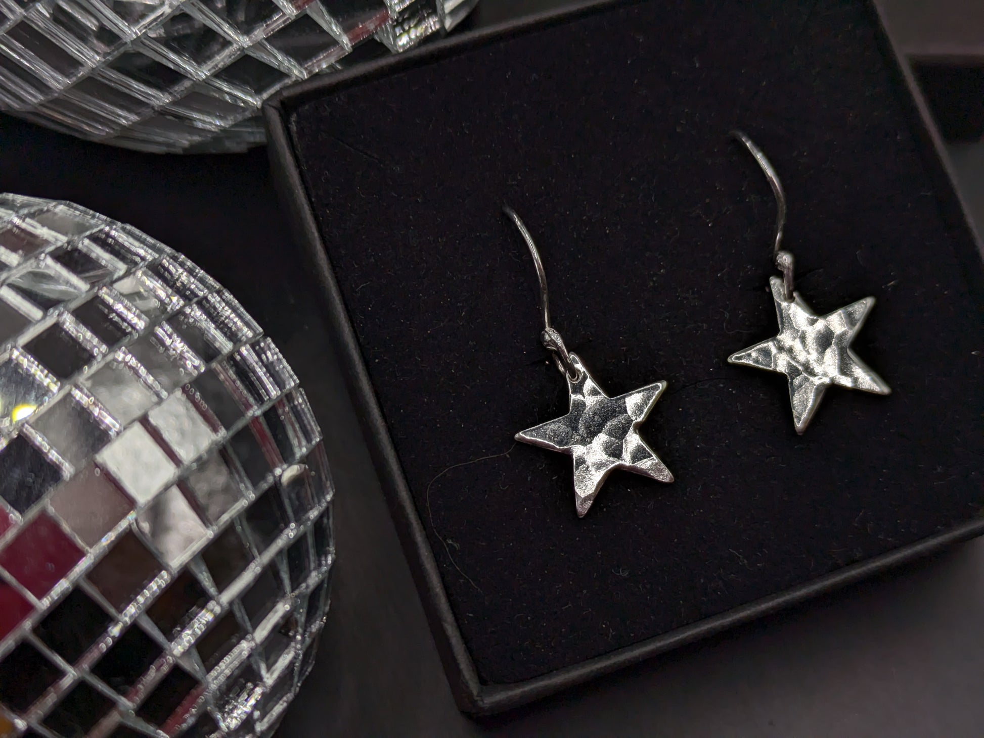 These lovely star drop earrings are handmade from recycled sterling silver and have been gently textured to give a little sparkling finish!