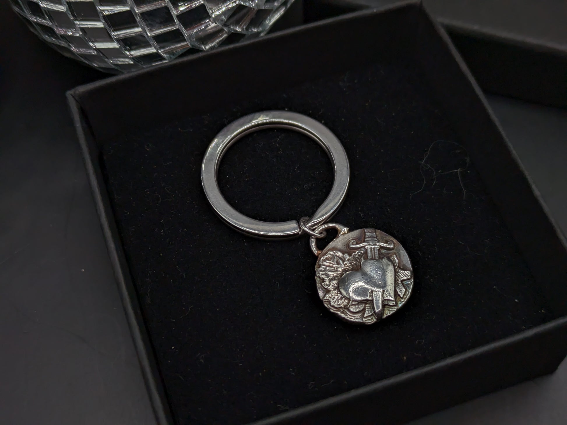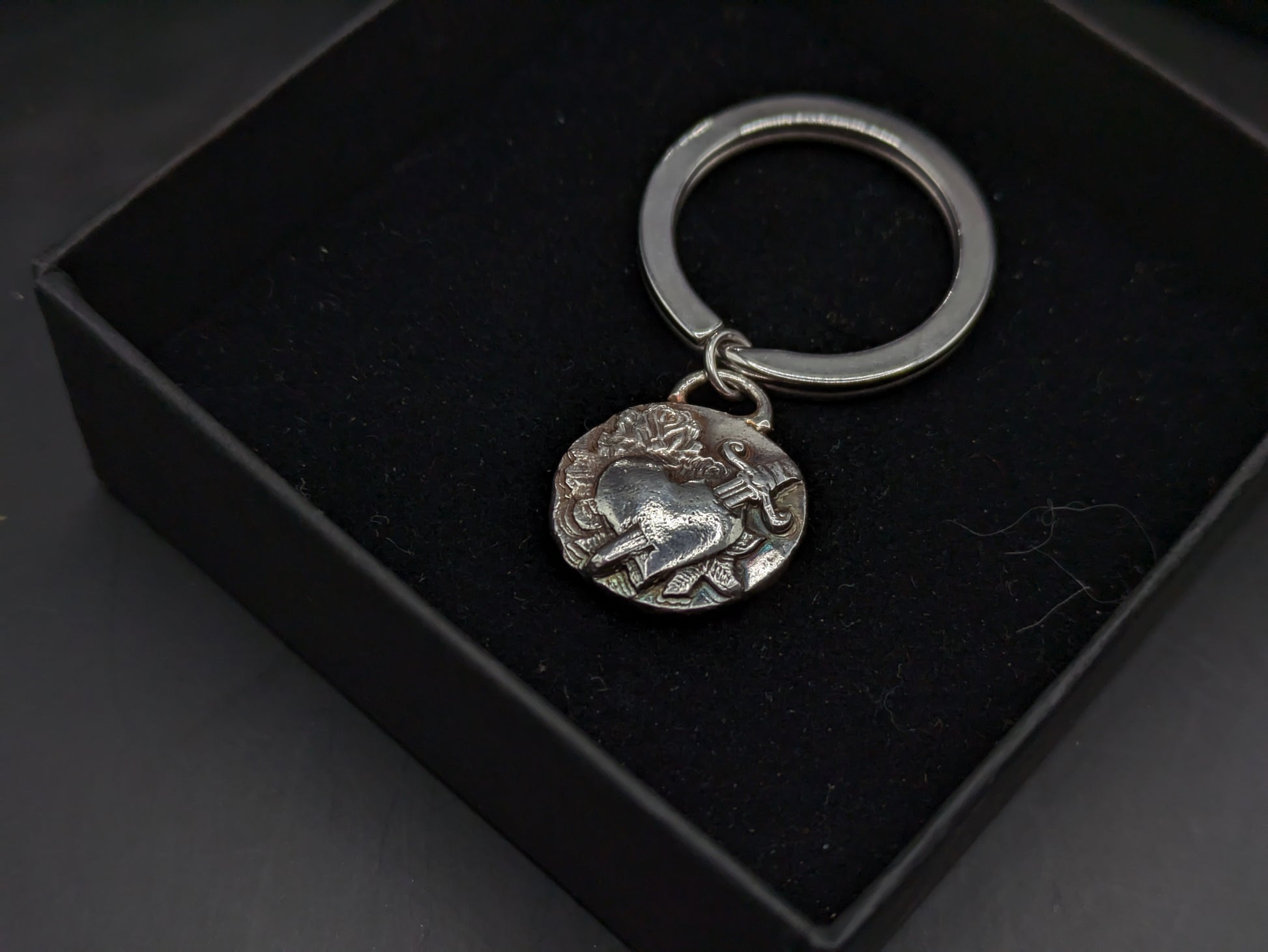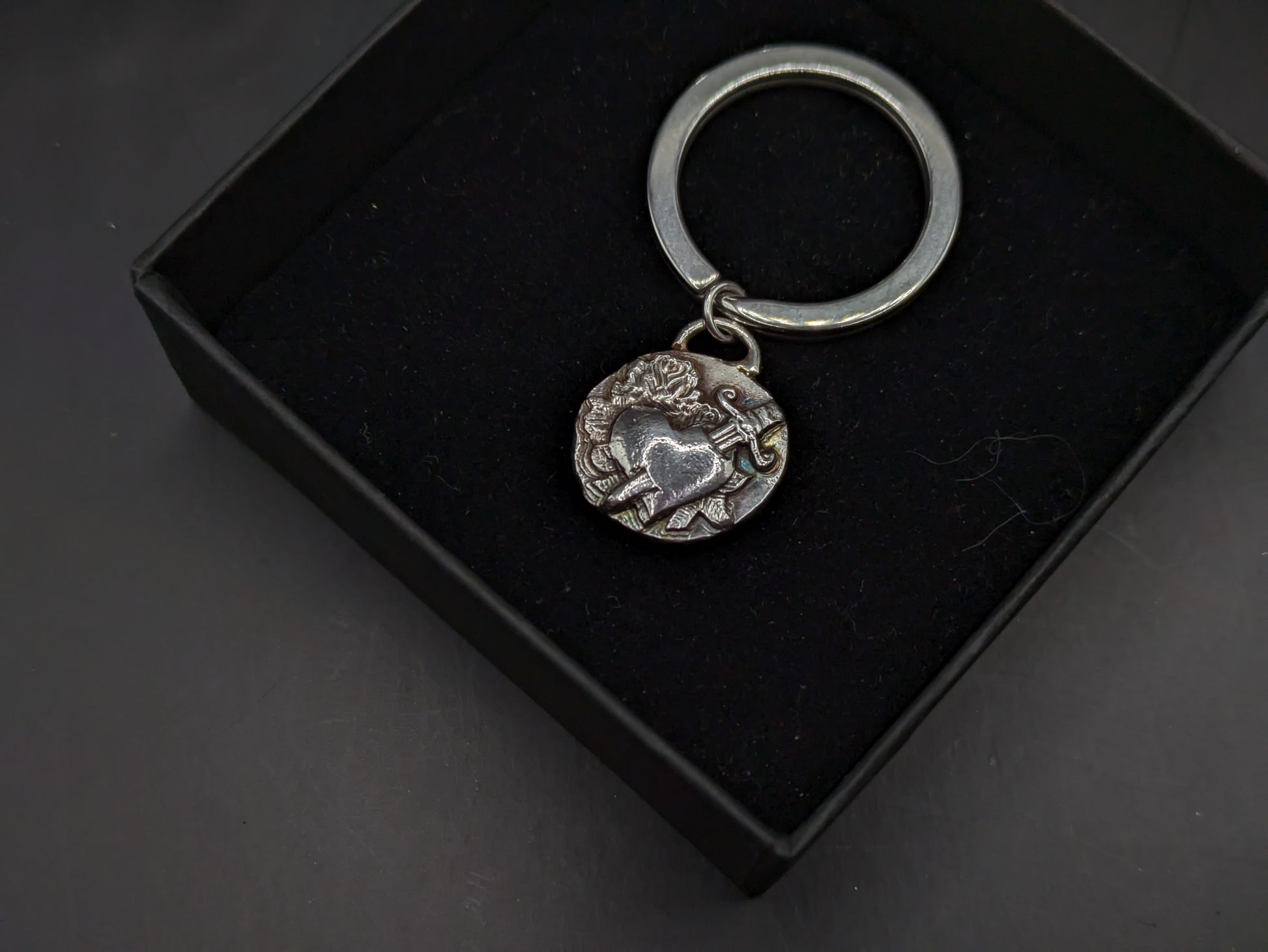 The keying charm has been hand pressed into an impression die and then has been finished off by oxidizing and gently polishing.