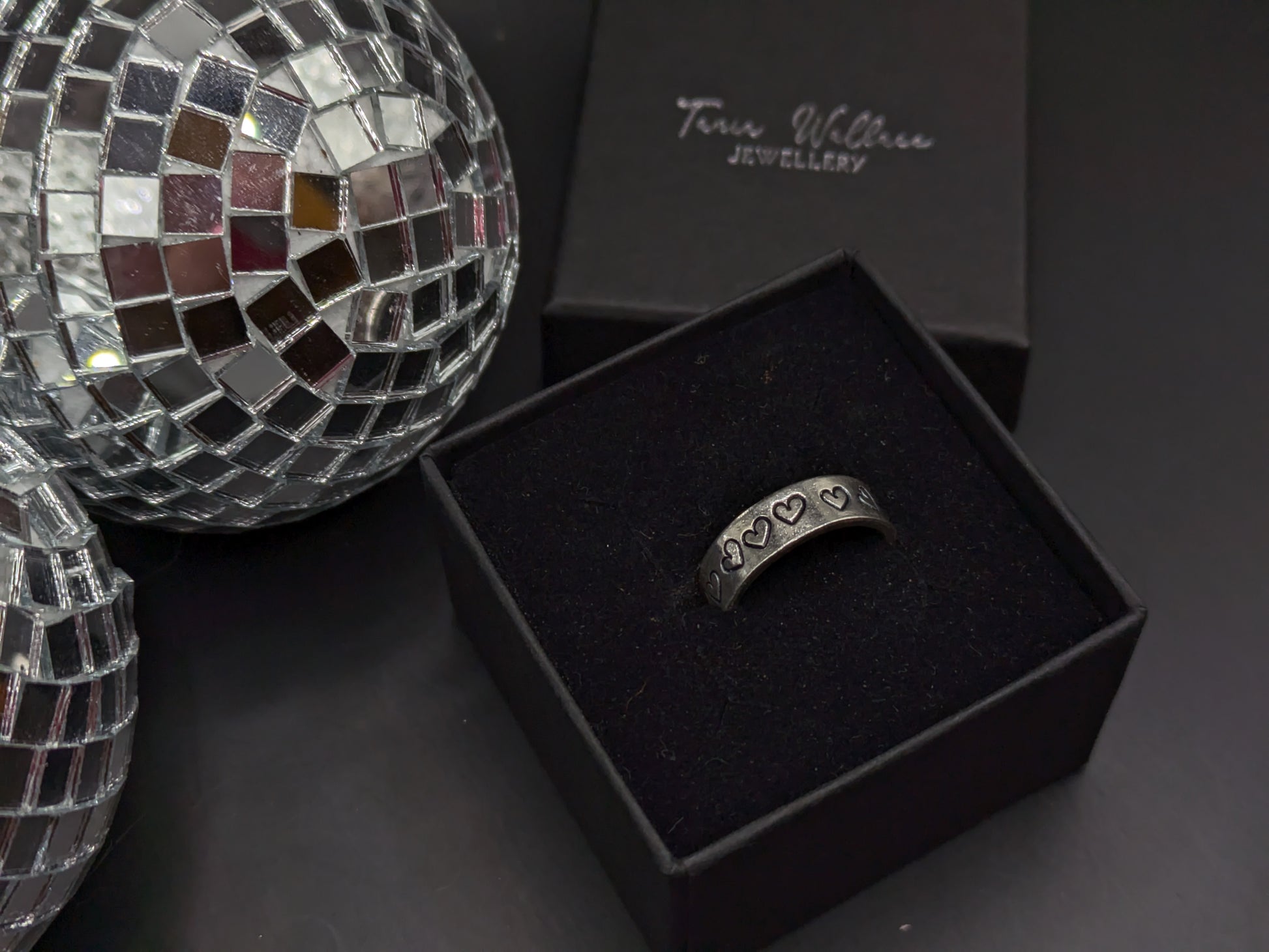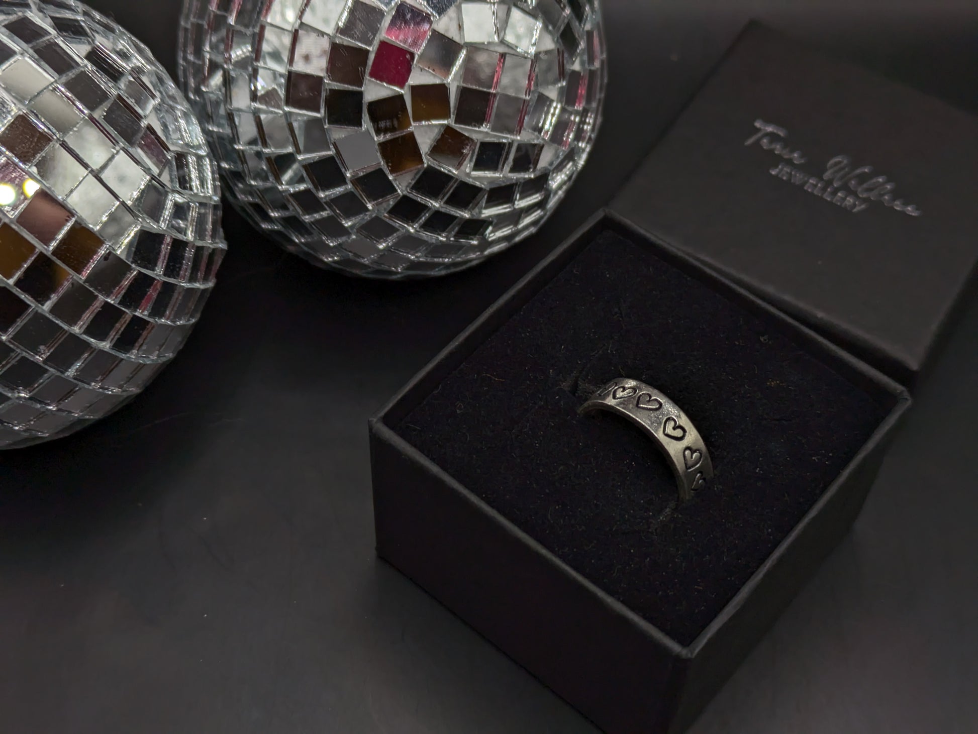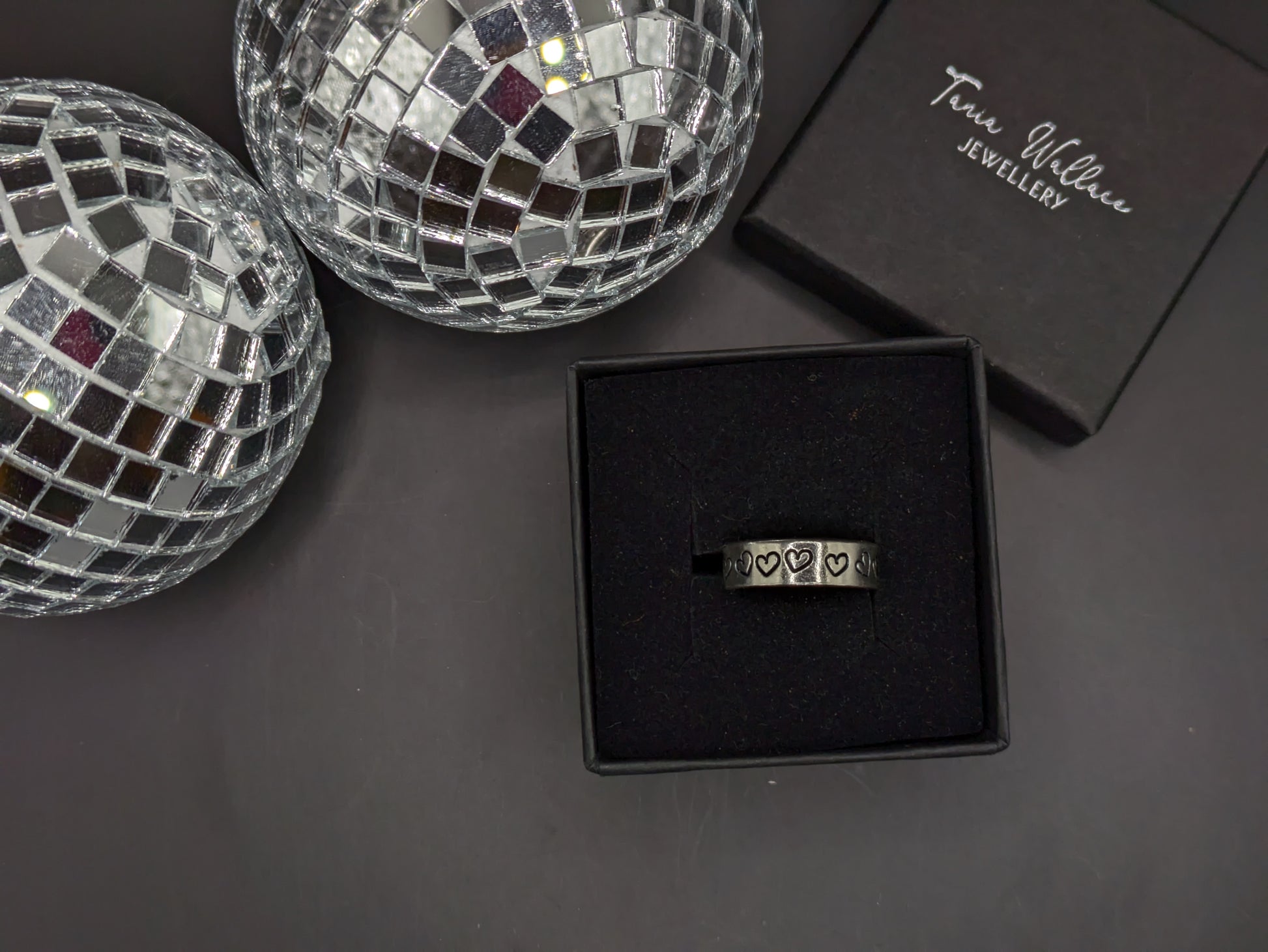A gorgeous 5mm wide sterling silver band ring with hand punched heart designs coated in an enamel black to highlight the design.