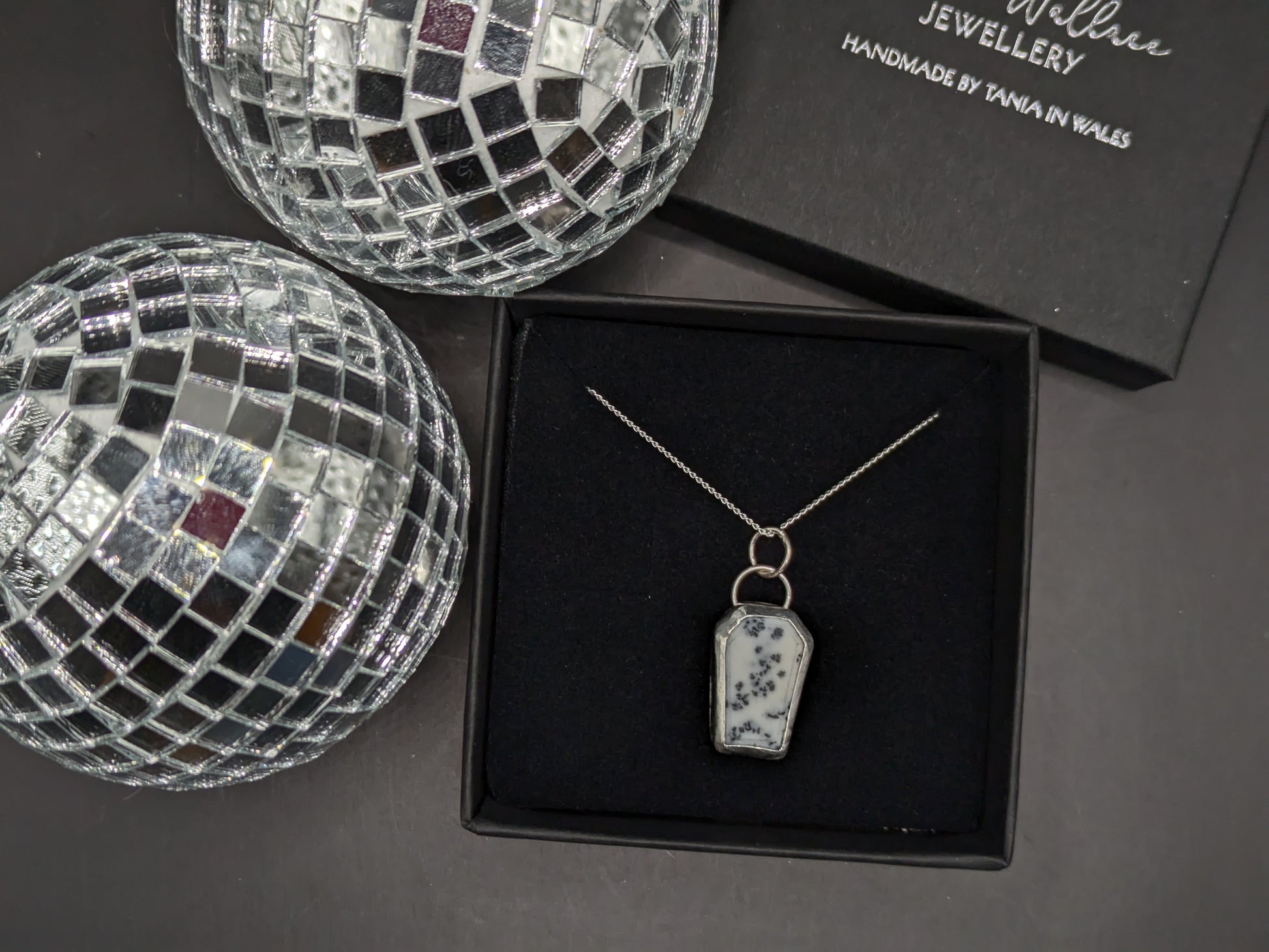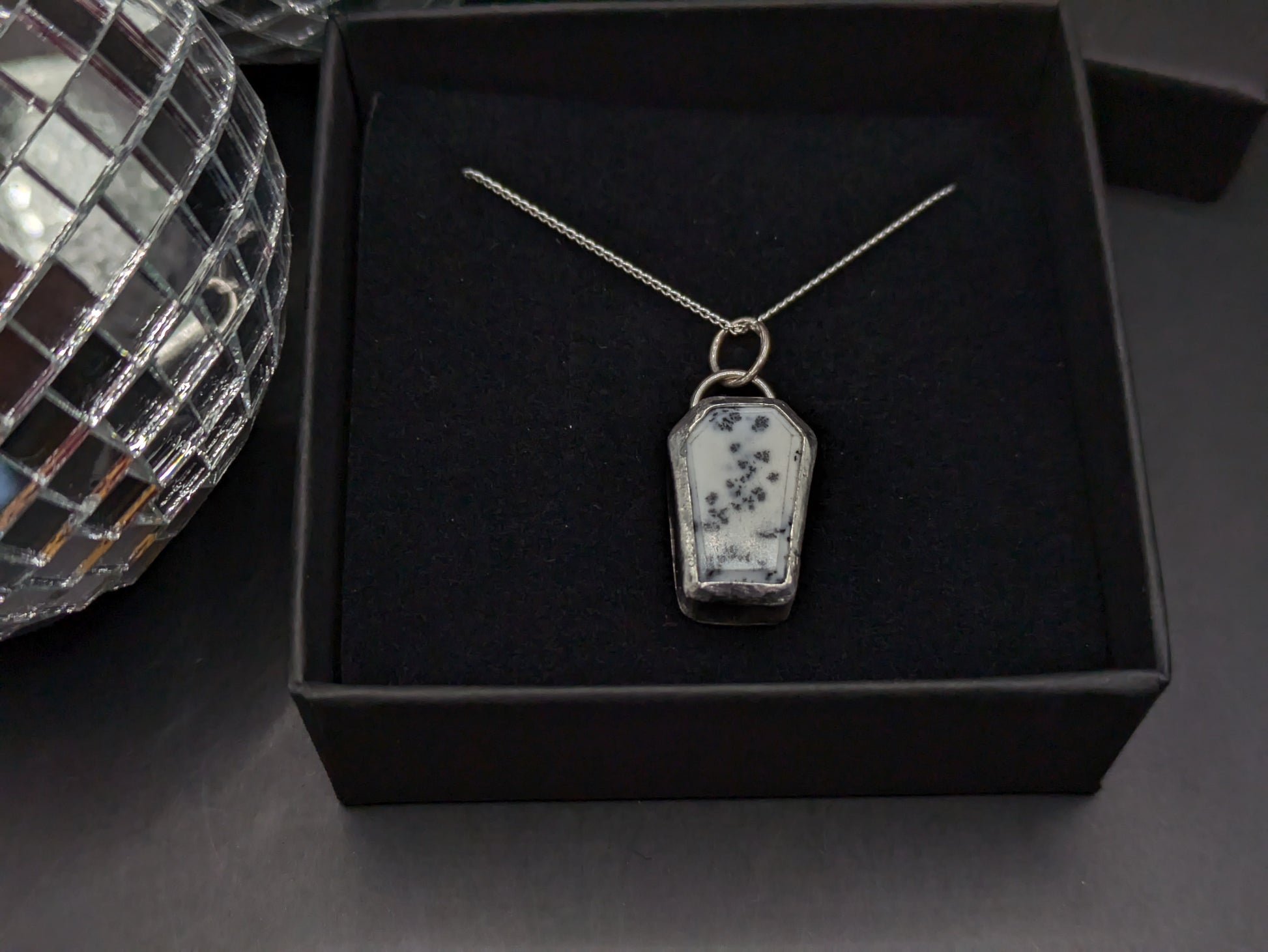 This small but chunky coffin pendant is made from ethically sourced howlite which I have set onto sterling silver and put onto a silver chain