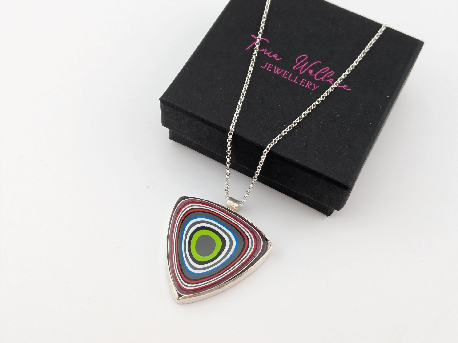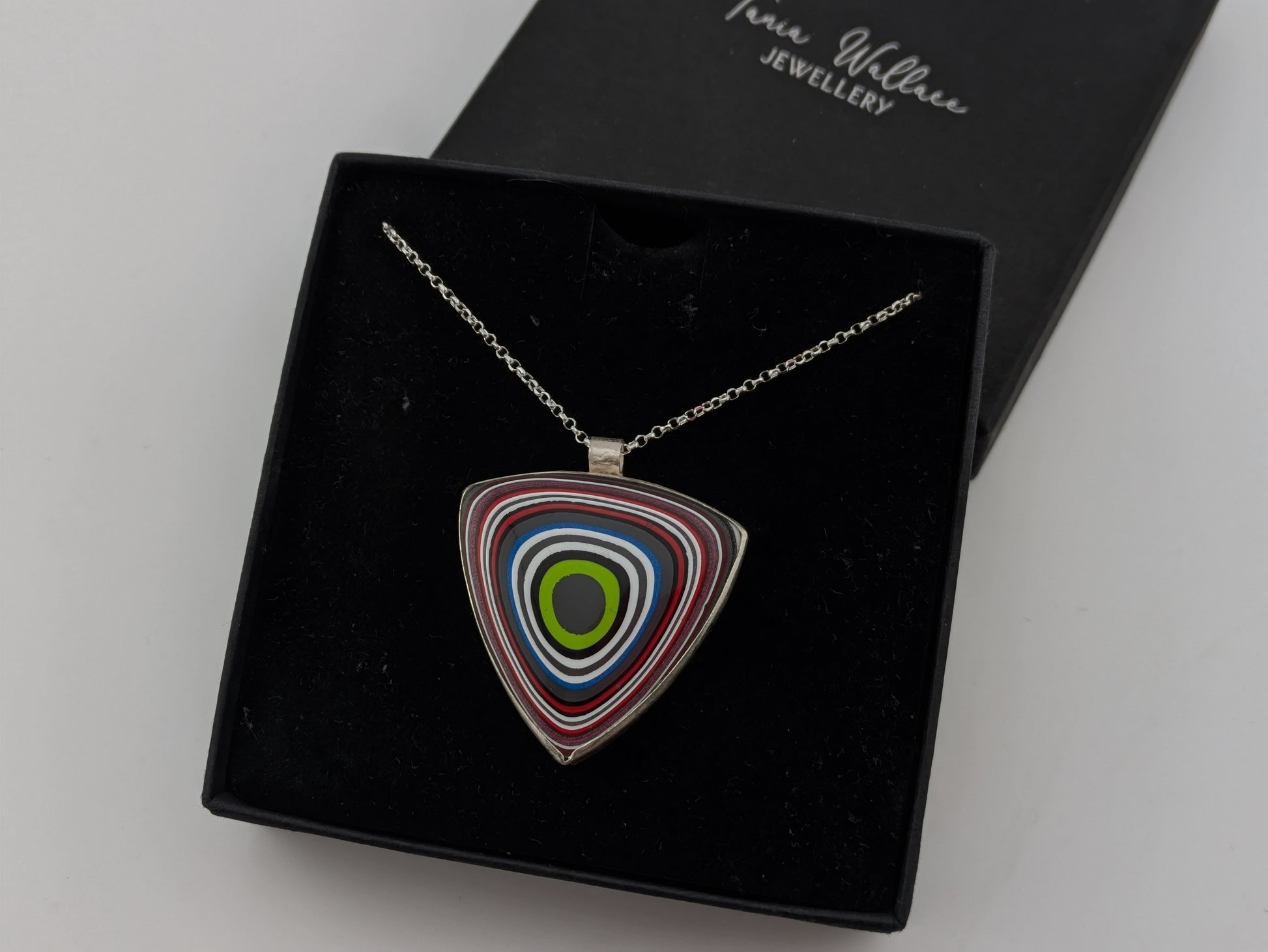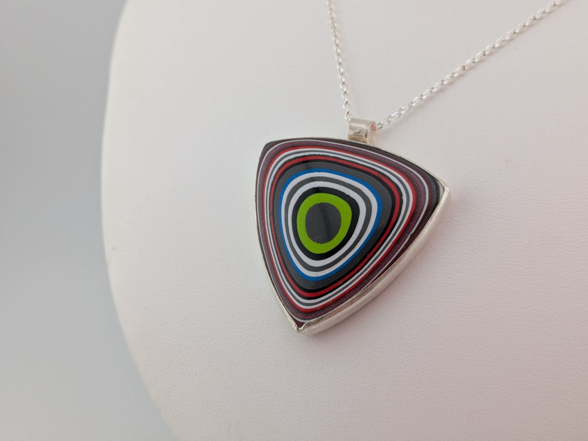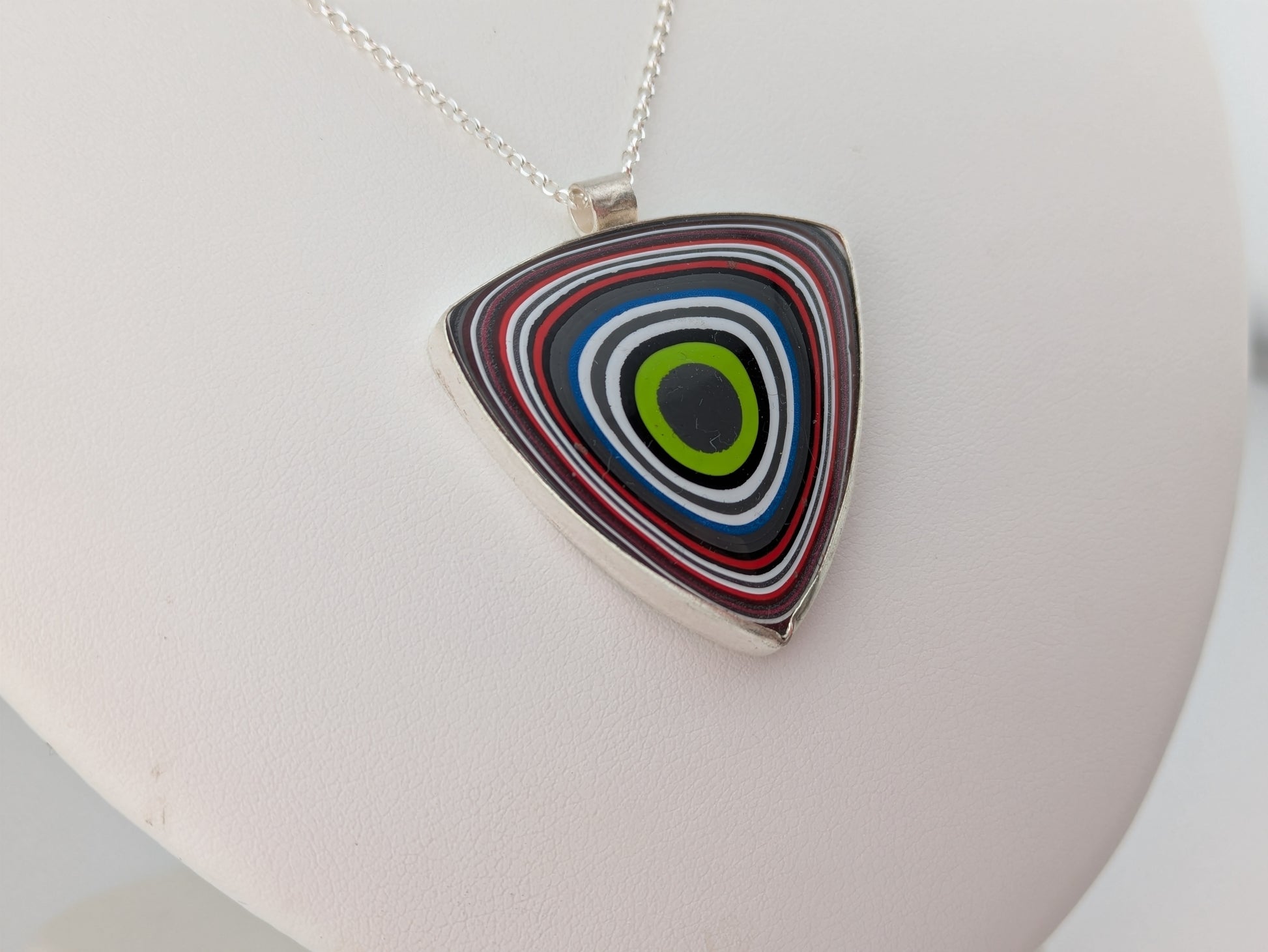 This stunning pendant is made from a piece of material called fordite. Fordite is the overspill of car paint which has been shaped and polished ready for jewelers like myself to make into a beautiful wearable piece.