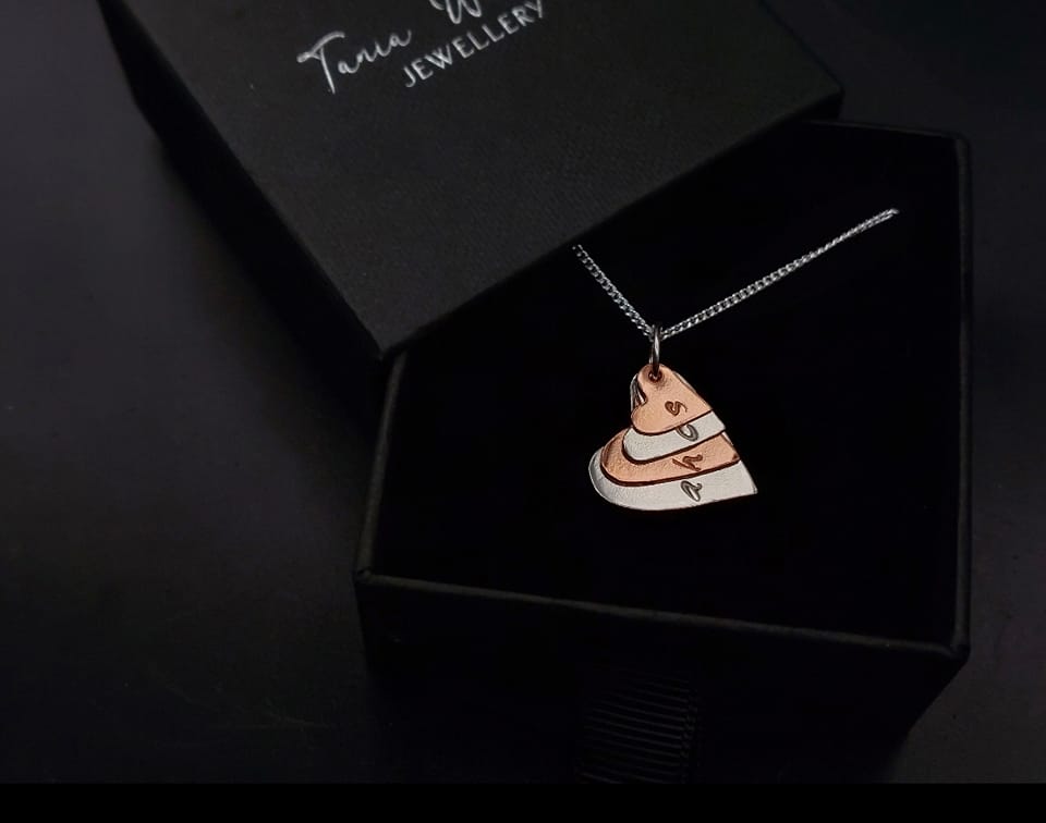 Alternating copper and silver pendant made with hand carved heart shaped pendants. Each heart has an initial stamped into it representing each family member of the recipient of this pretty pendant.