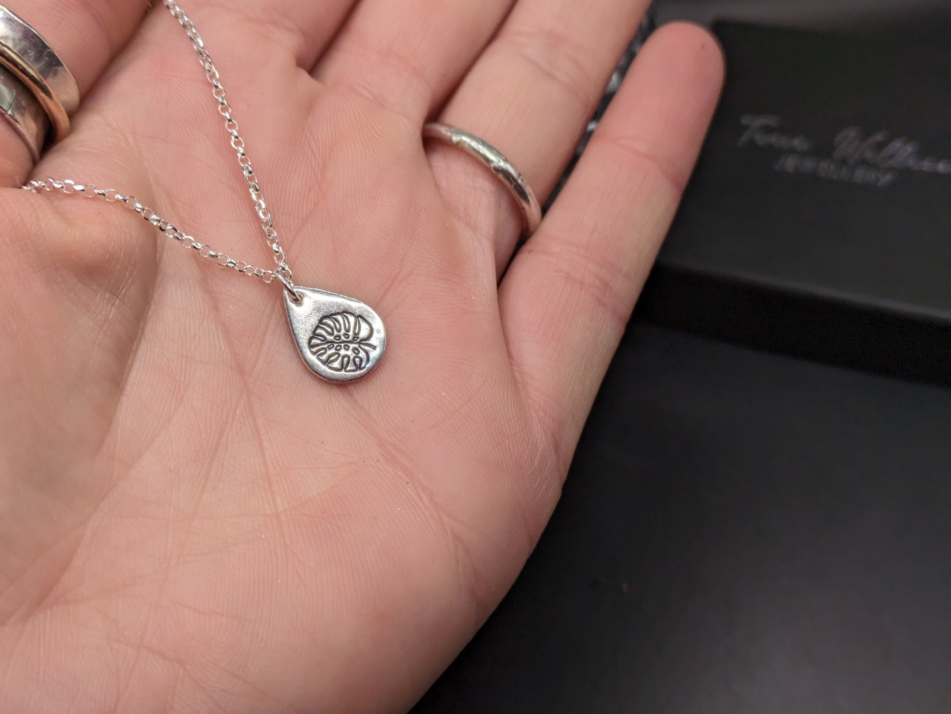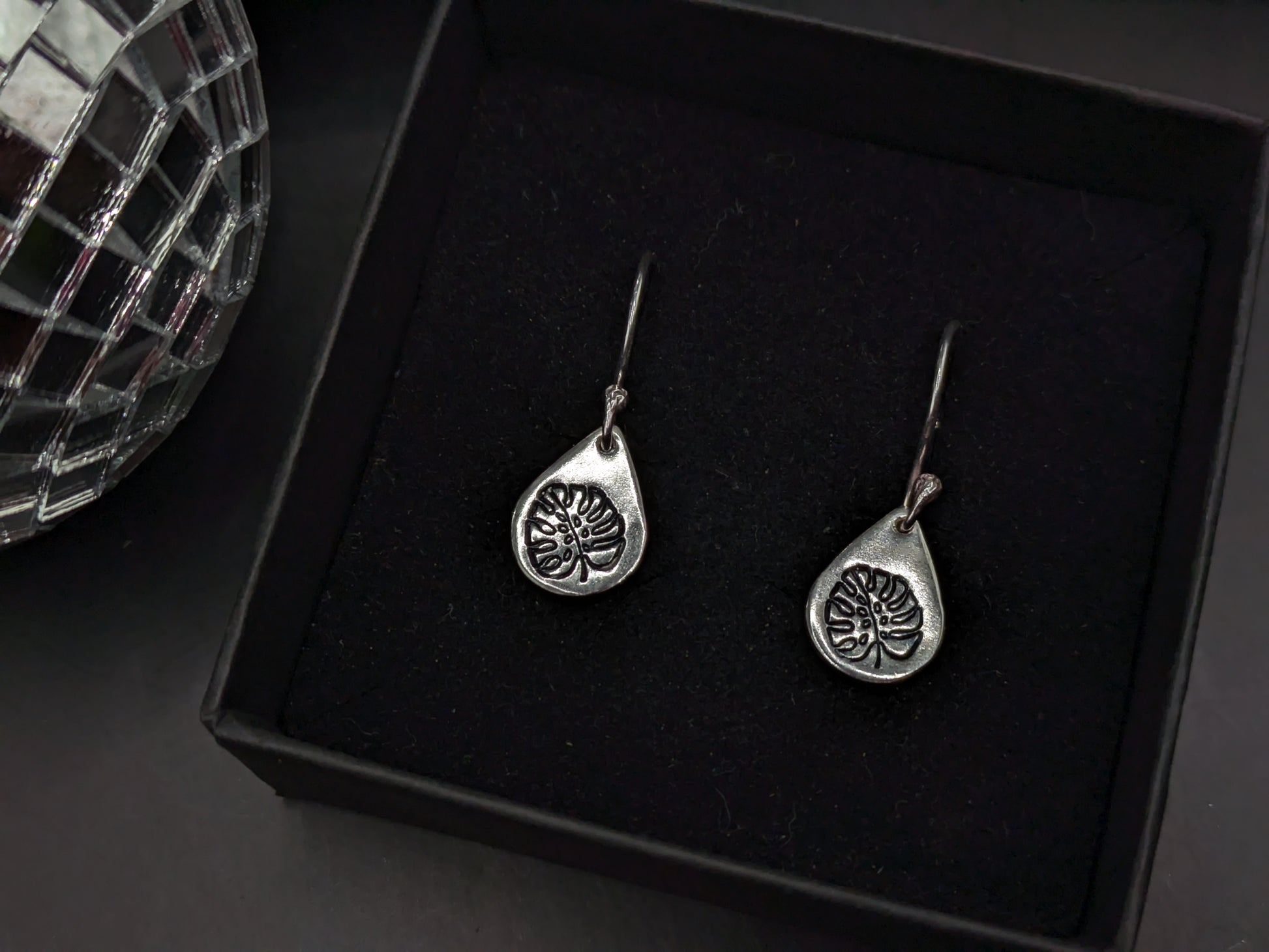 Dainty teardrop shaped sterling silver pendant and earrings with hand punched leaf pattern darkened with enamel to highlight the detail.