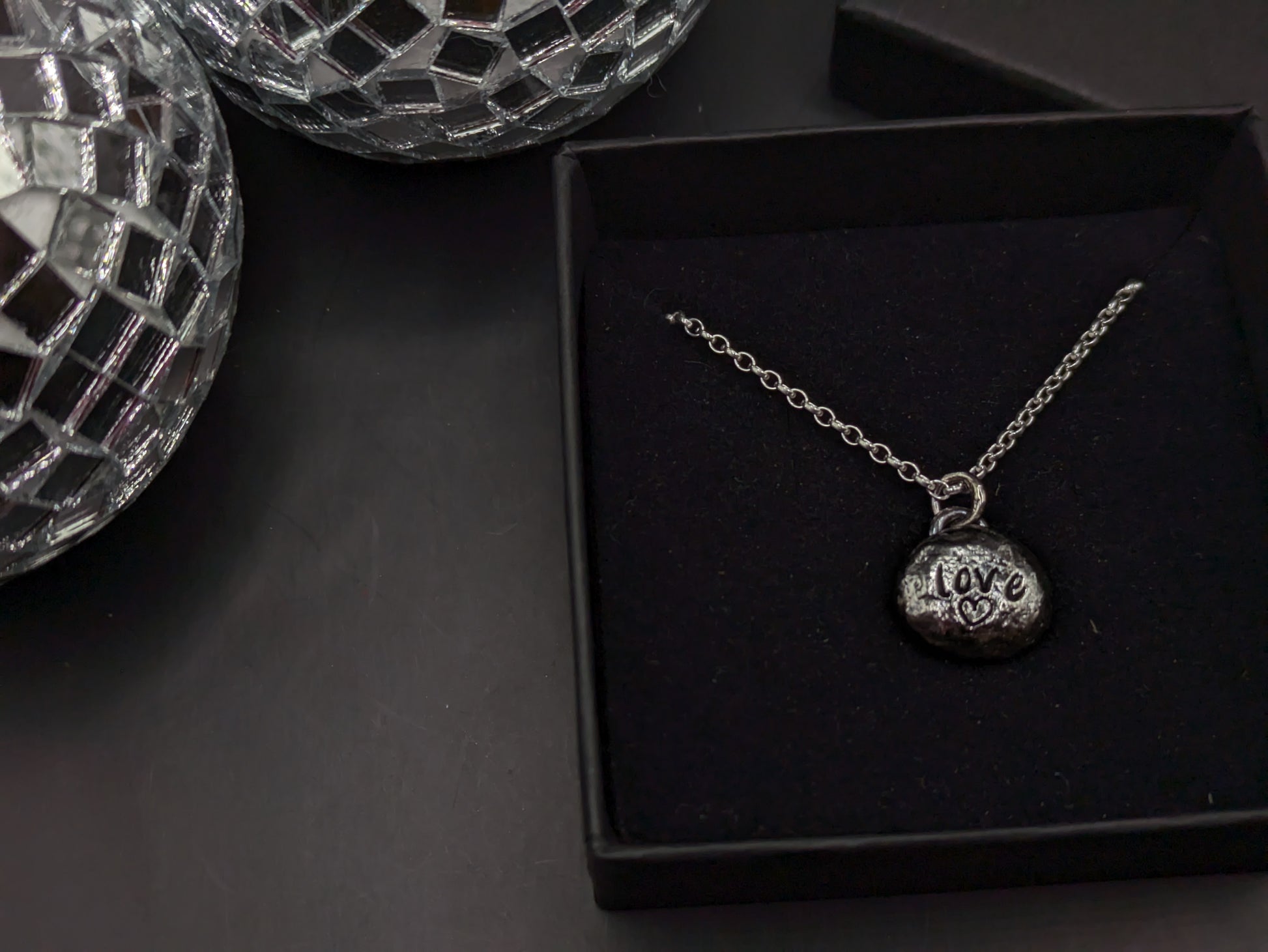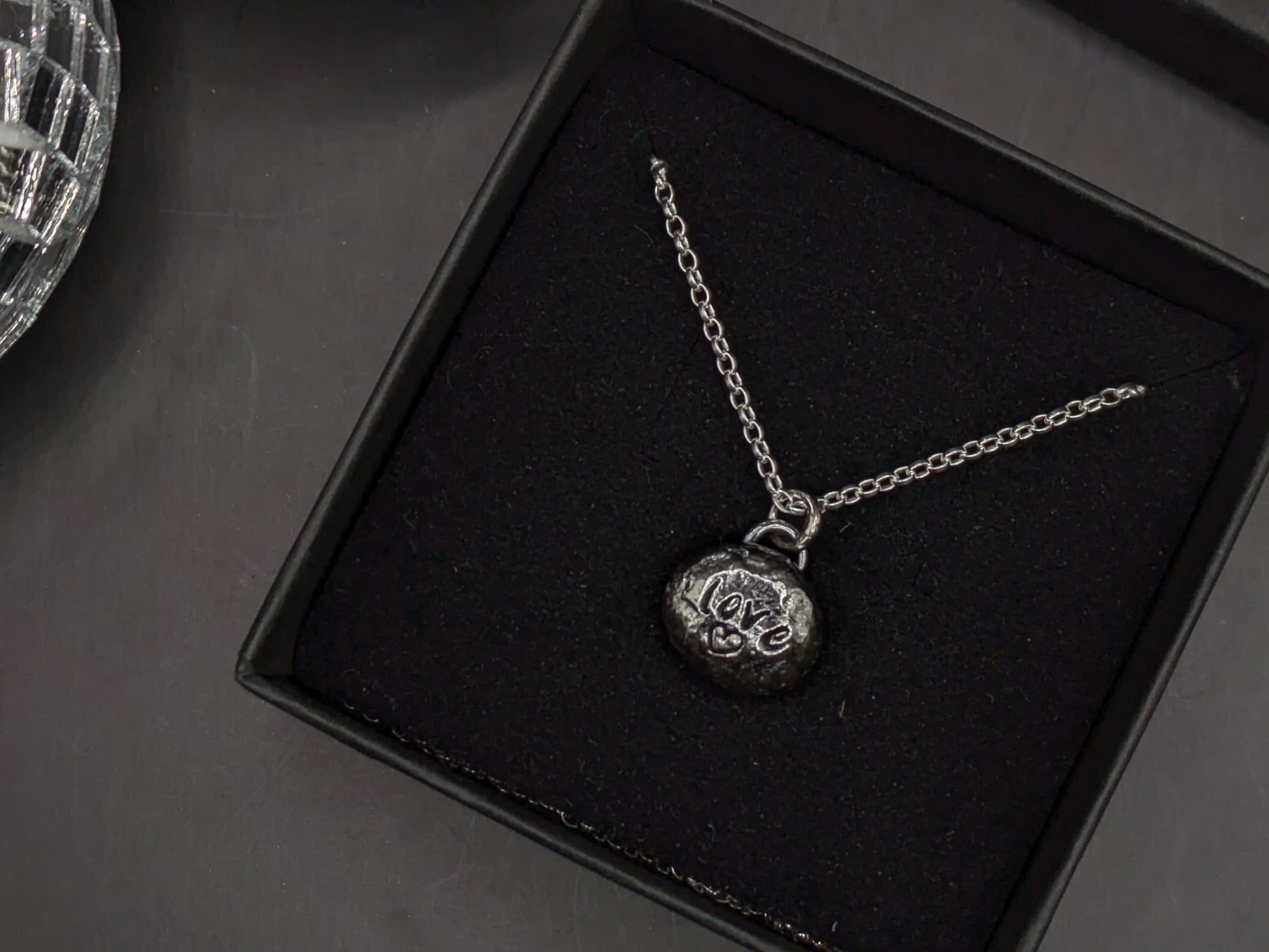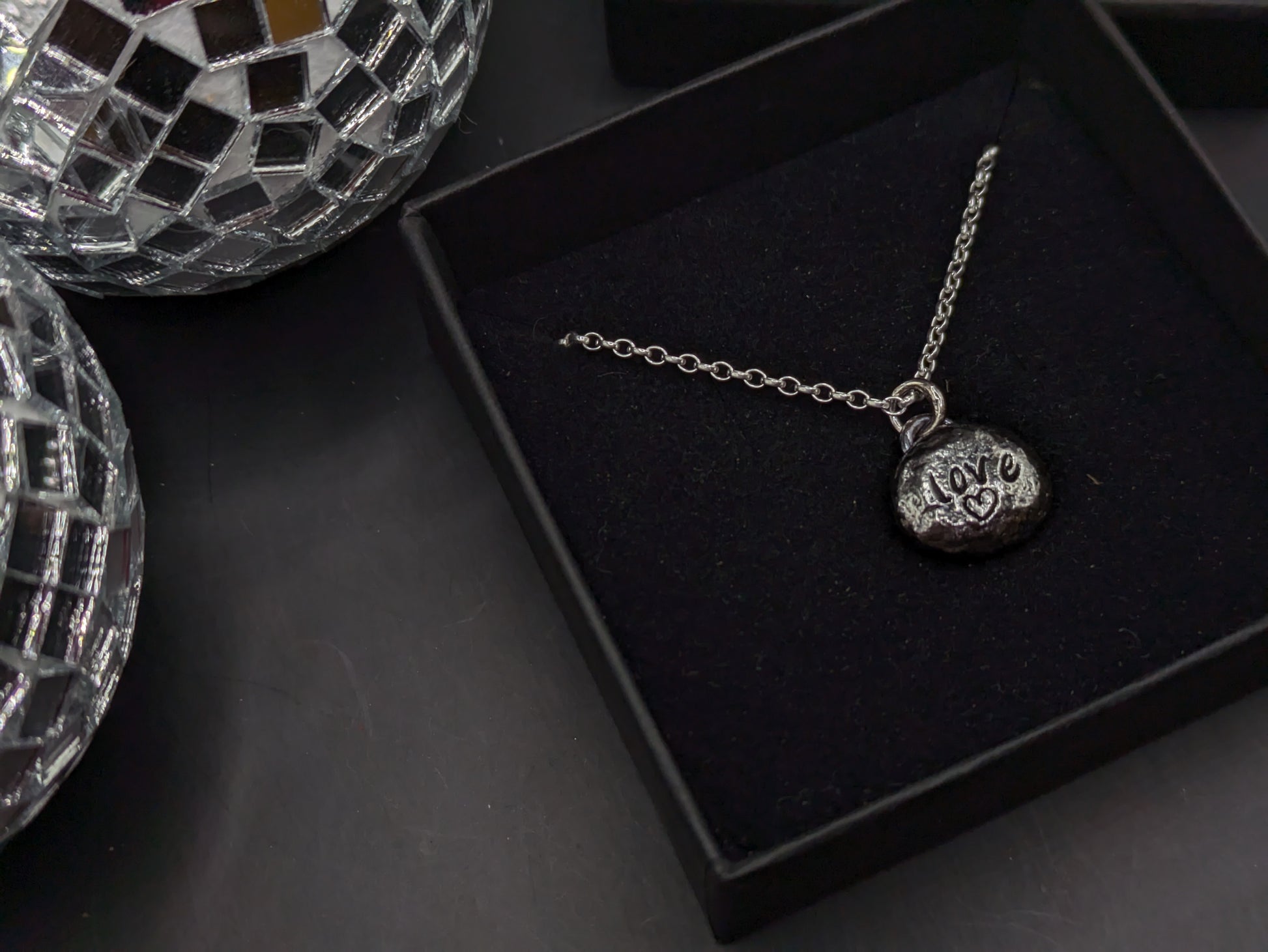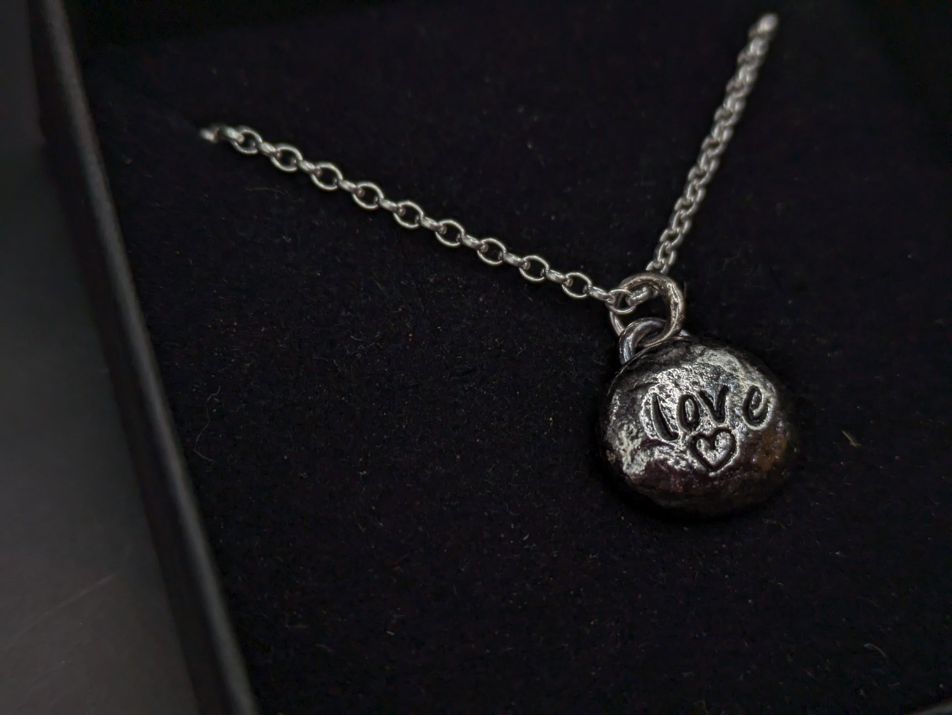 I make these 'pebbles' by melting down the offcuts until they form a molten blob of silver, I then create the impression into the silver, attach the hoops (bail) at the top for the chain, and voila!