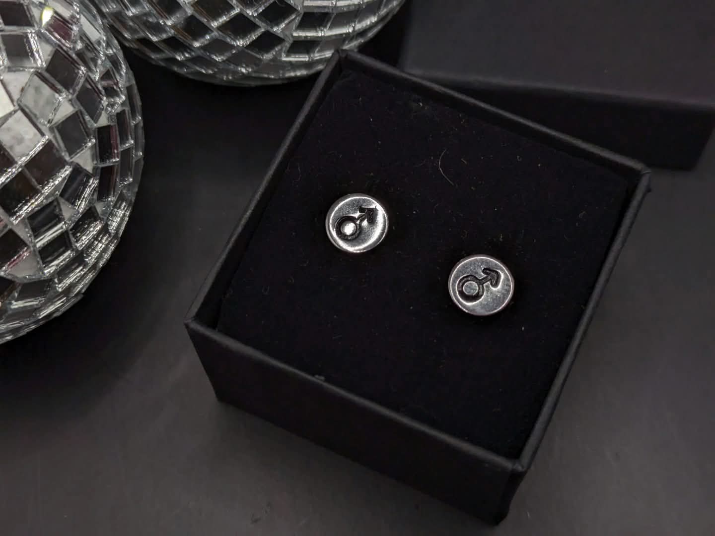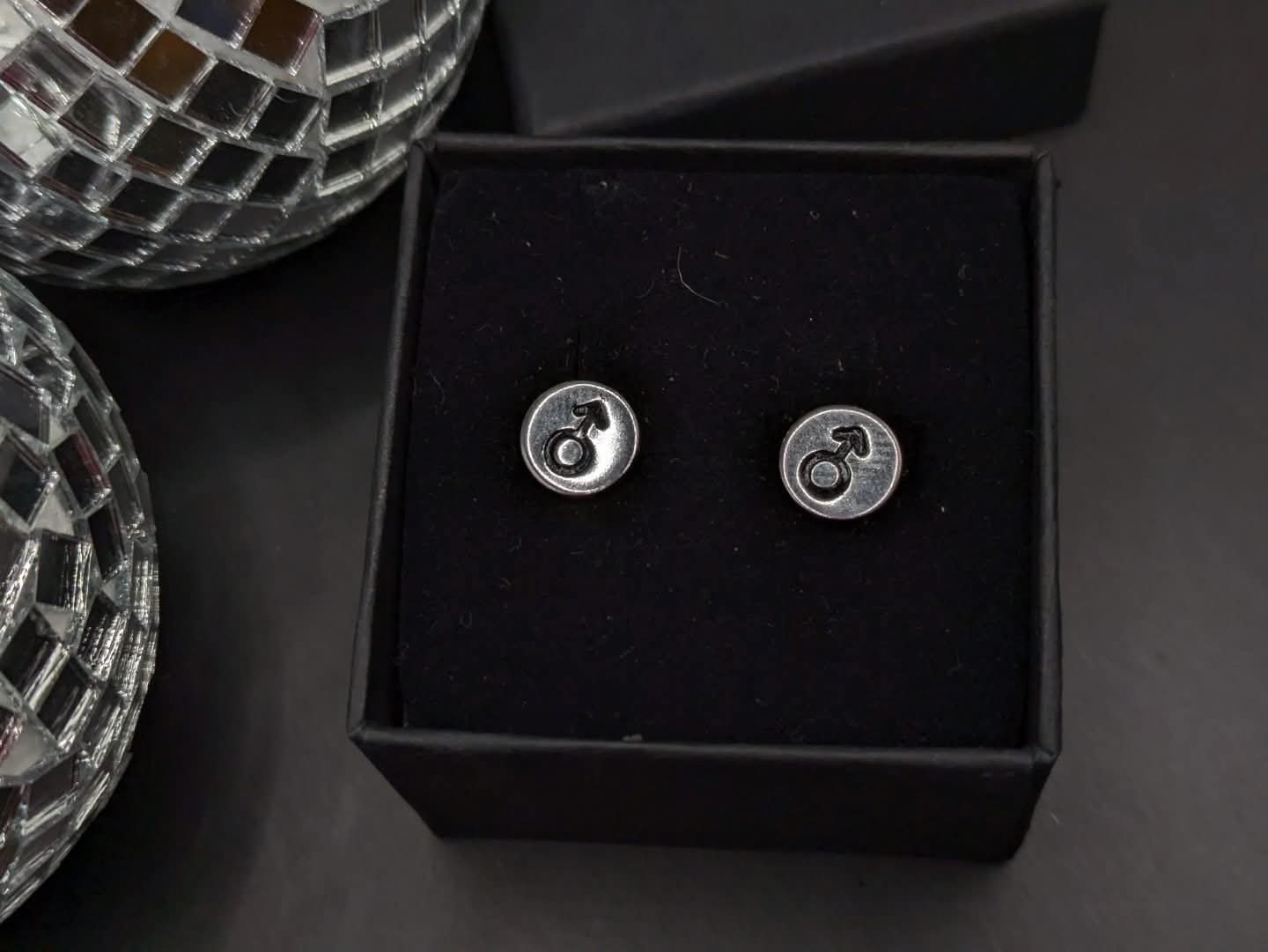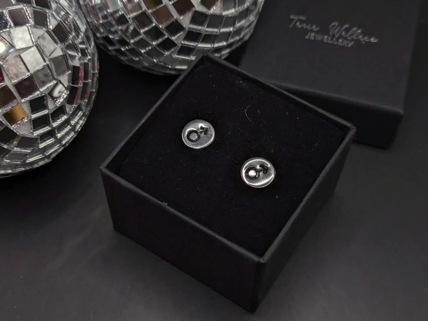 Sterling silver disc studs with hand pressed male symbol darkened with enamel paint.