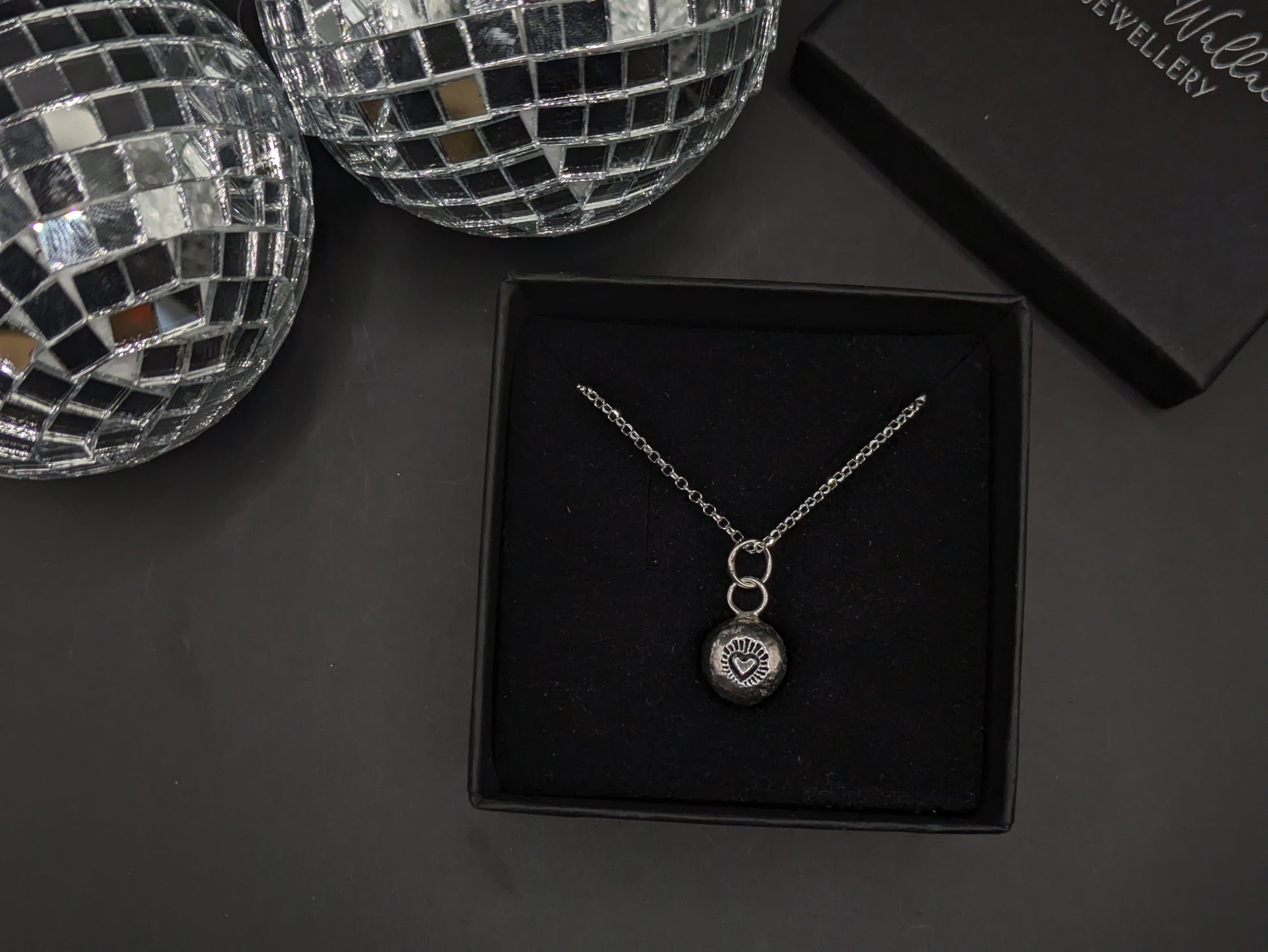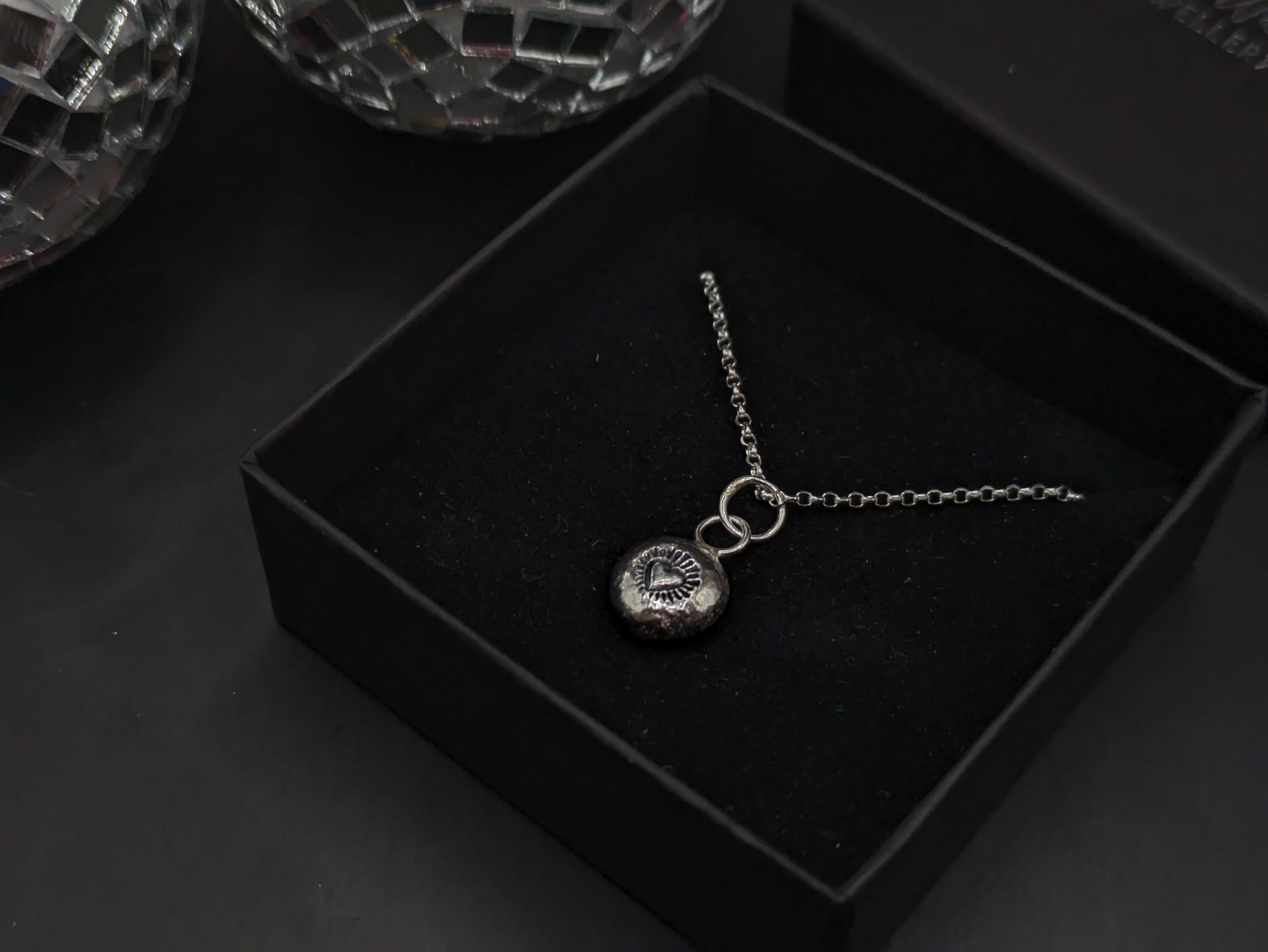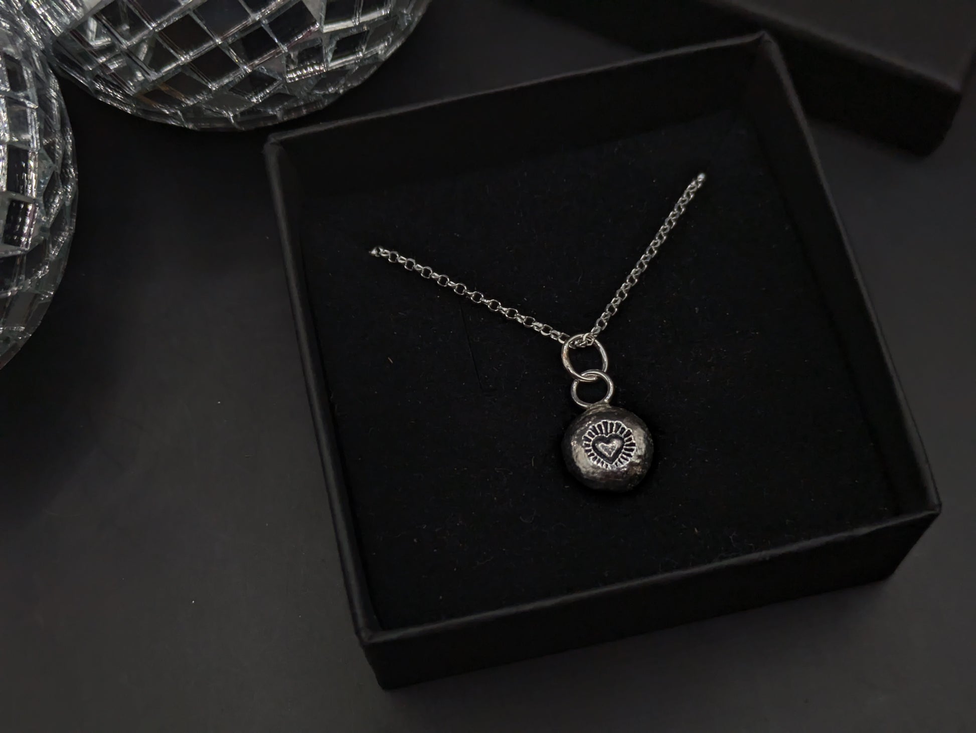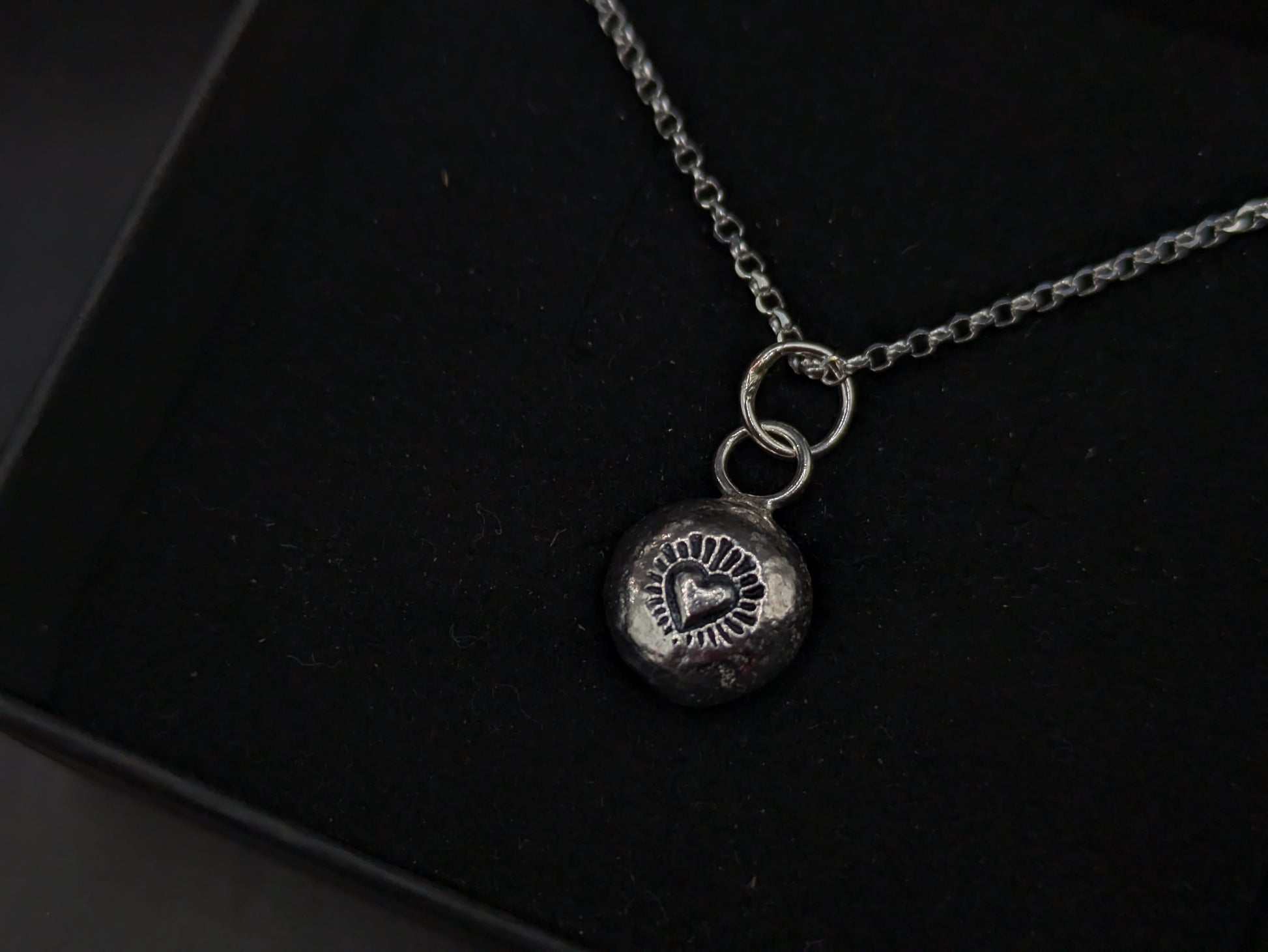 Gorgeous molten solid silver pendant with starburst heart stamp which I have coated in black enamel.