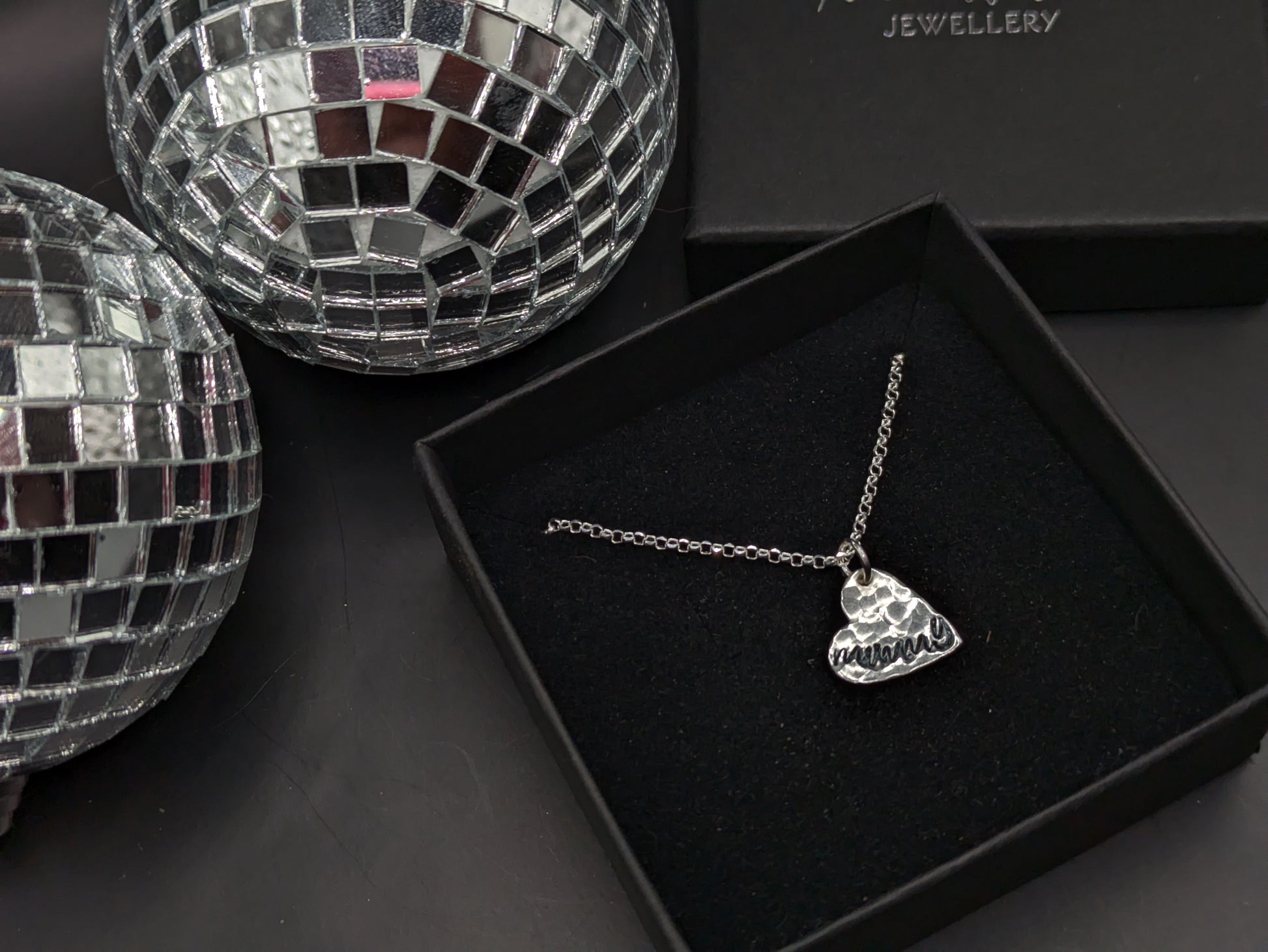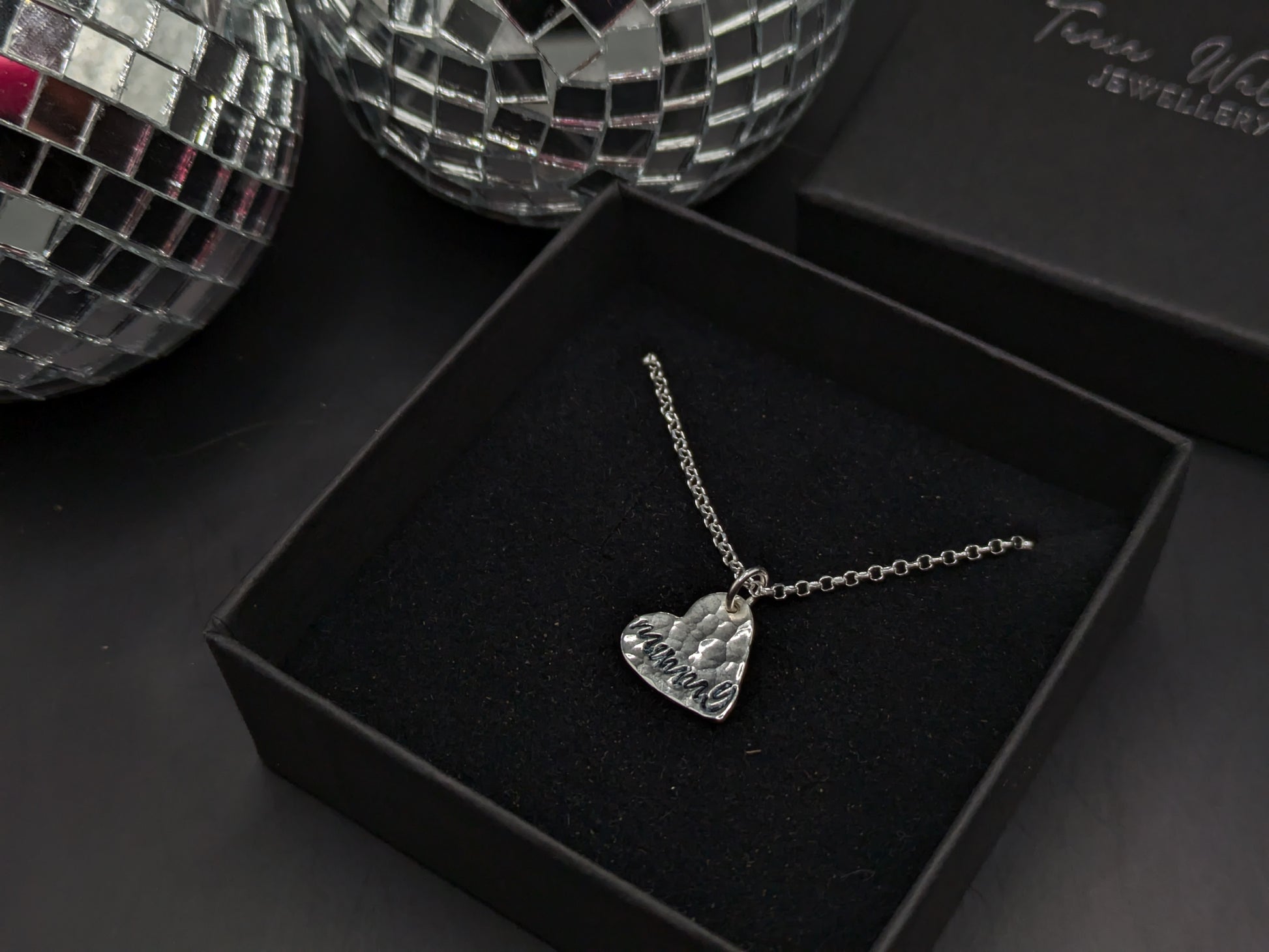 Pretty little heart shaped sterling silver pendant on a silver chain. The heart has been gently textured, stamped and polished up to a high shine. It measures approximately 10mm wide.