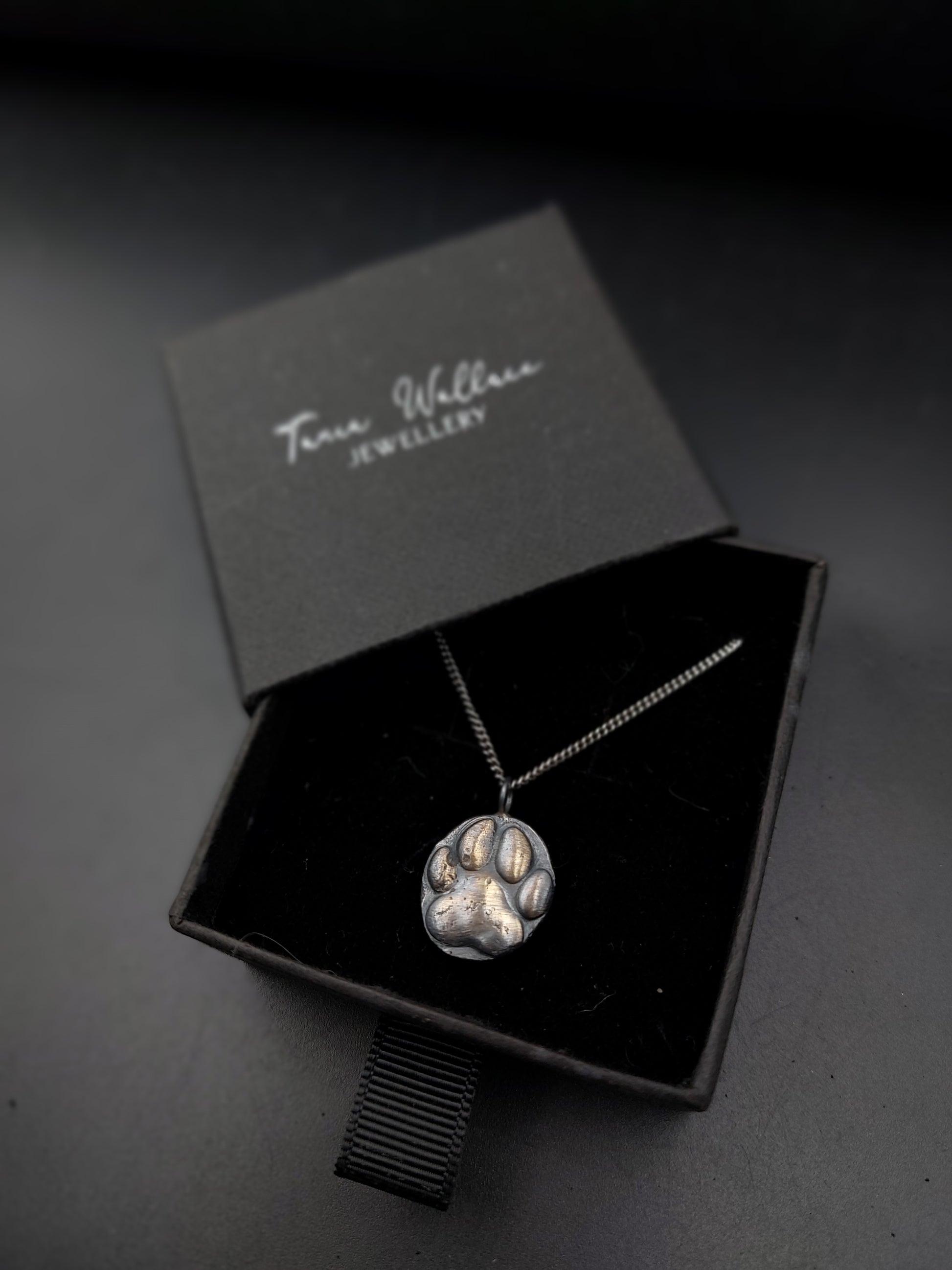 Solid silver pendant with an impression of a paw print! I have pressed the silver by hand and oxidised it to highlight the detail of the pawprint.