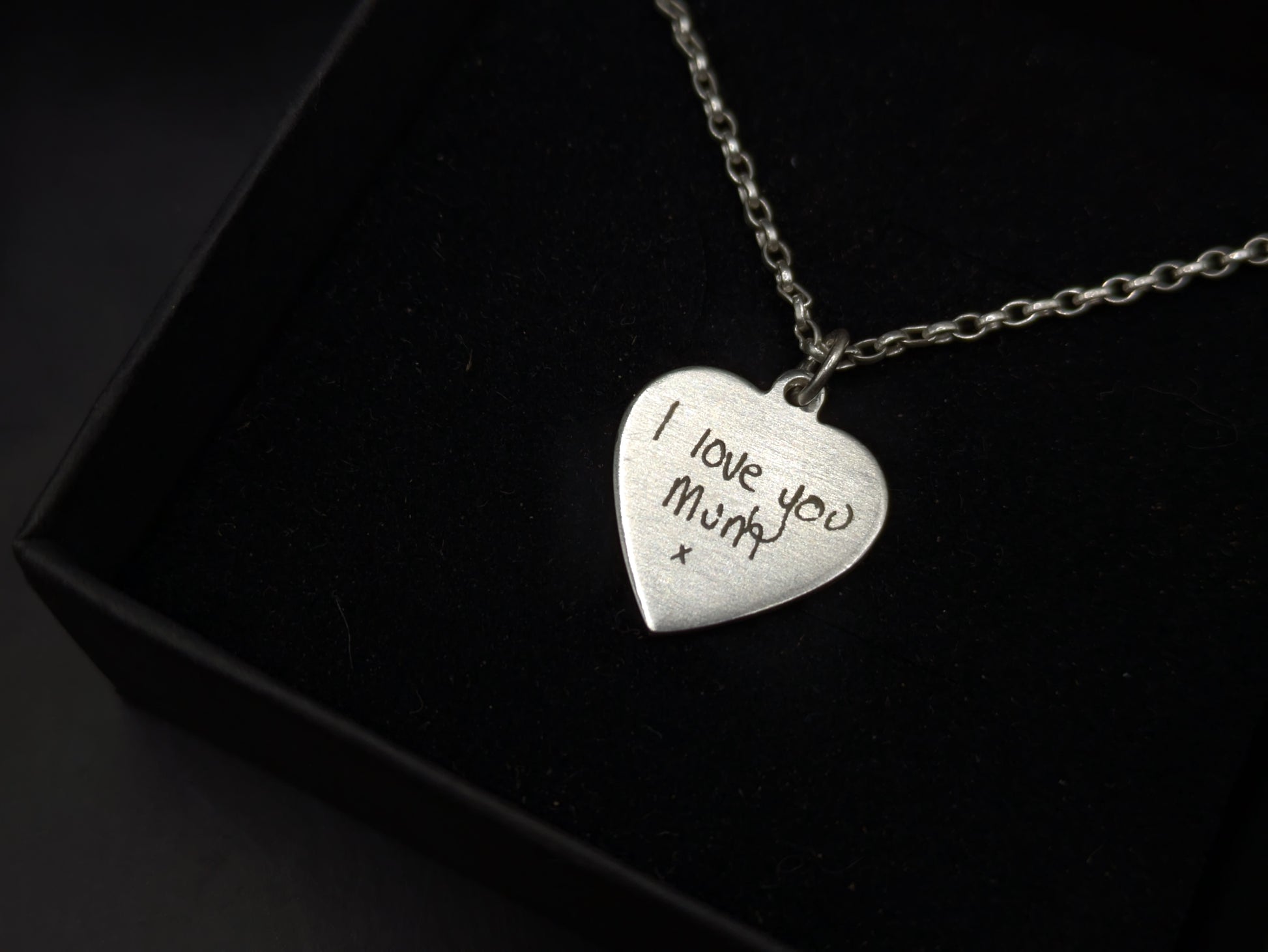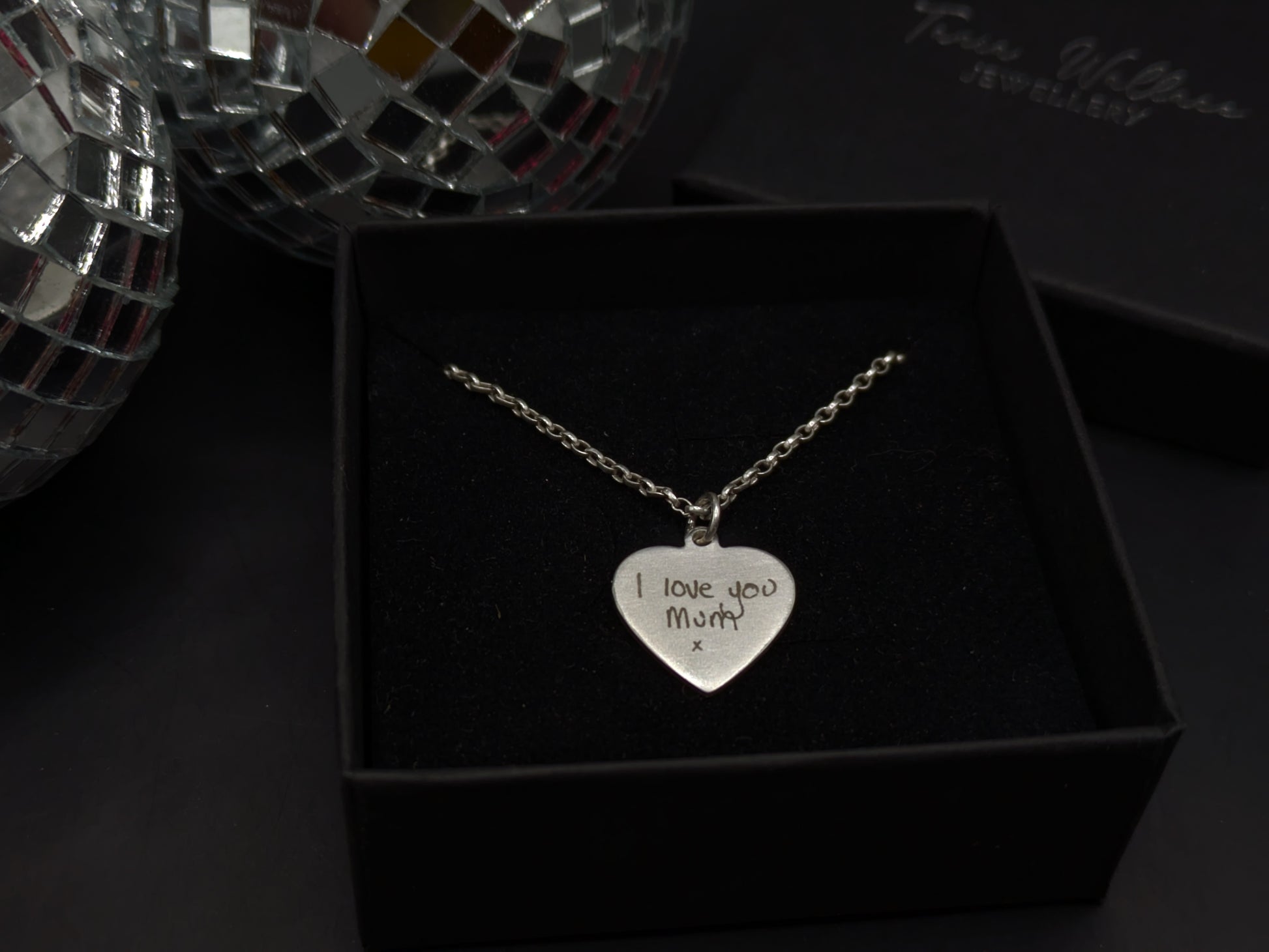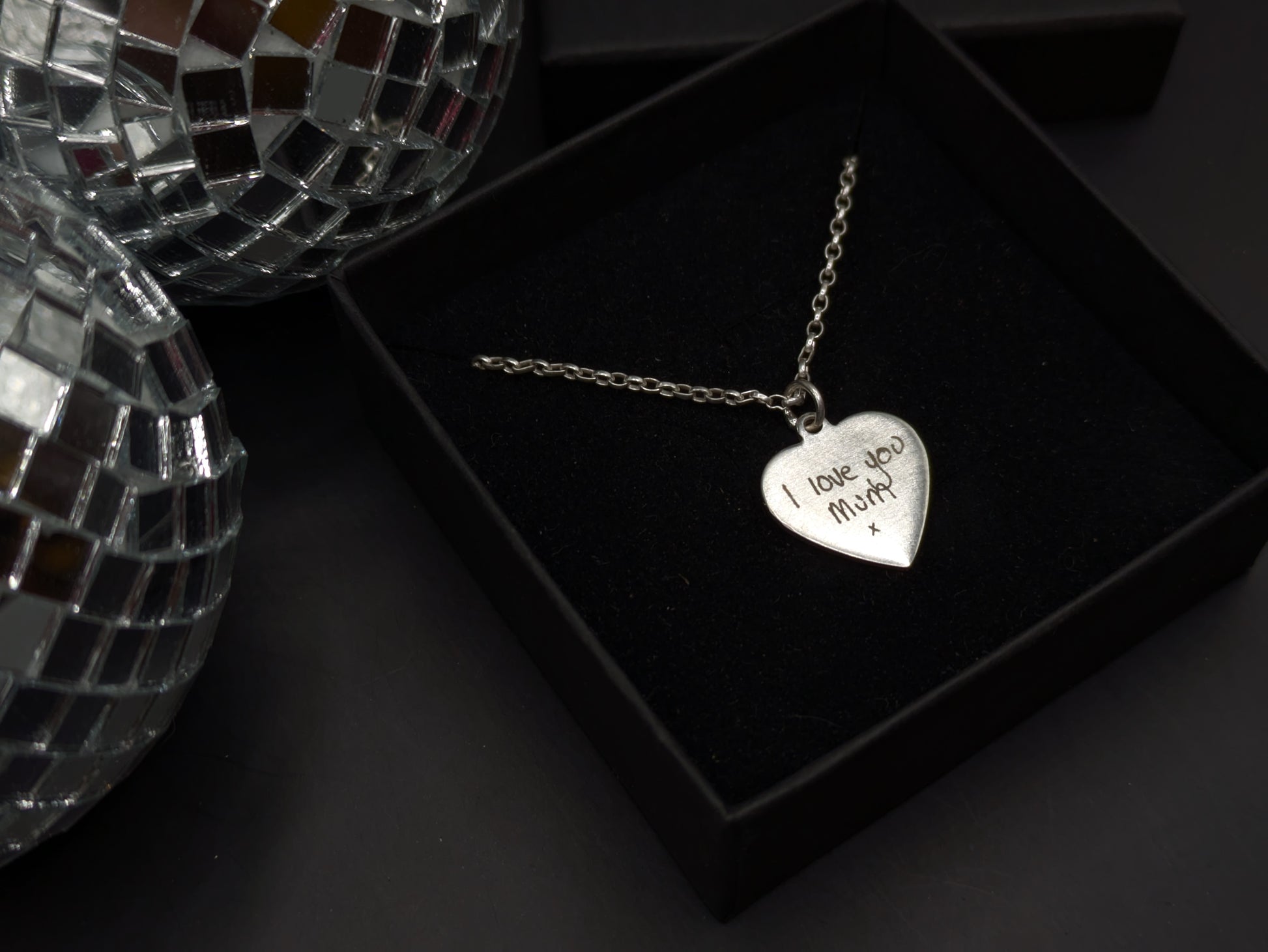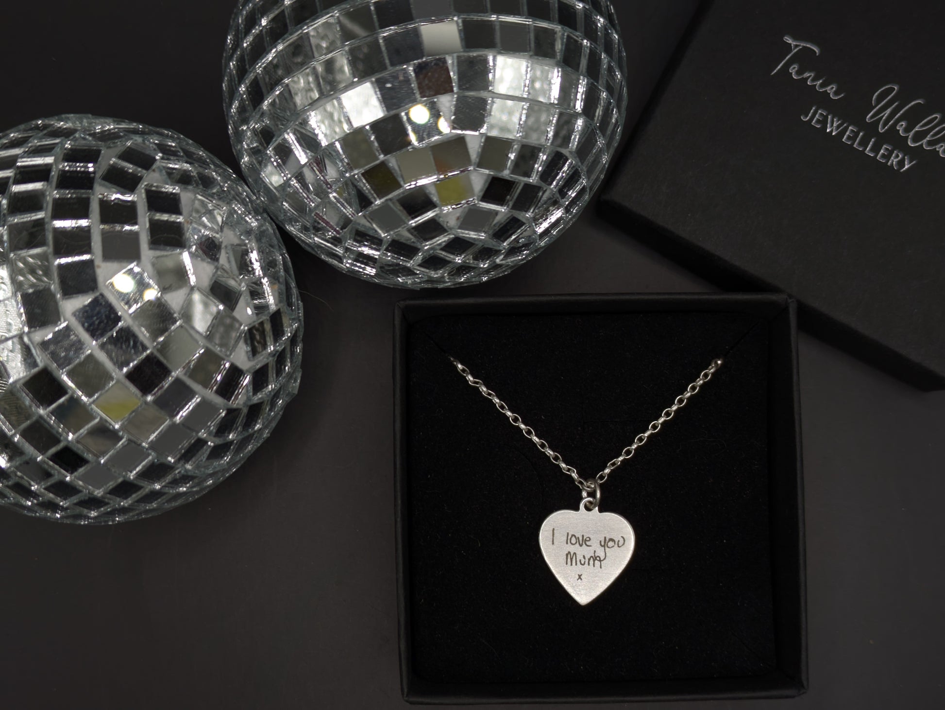 A gorgeous sterling silver heart shaped pendant on a chain with your choice of text, font or image.