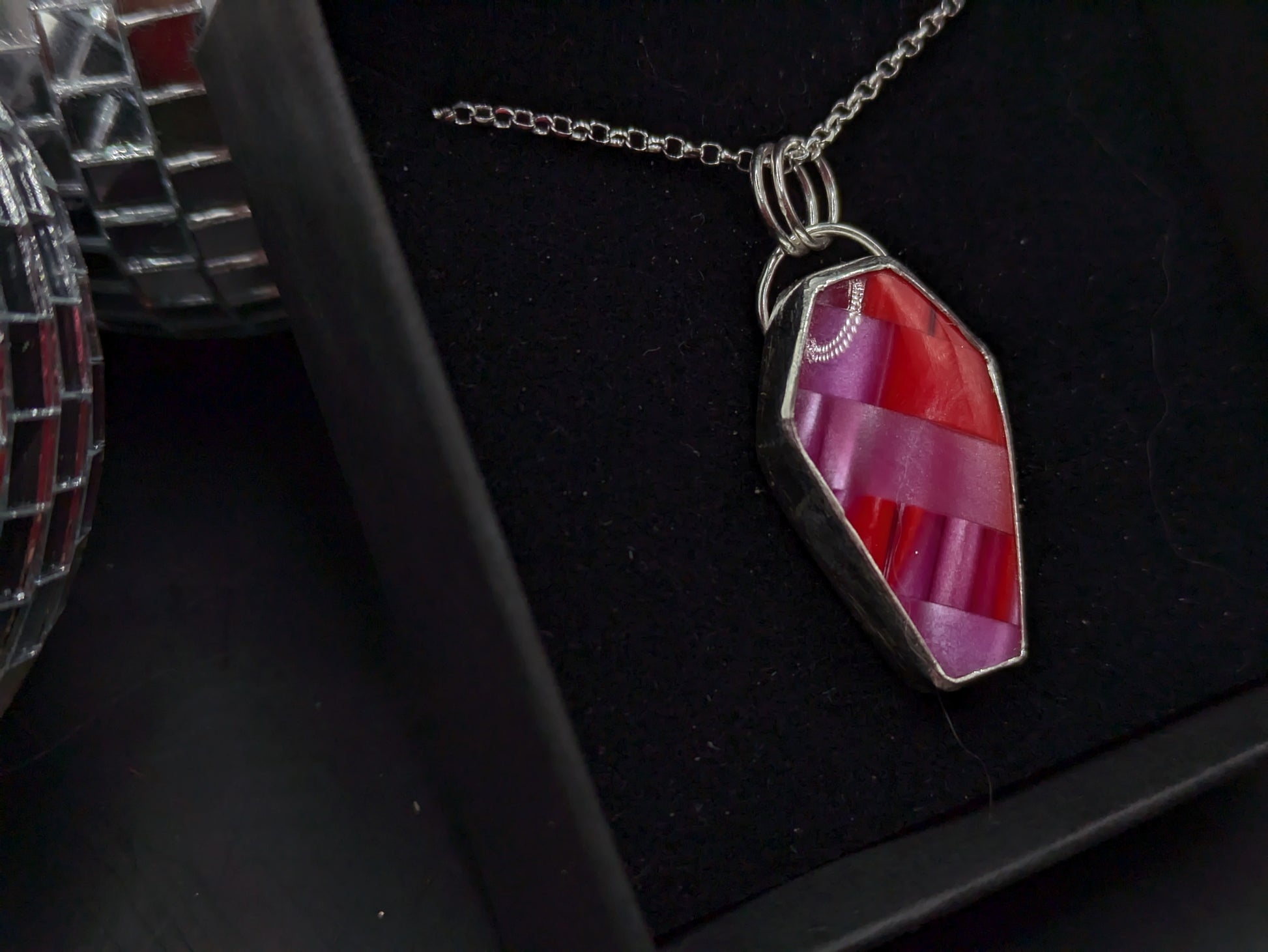 Gorgeous new coffin pendant handmade from crisscrossing pink acrylic and set into sterling silver. What you can't see is the shimmer that is in the pale pink enamel. It's so so pretty yet with an edge ⚰️
