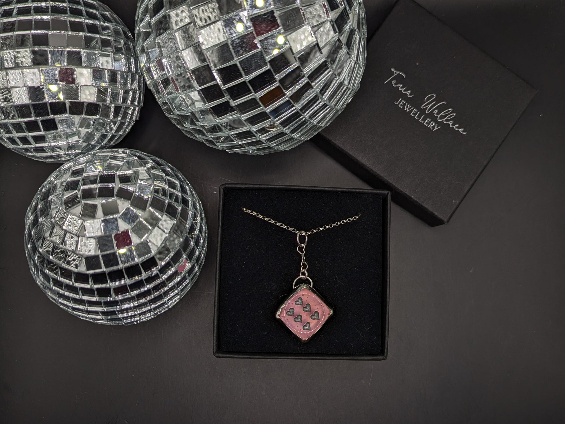 The dice dots are little hearts and I've put the set dice onto a piece of dainty sterling silver heart chain for extra pazazz!