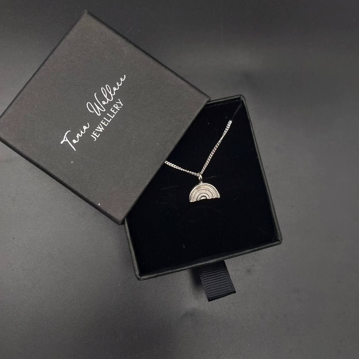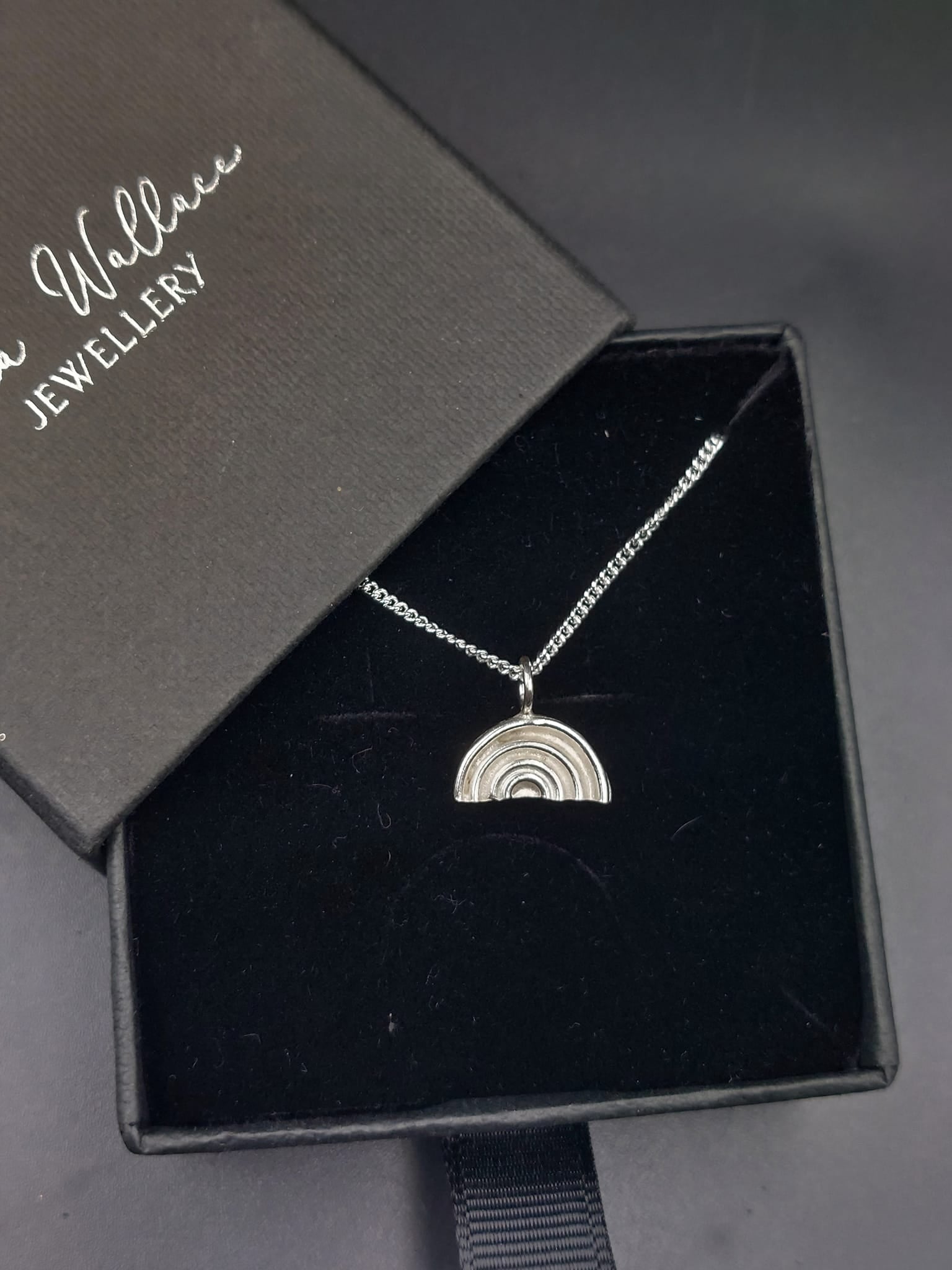 Cute rainbow style pendant made from sterling silver wire and set onto sterling silver sheet, measuring approximately 1-1.5cm long.