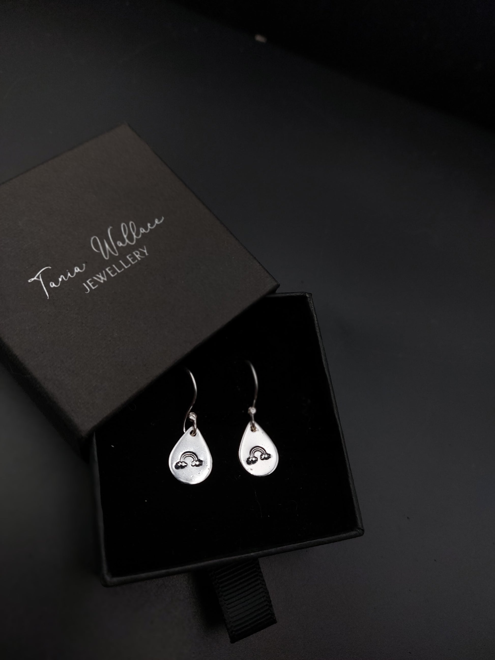 Teardrop shaped sterling silver earrimgs stamped with a rainbow design.