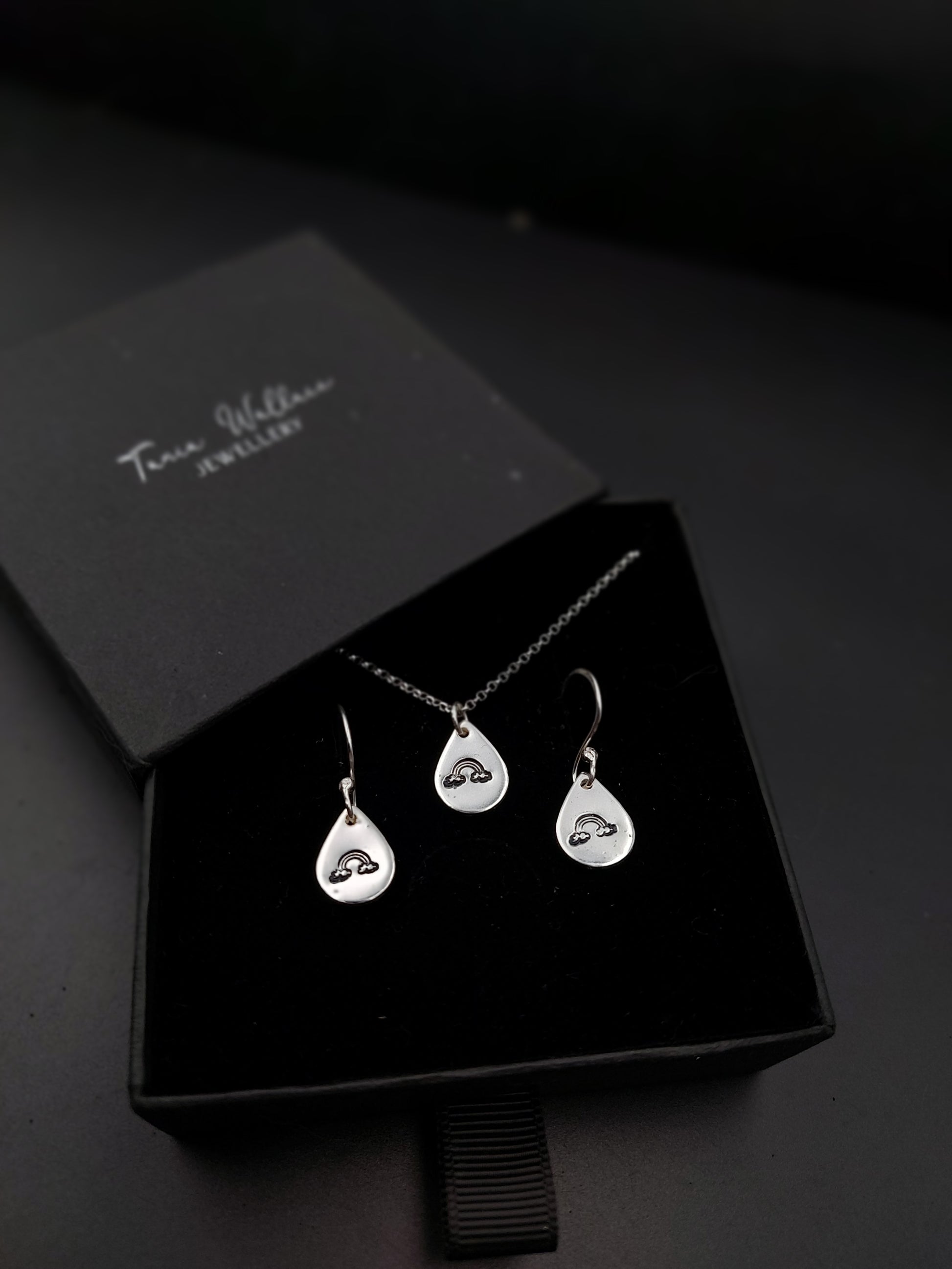 Teardrop shaped sterling silver pendant and earrings stamped with a rainbow design.