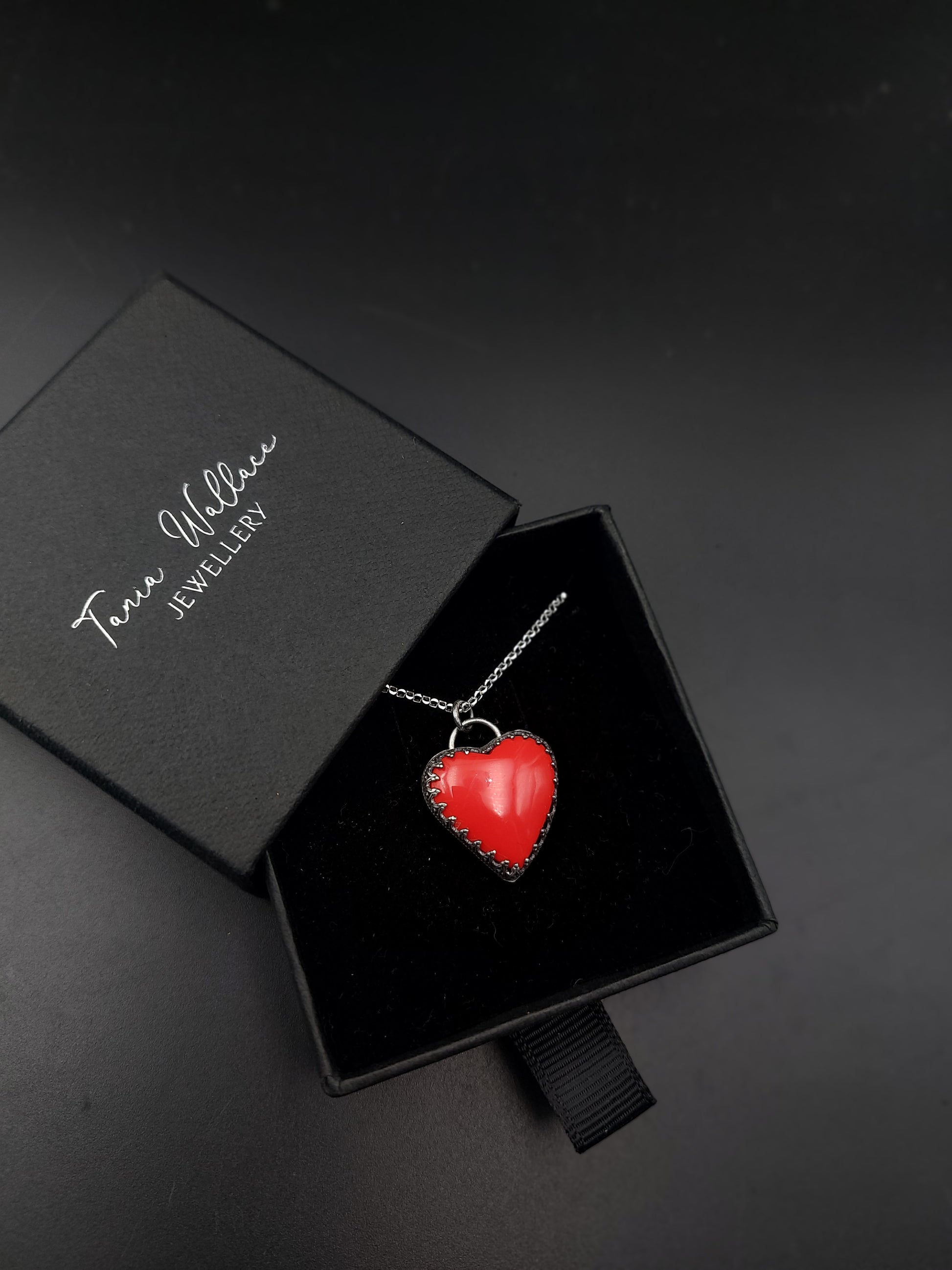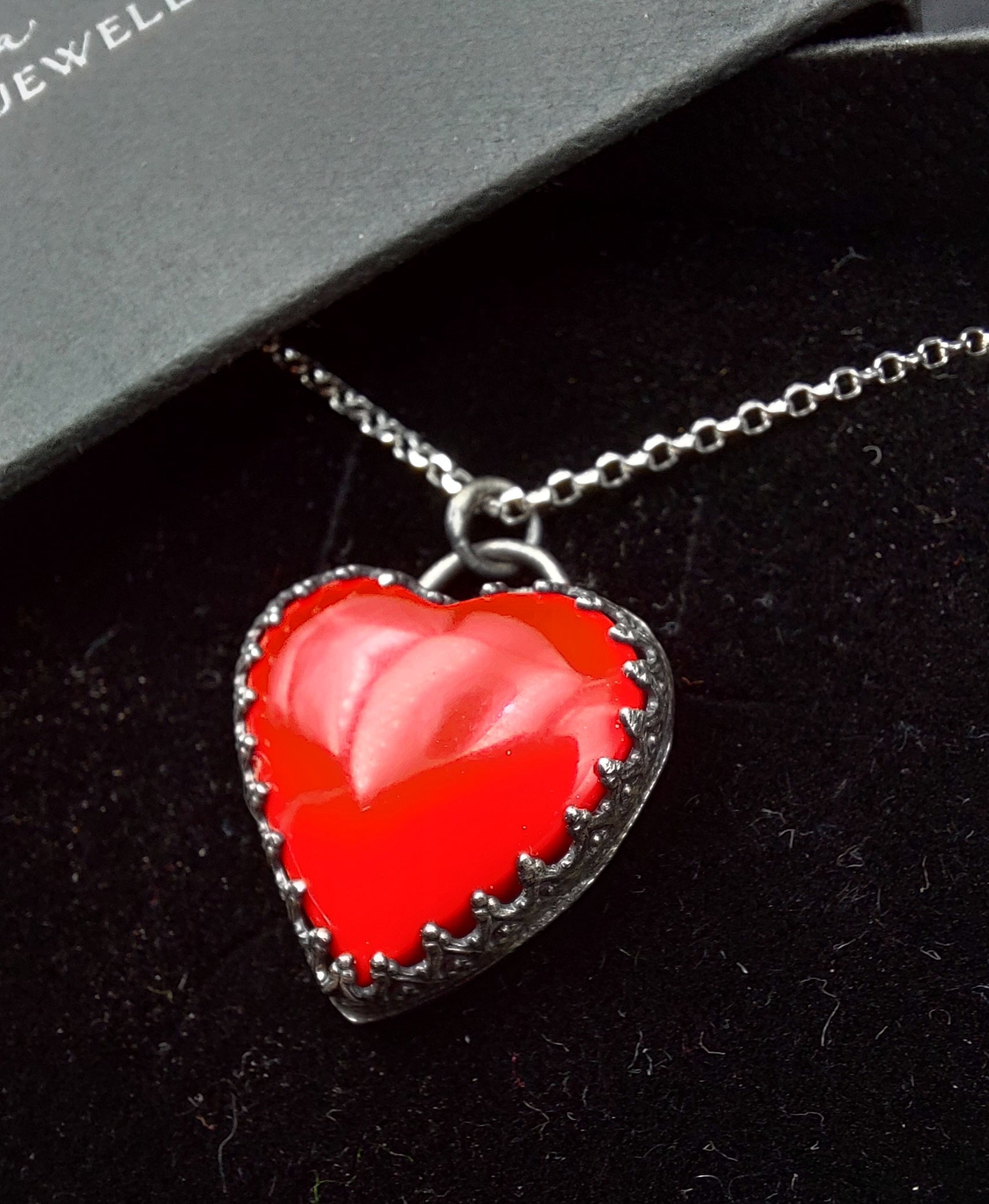 The gorgeous red heart has been hand made into a beautiful puffed heart (not by my hands, unfortunately!) Which I have set onto sterling silver amd used a pretty heart designed wire to hold it in place.