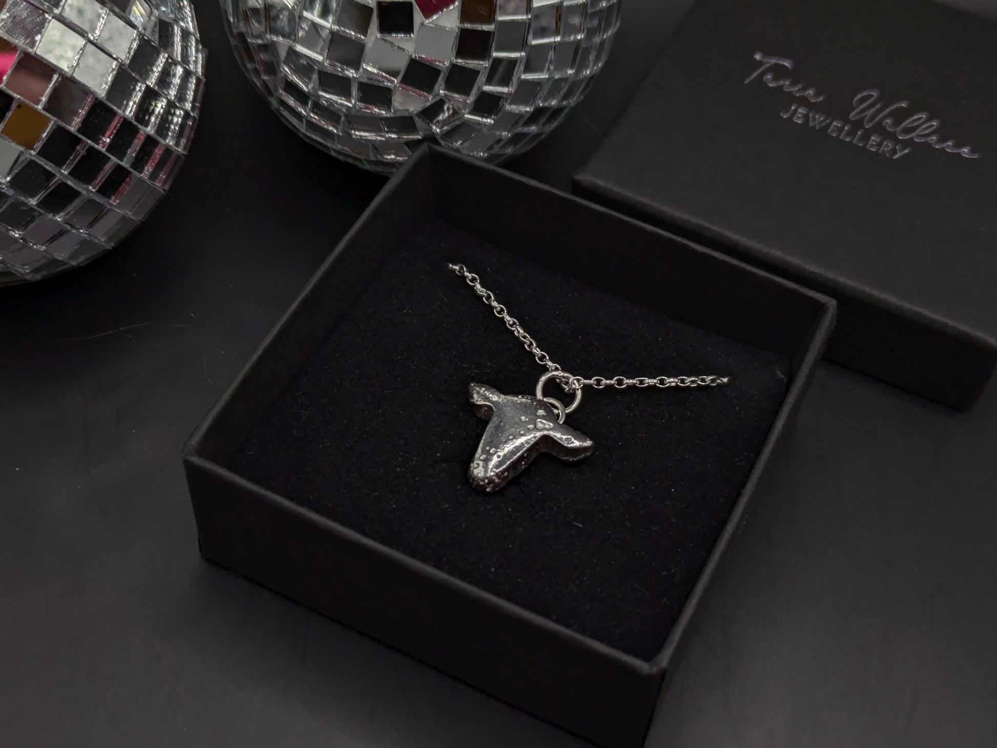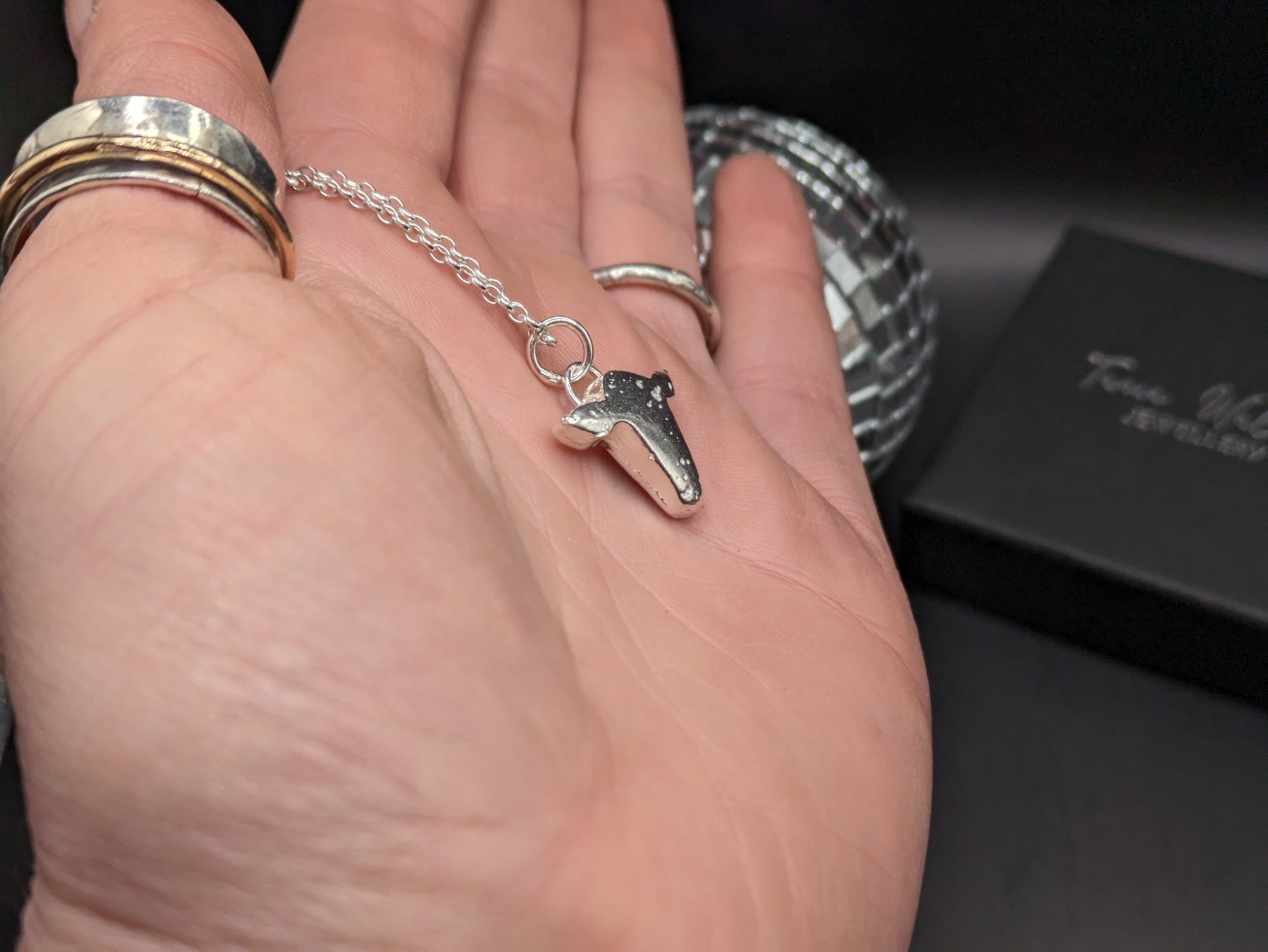 He is approximately 2.5 cm wide and comes on a sterling silver chain.