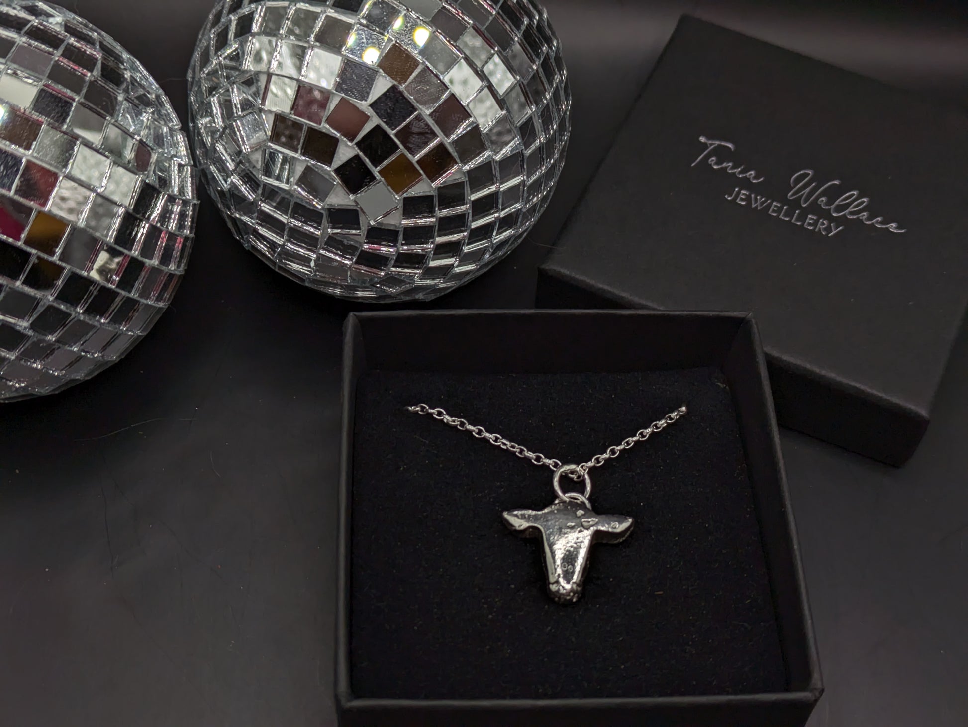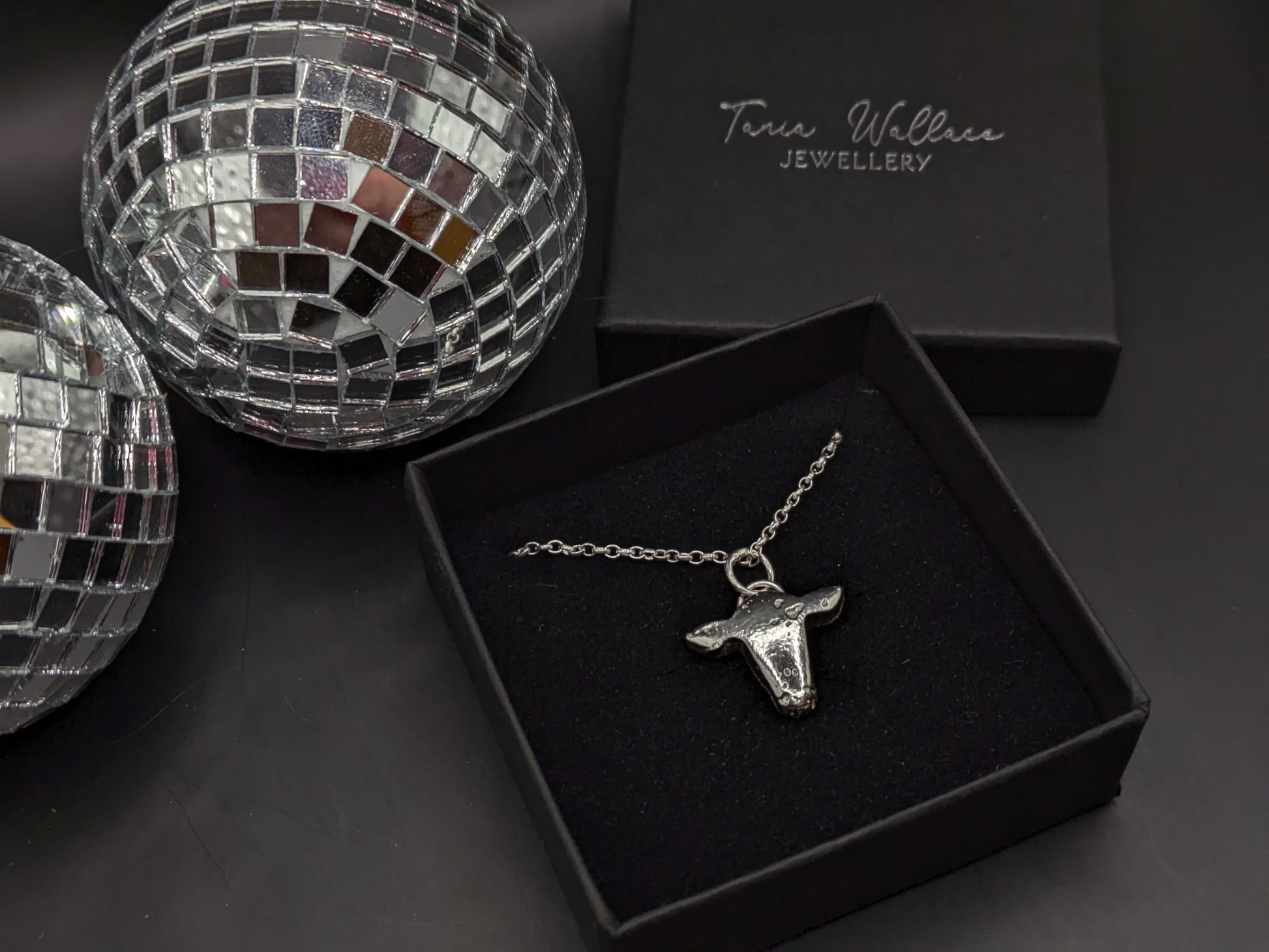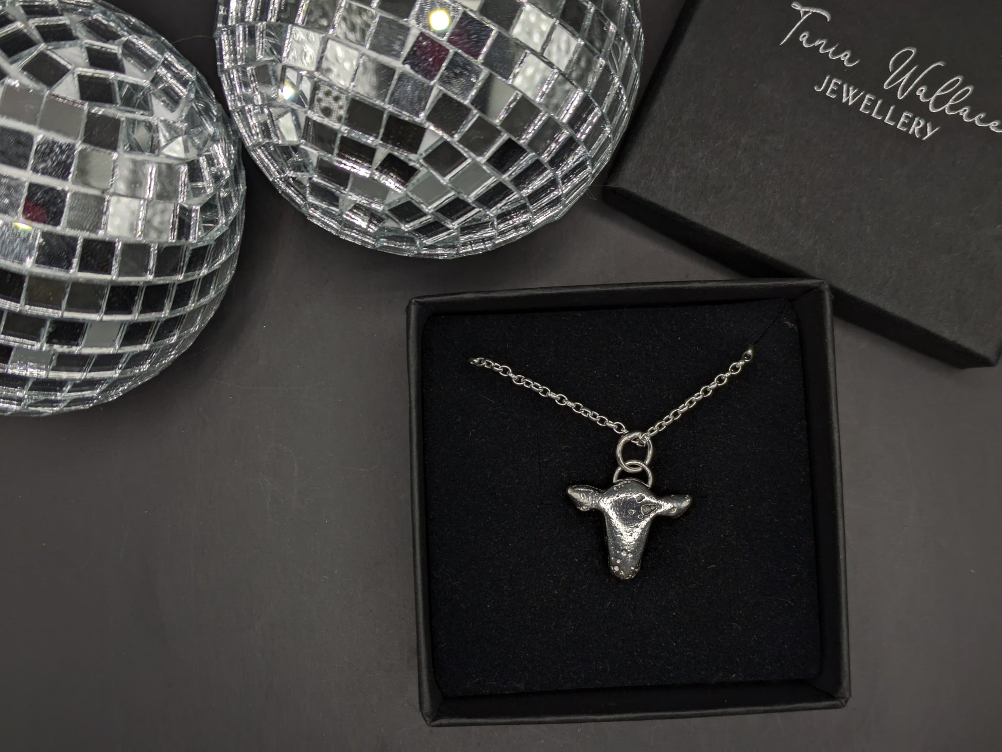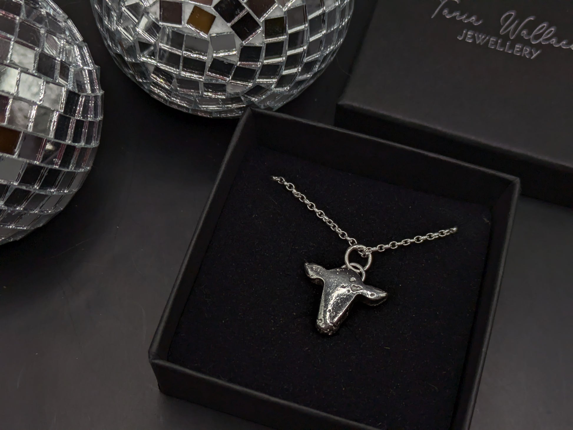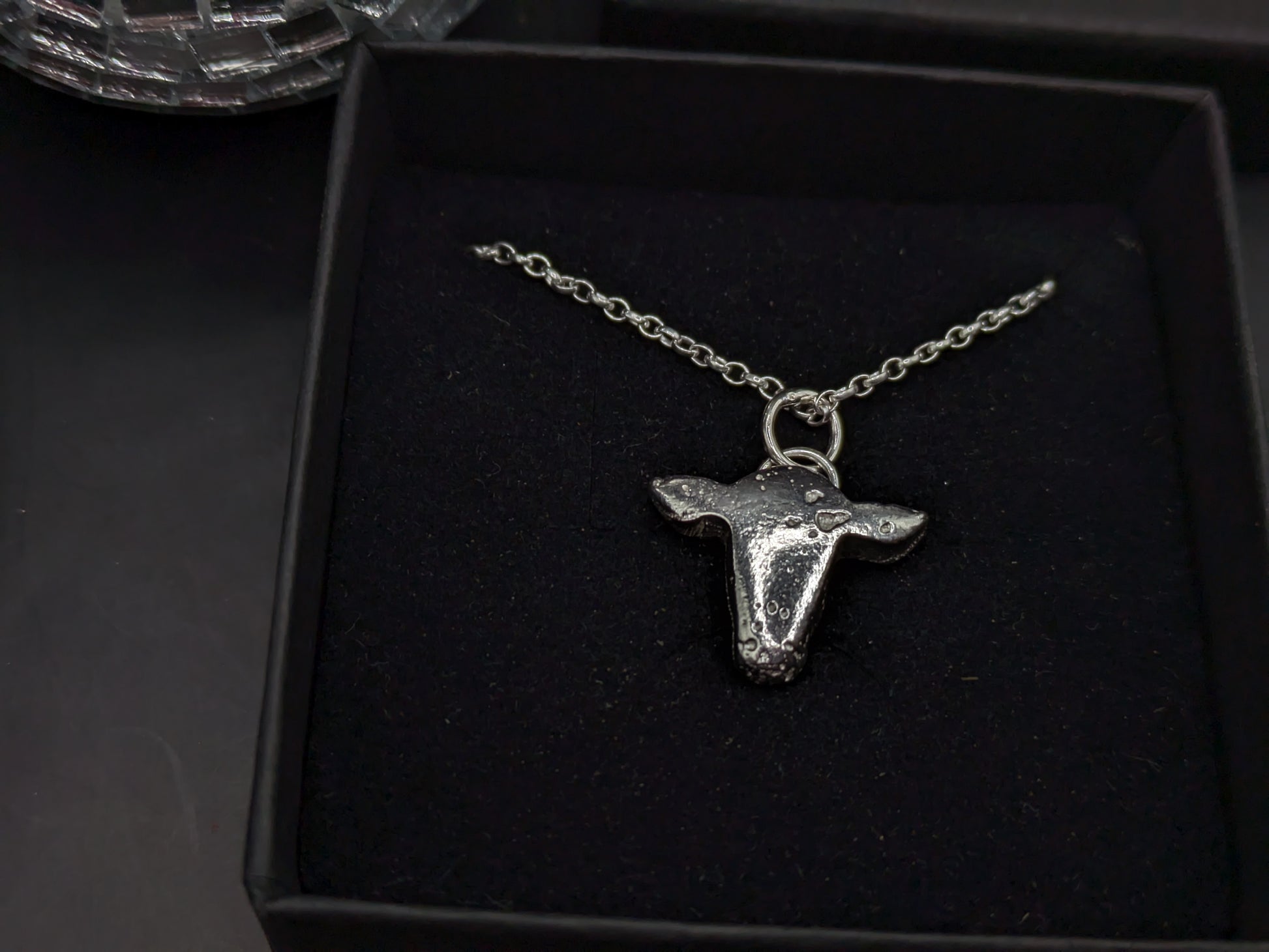 A one-off thick and chunky sand cast cow head shaped pendant.