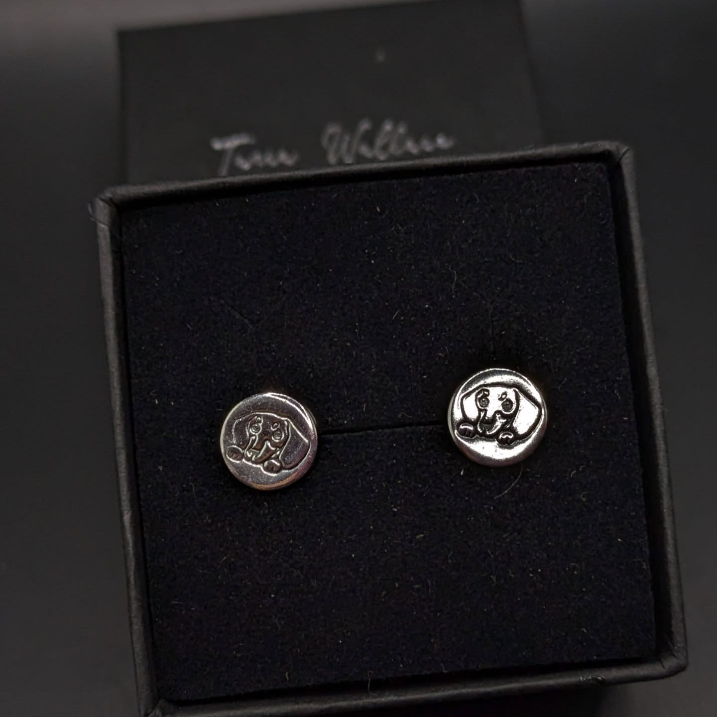Cute little round studs with hand stamped impression of a sausage dog. The studs come with the backs.
