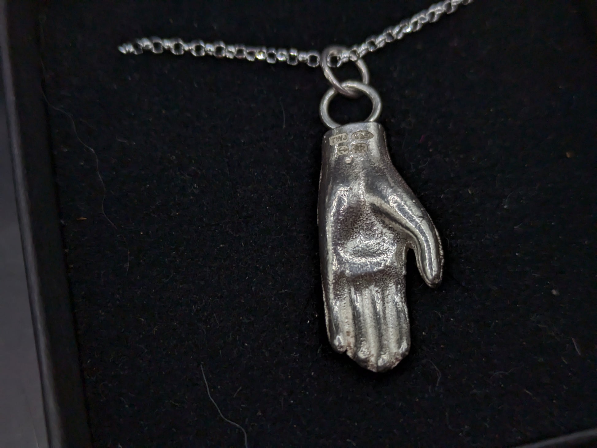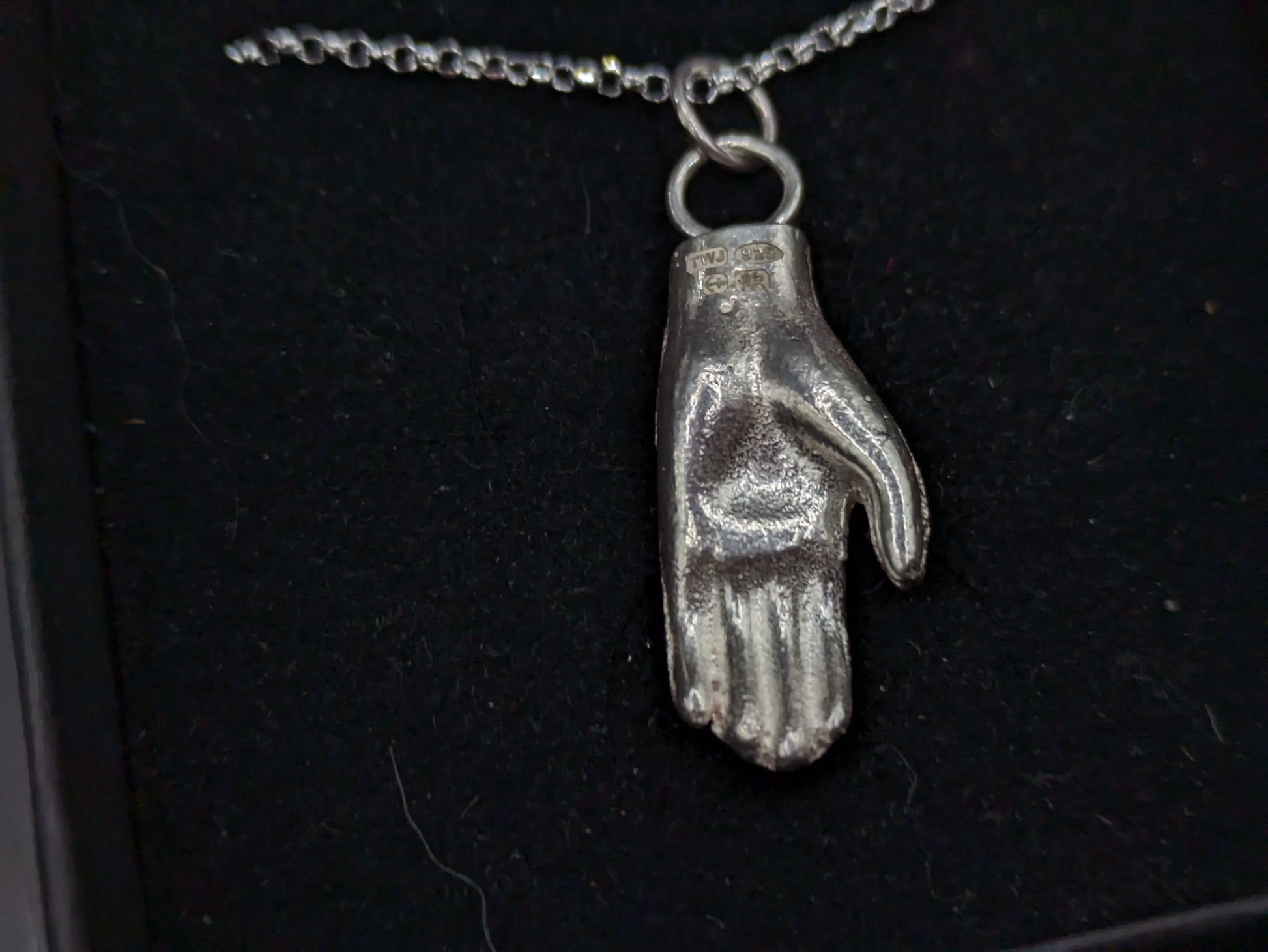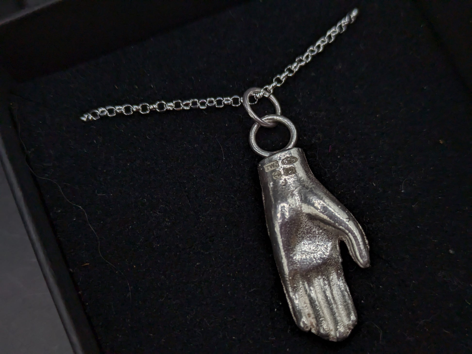 Sand cast solid silver pendant cast from the hand of a child's toy doll.